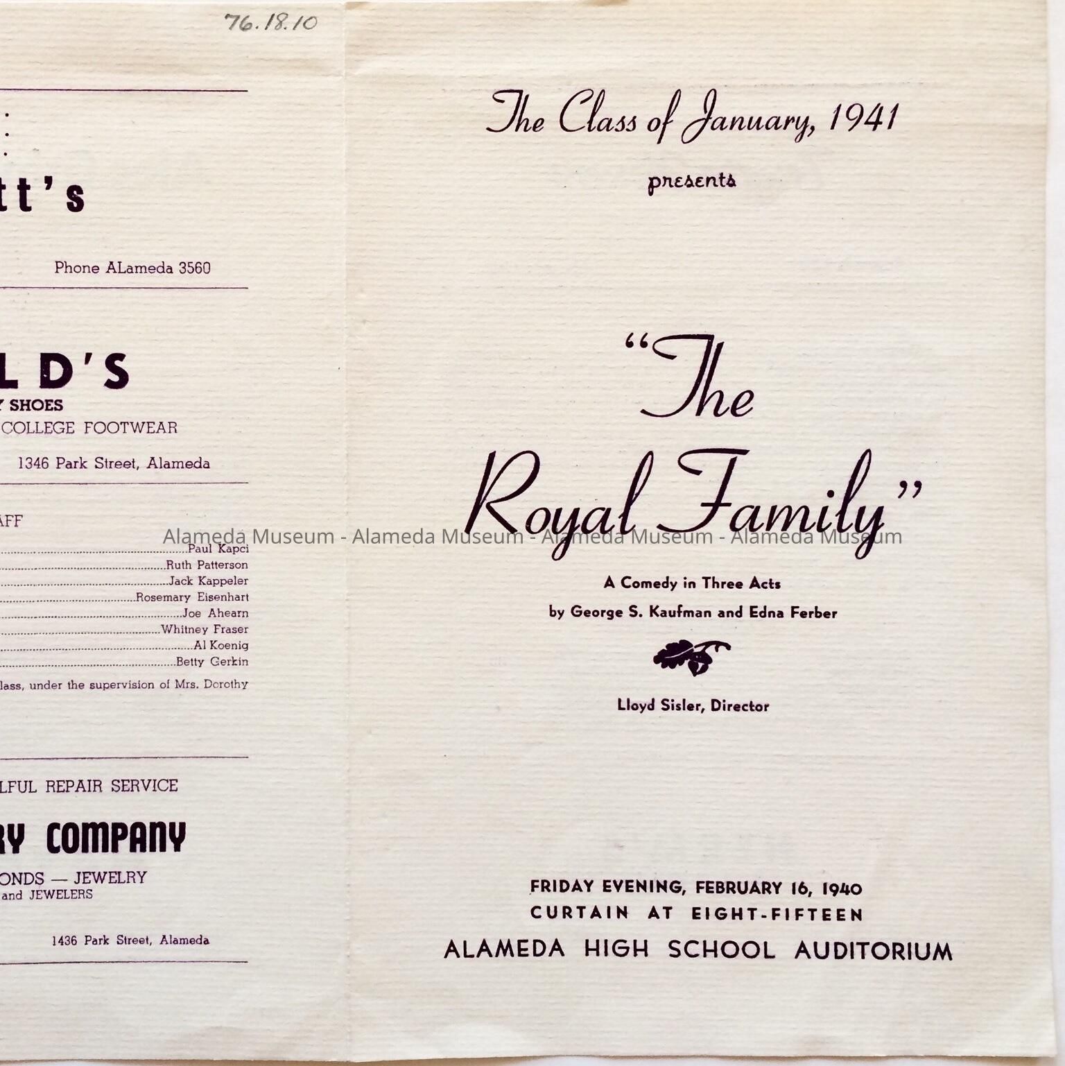 HISTORY OF OBJECT: THE CLASS OF ALAMEDA HIGH , JANUARY, 1941 PRESENTS THE PLAY "THE ROYAL FAMILY", FEB 16, 1940, IN THE ALAMEDA HIGH SCHOOL AUDITORIUM. PROGRAM CONTAINS LIST OF CAST AND STAFF.