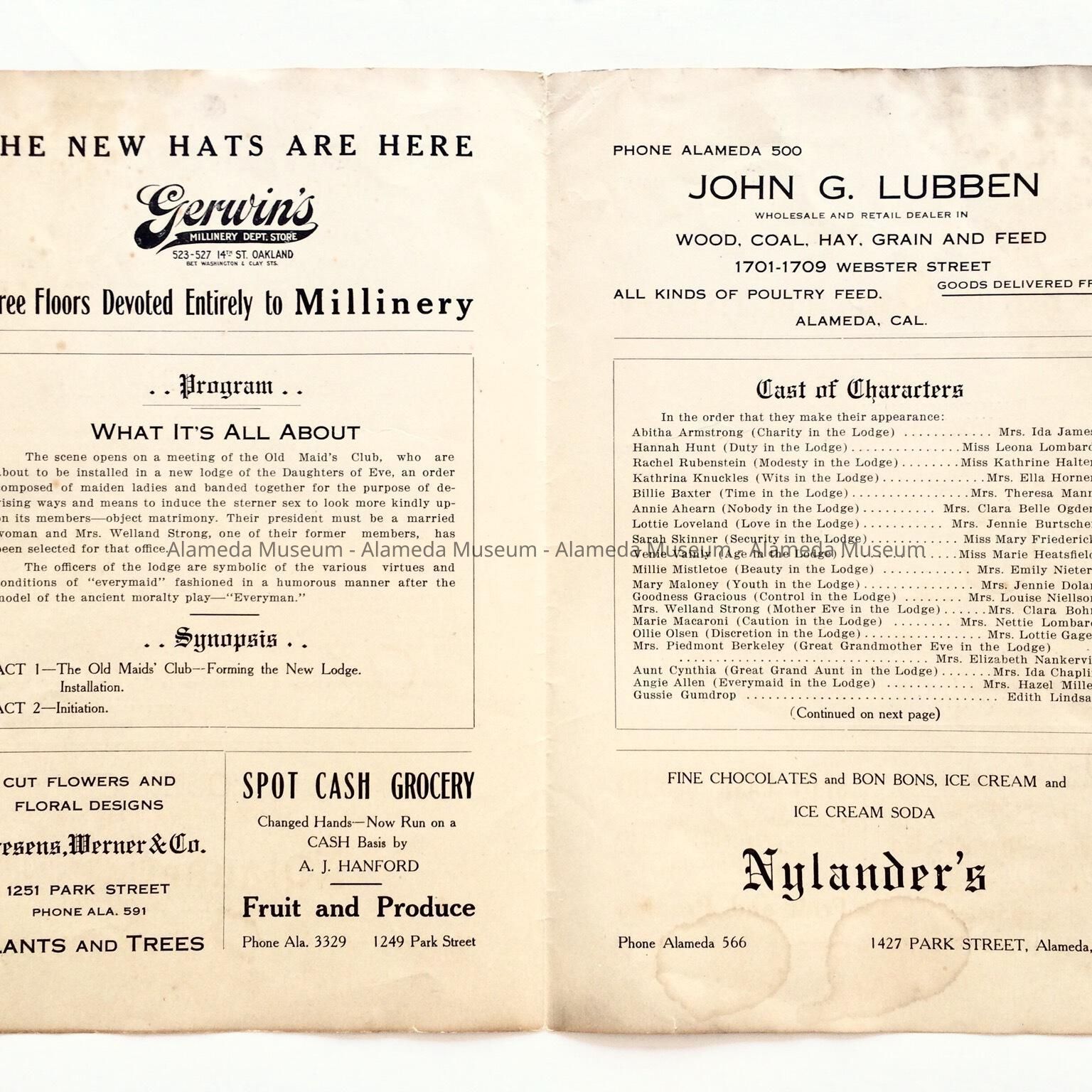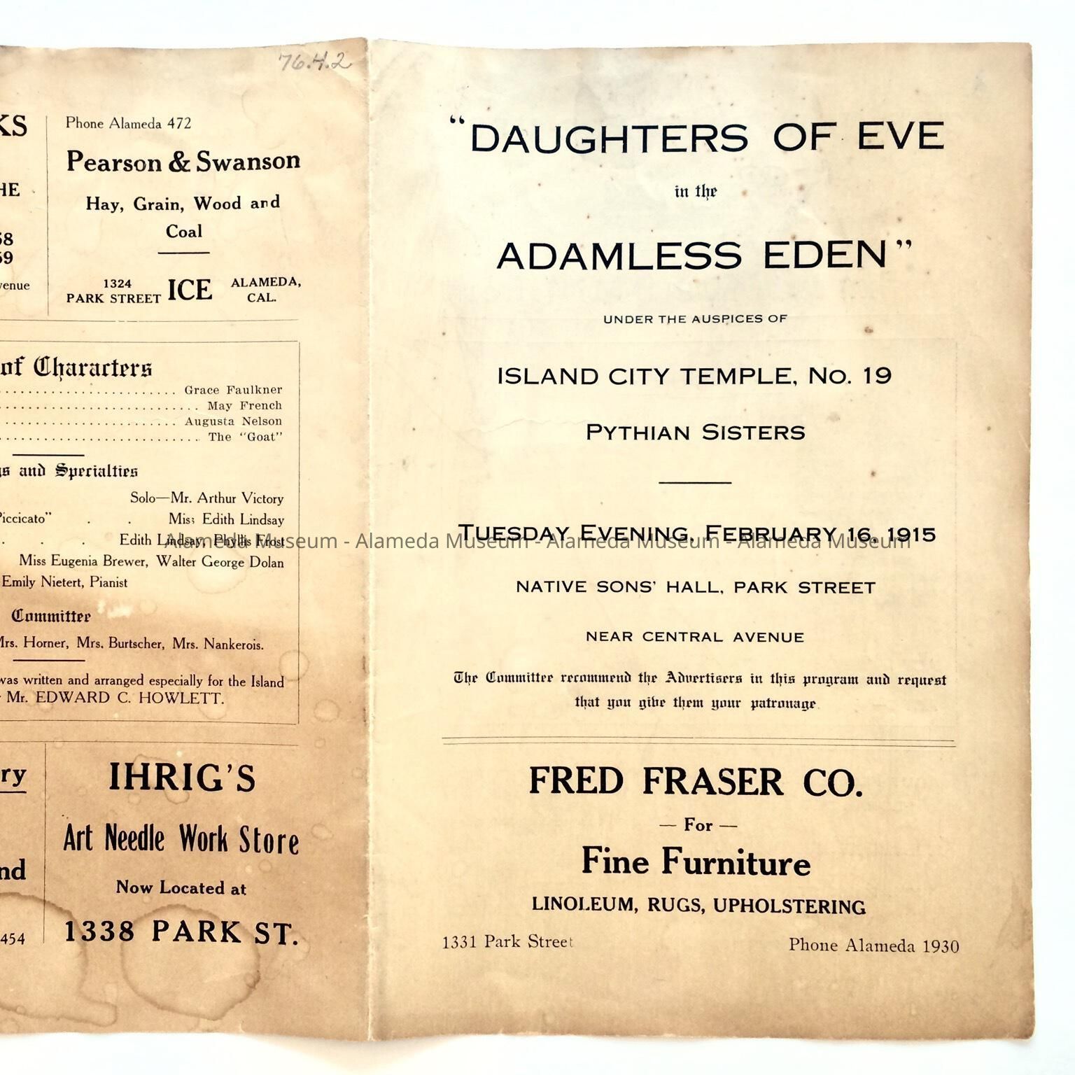HISTORY OF OBJECT: PLAY "DAUGHTERS OF EVE IN THE ADAMLESS EDEN", UNDER THE AUSPICES OF ISLAND CITY TEMPLE, NO. 19, PYTHIAN SISTERS, TUESDAY EVENING, FEB 16, 1915, NATIVE SONS HALL, PARK STREET. THE PROGRAM ALSO CONTAINS CAST OF CHARACTERS, SOME OLD NAMES OF ALAMEDA. AND BUSINESS ADVERTISEMENTS OF MERCHANTS DEFRAYING COST OF PRINTING PROGRAM.