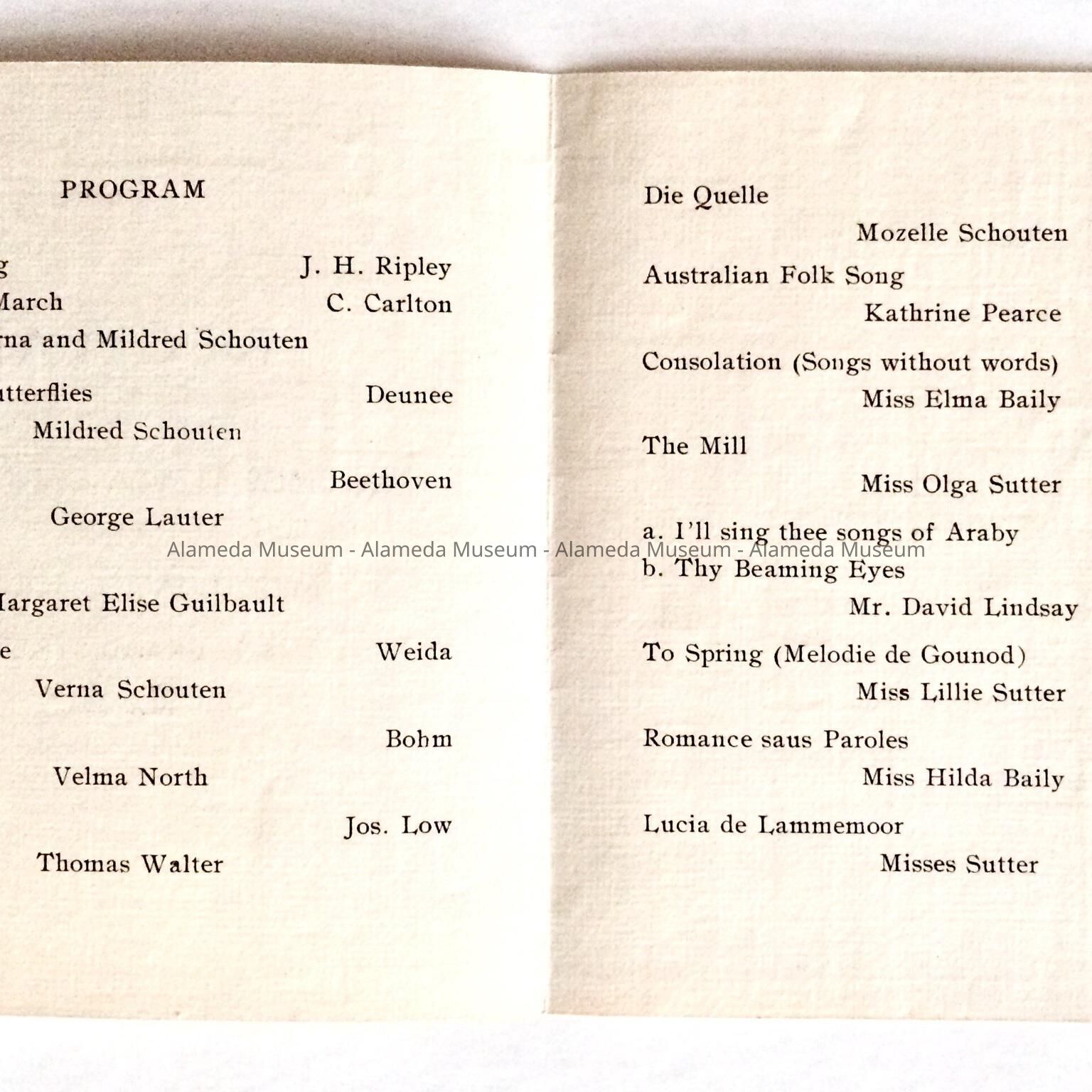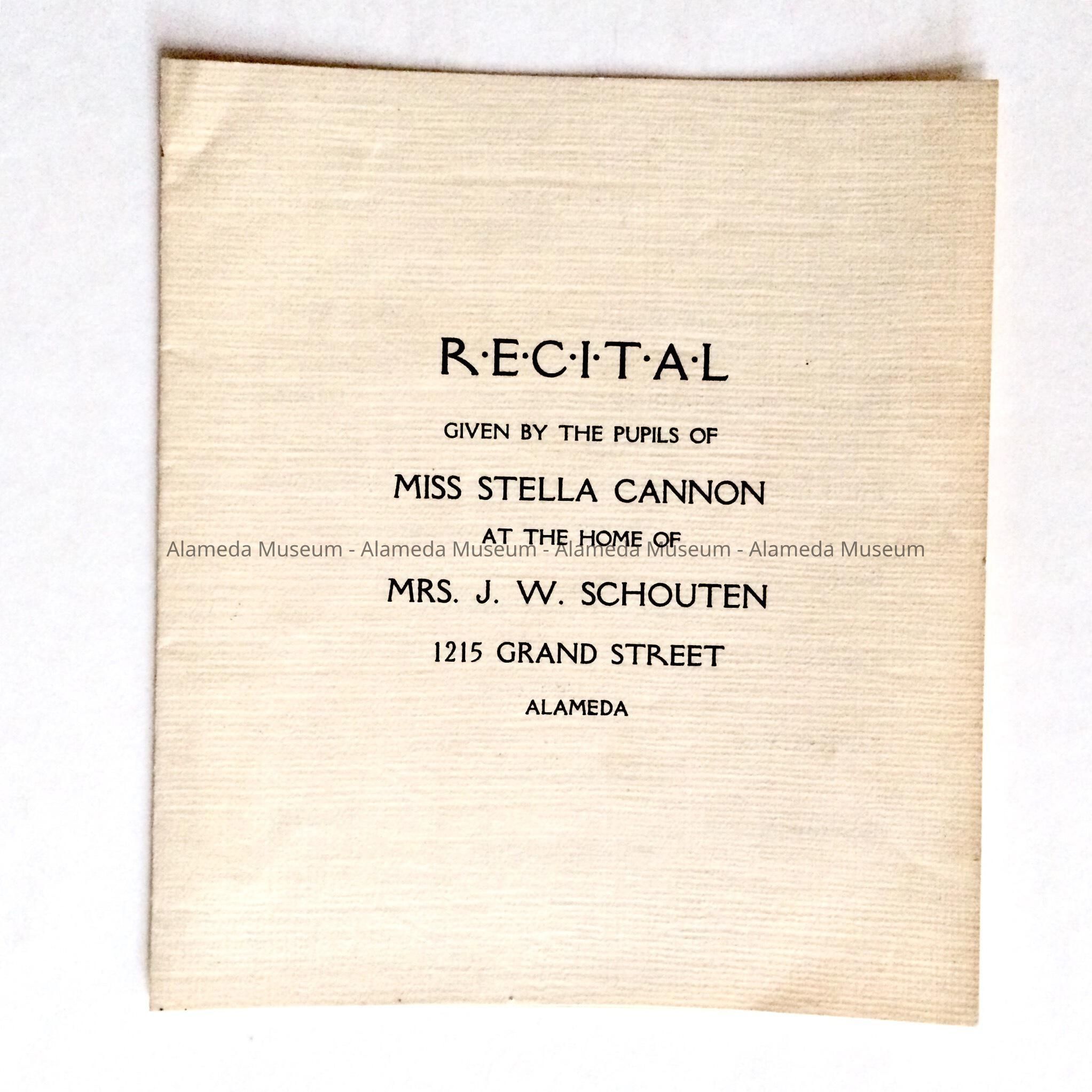 History of Object: Program for a recital given by the pupils of Miss. Stella Cannon at the home of Mrs. J. W. Schouten, 1215 Grand Street, Alameda, Among the performers were Verna, Mildred, and Mozelle, daughters of M/M John W. Schouten.