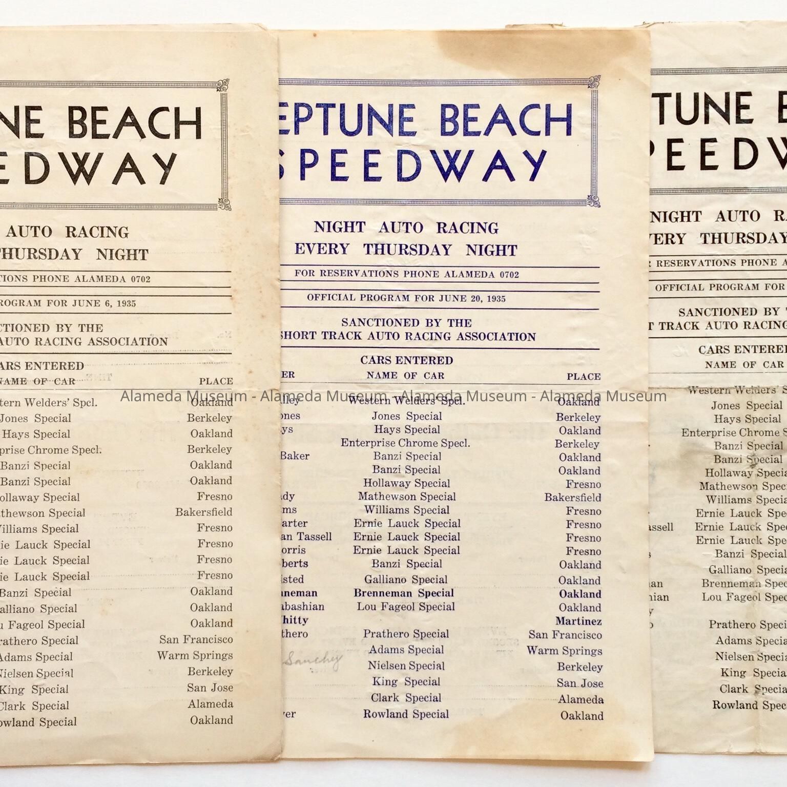 History of Object: Program style scorecards issued by Neptune Beach Speedway for June 6, 20, 27 1935.