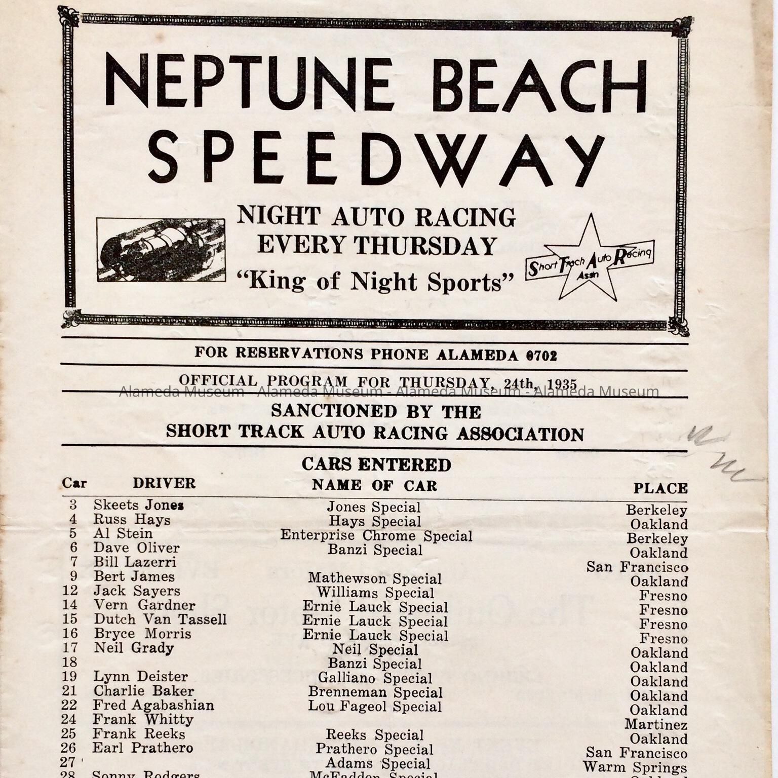 Program scorecard from Neptune Beach Speedway for 1935Entry/Object ID