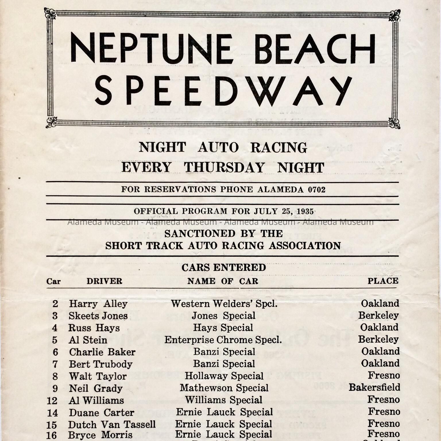 History of Object: Program scorecard of the Neptune Beach Speedway for July 25, 1935.