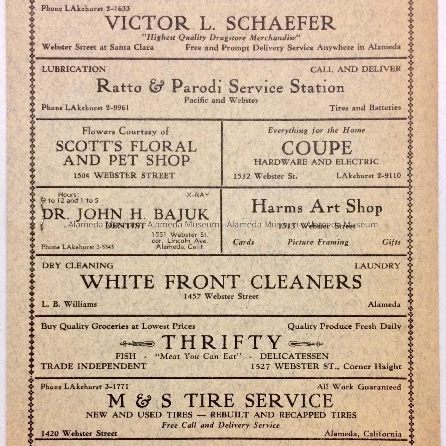 Description: four-page booklet printed on greenish-tan paper booklet with threads, with a light tan single-side printed half-page stapled inside. Front page has an image from a photo of a white building on it. Reverse has advertisements from local businesses.
