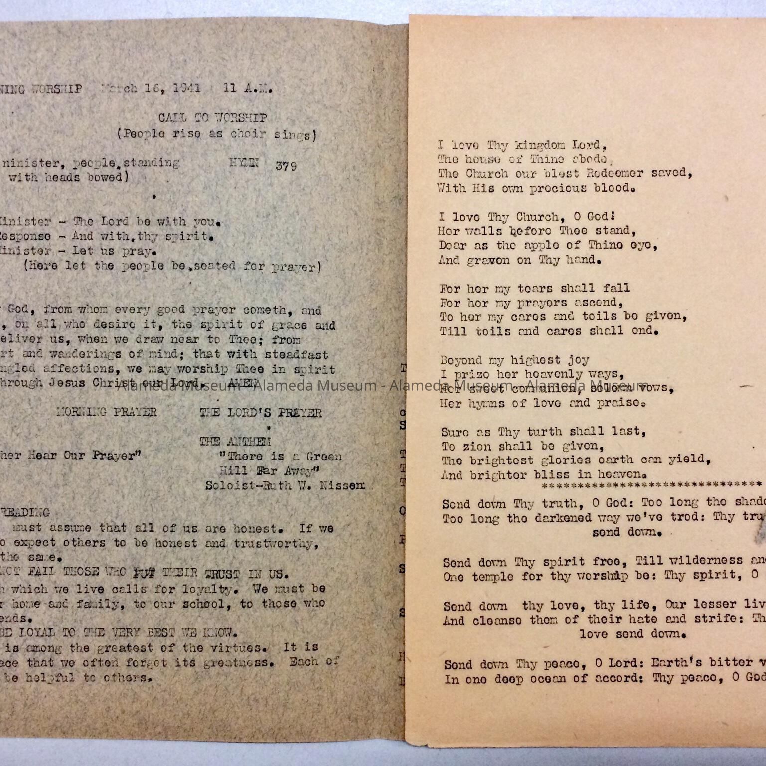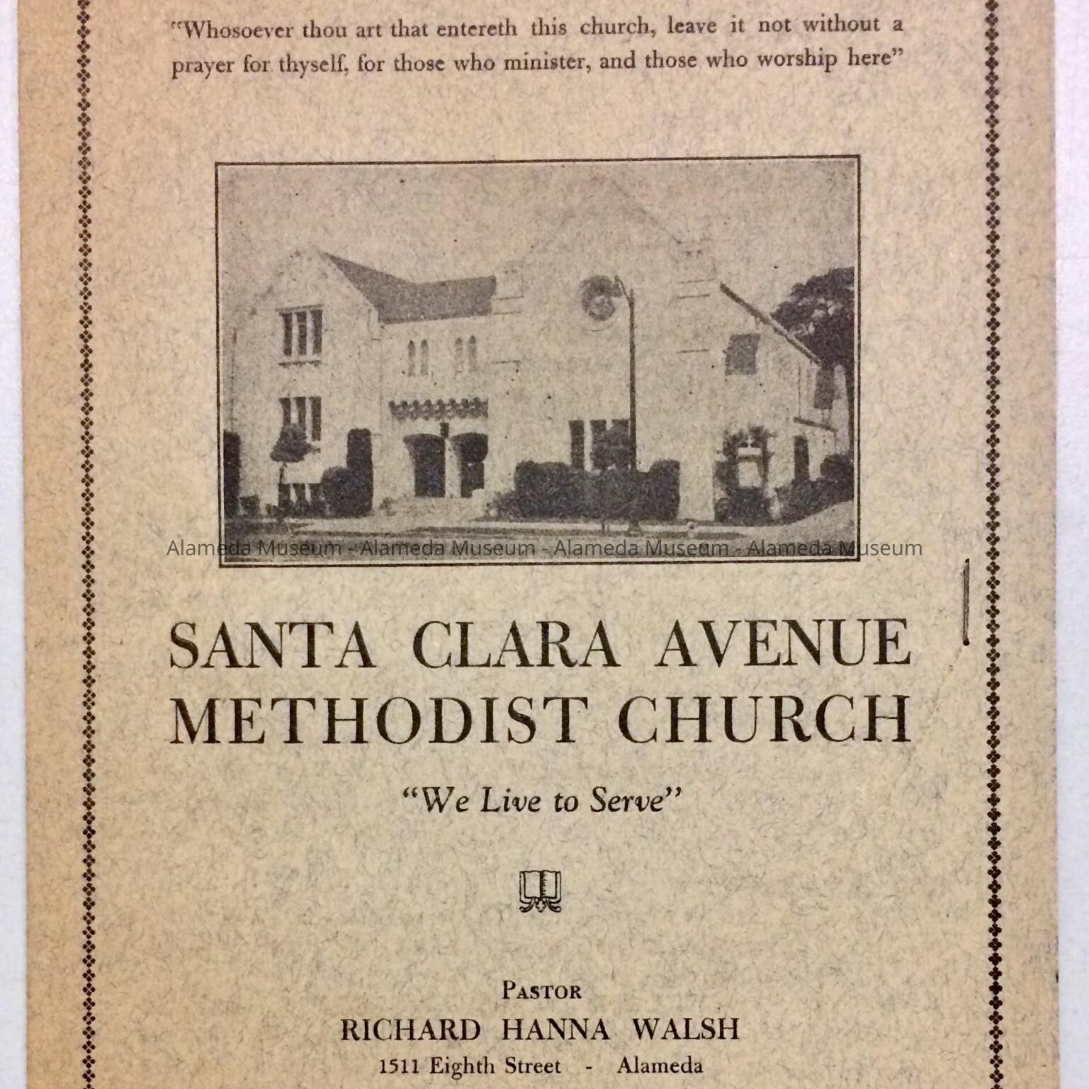 History: Program for service at the Santa Clara Avenue Methodist Church, also known as the West End Methodist Church, Pastor Richard Hanna Walsh, for March 16, 1941.