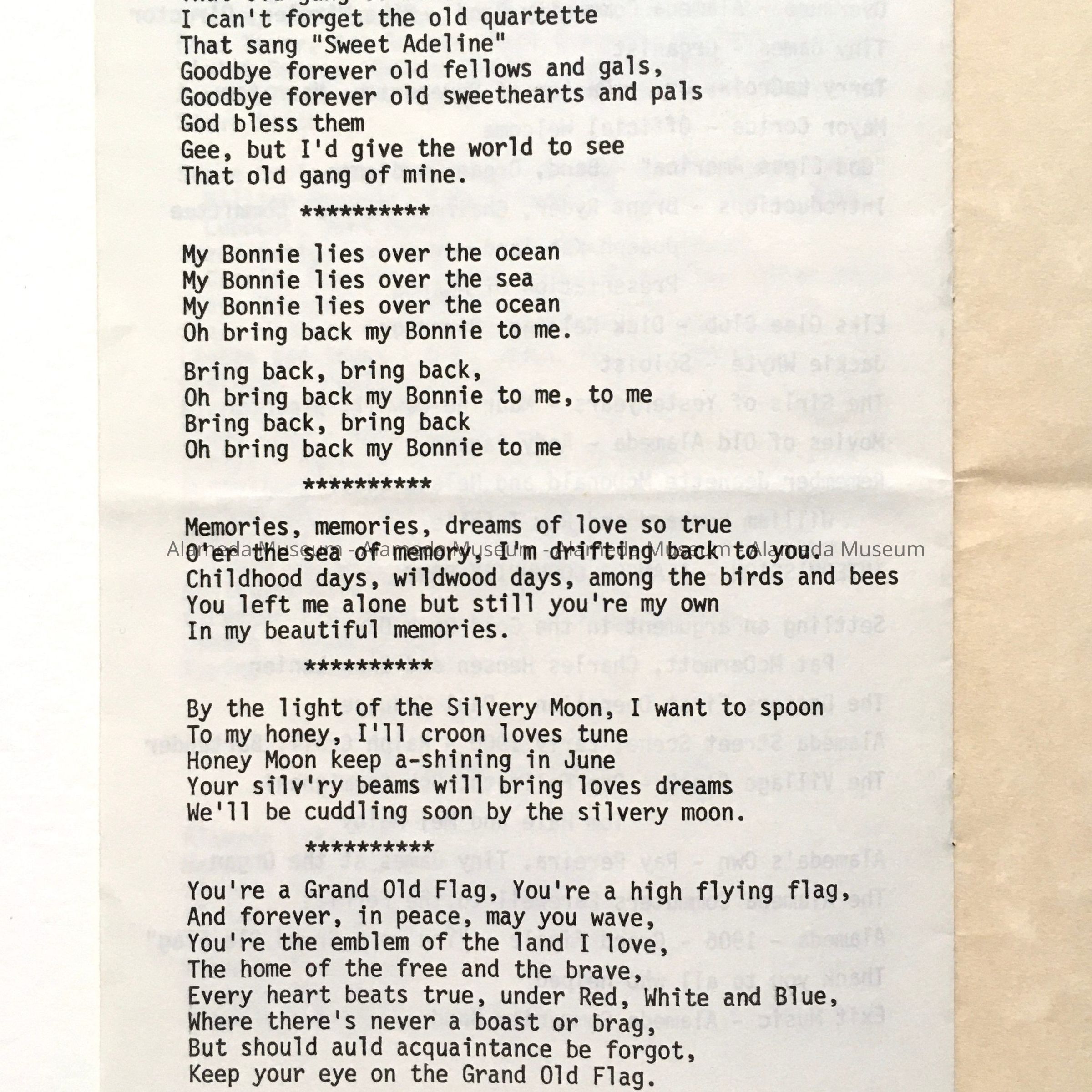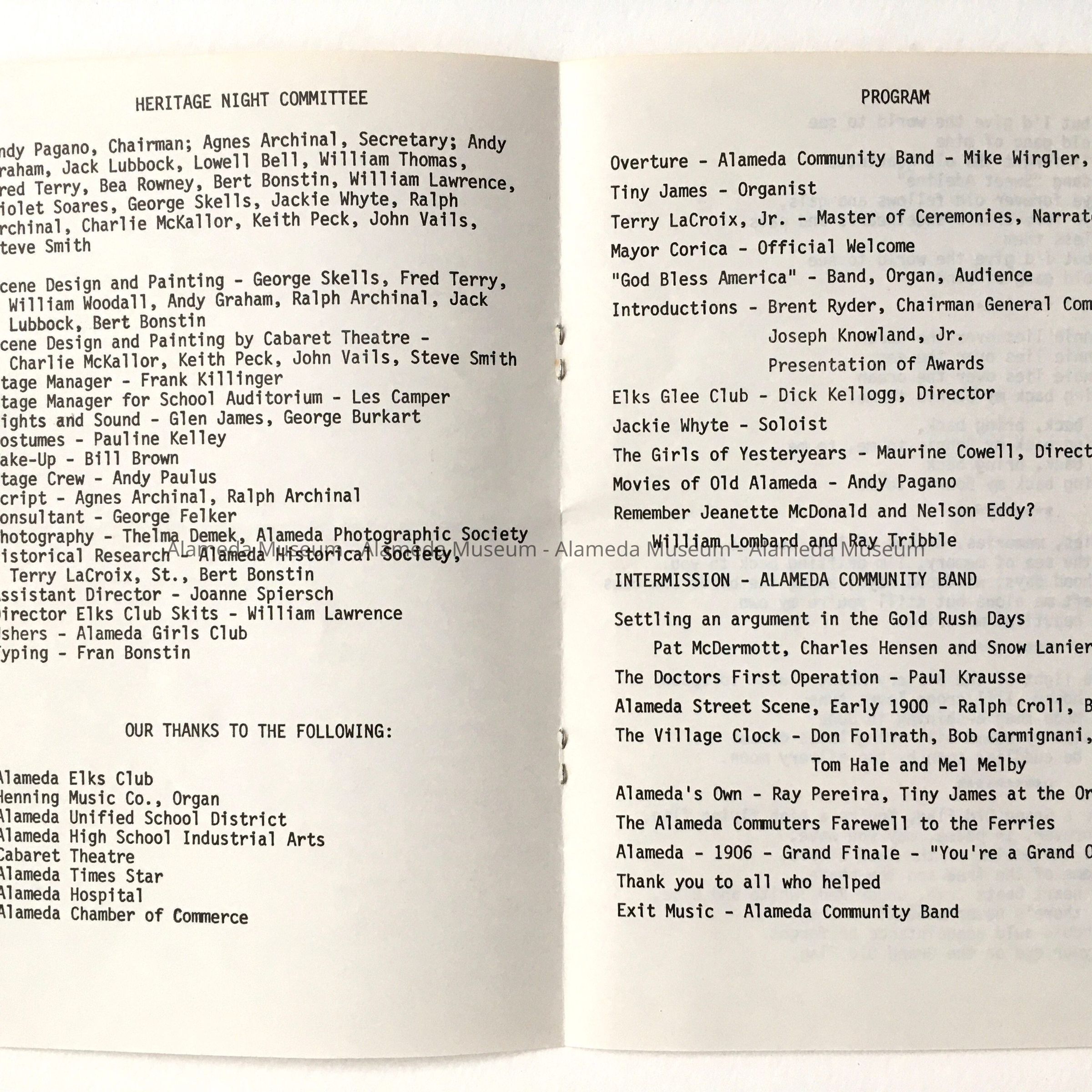 Program for the 15-act vaudeville show held June 9, 1978 as part of the Alameda Heritage Days Activities.