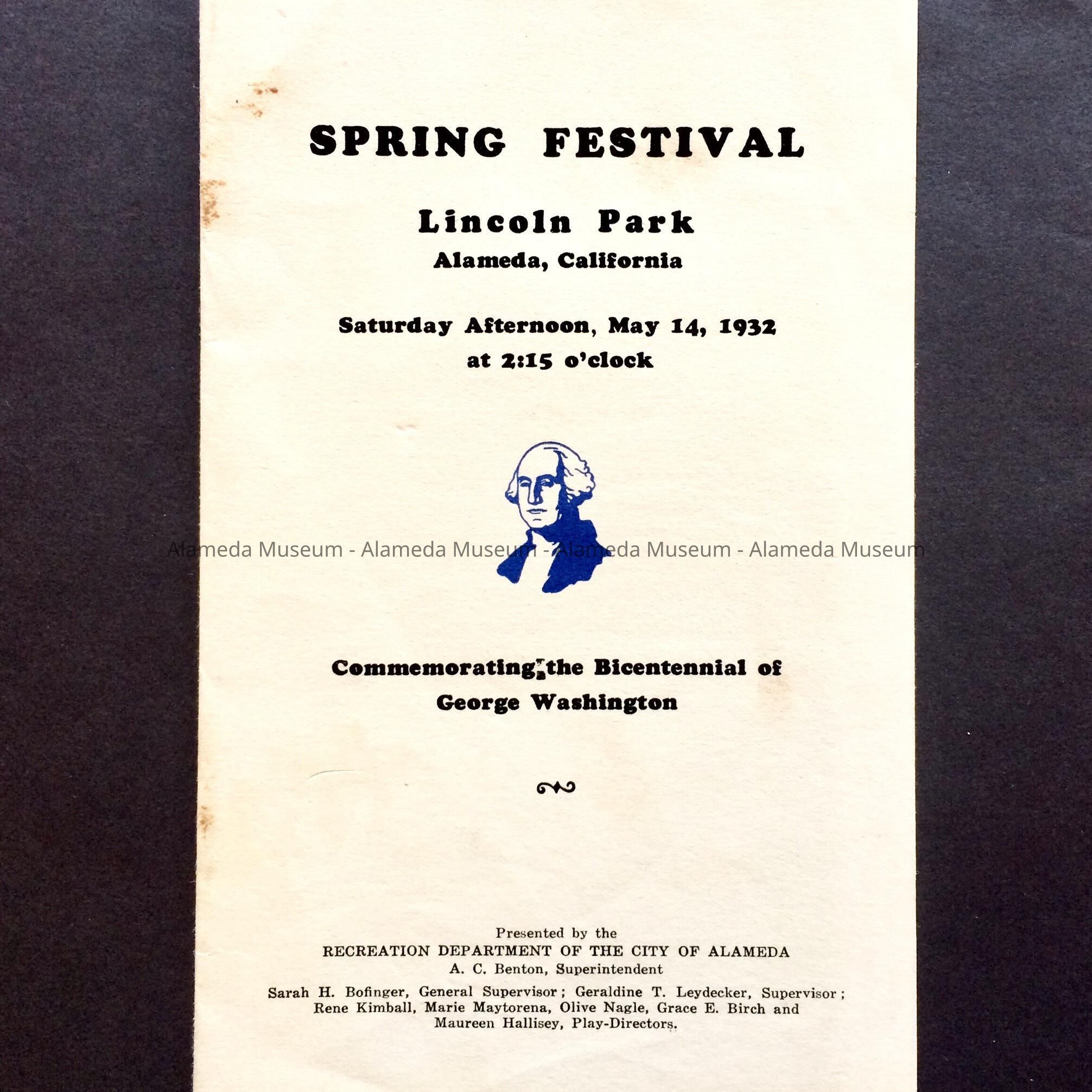 History of Object: Program for Spring Festival, Lincoln Park, May 14, 1932. Commemorating the Bicentennial of George Washington, presented by the Recreation Department of the City of Alameda, A. C. Benton, superintendent.