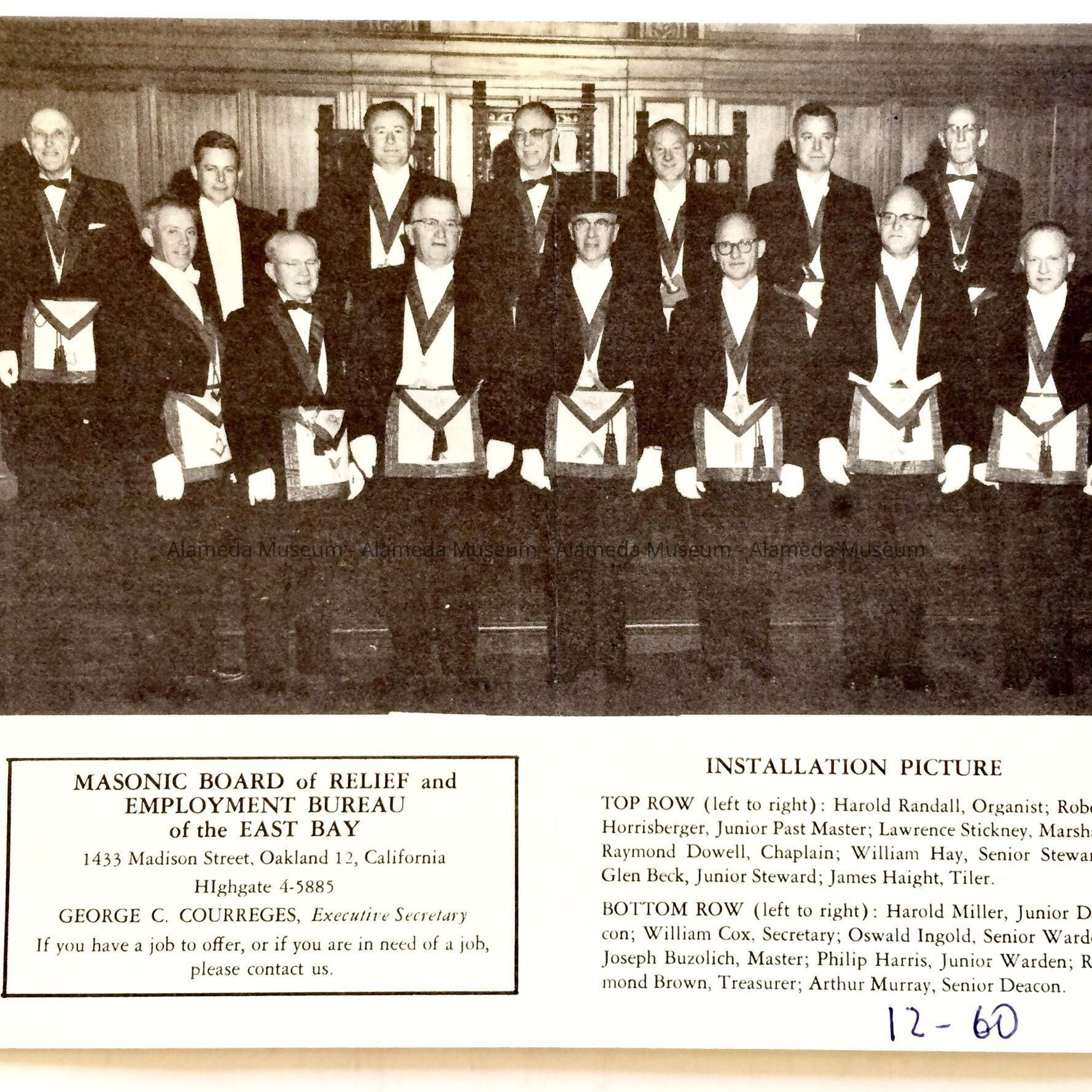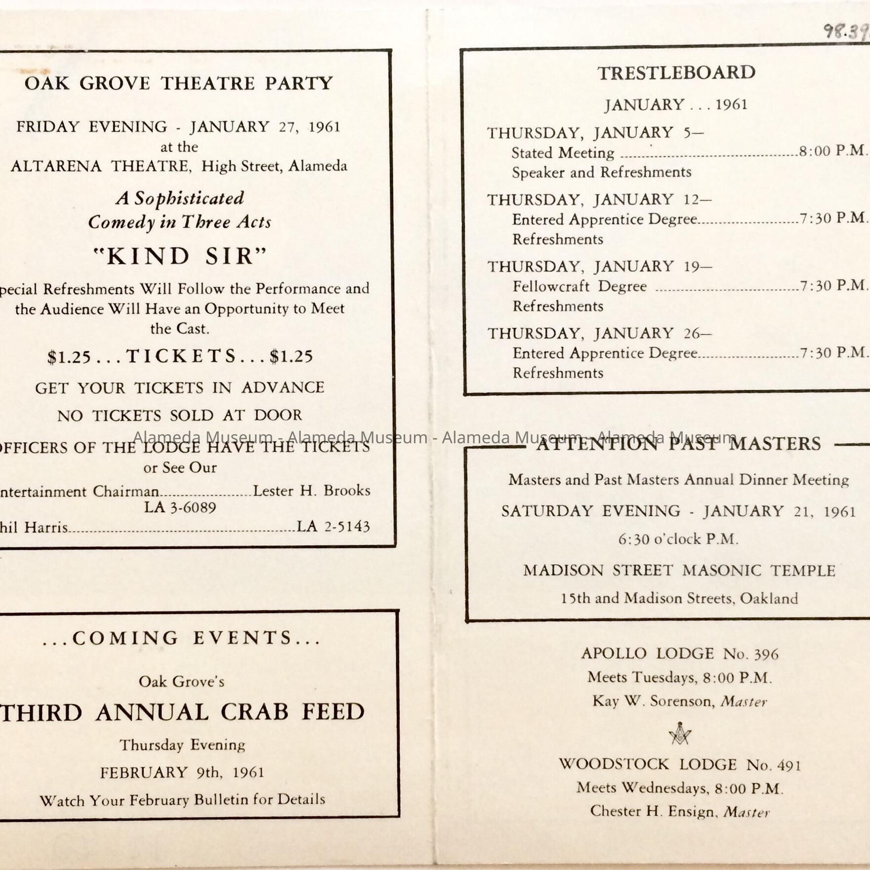 History of Object: Flyer announcing a theater party for the Oak Grove Masonic Lodge, Alameda. Production was entitled: "Kind Sir" and was produced by the Altarena Playhouse, High Street, on January 27, 1961.