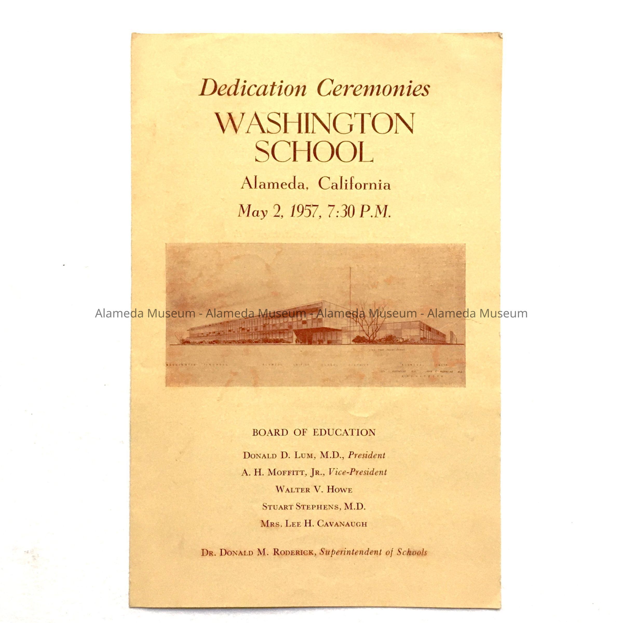 Description: program, one page folded, of tan paper with sepia printed information and a drawing of a building, titled 'Dedication Ceremonies / WASHINGTON SCHOOL / Alameda, California / May 2, 1957, 7:30 P.M.'