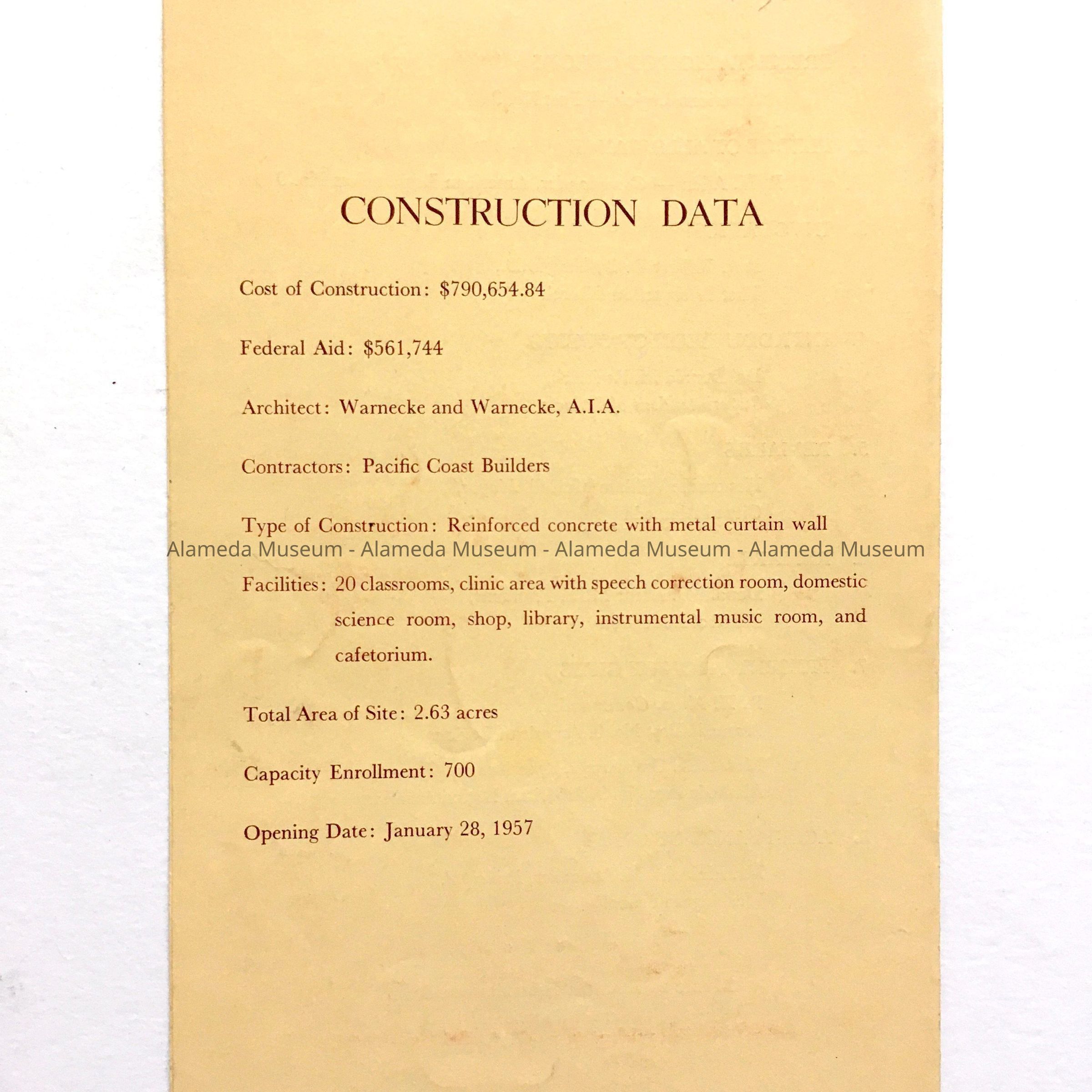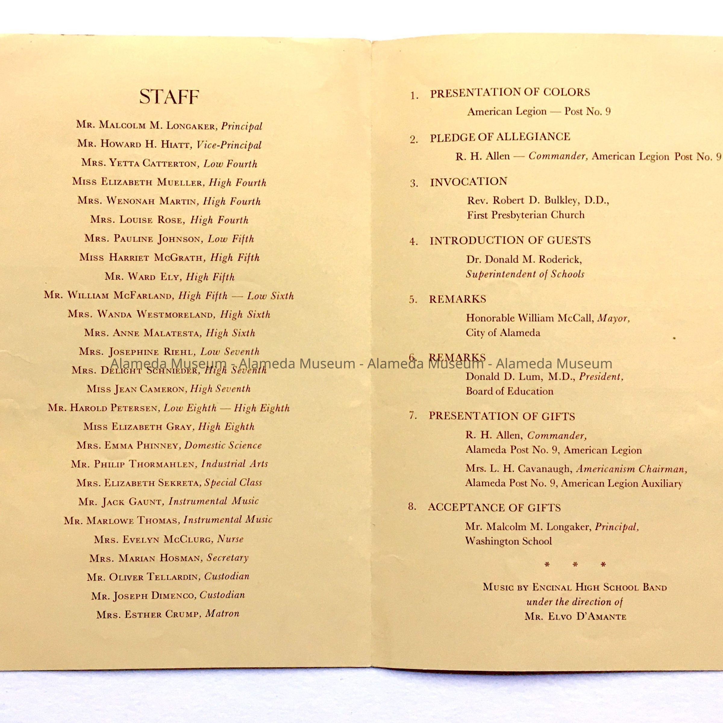 History of Object: Program for the dedication of the newly built Washington School building, a reinforced concrete building with metal curtain wall, Opening Date: January 28, 1957, enrollment 700. President Board of Education: Donald Lum; Superintendent of Schools: D. M. Roderick; Washington School President: Malcolm M. Longaker. Construction Data on the back states Architect was Warnecke and Warnecke, A.I.A; builders were Pacific Coast Builders.