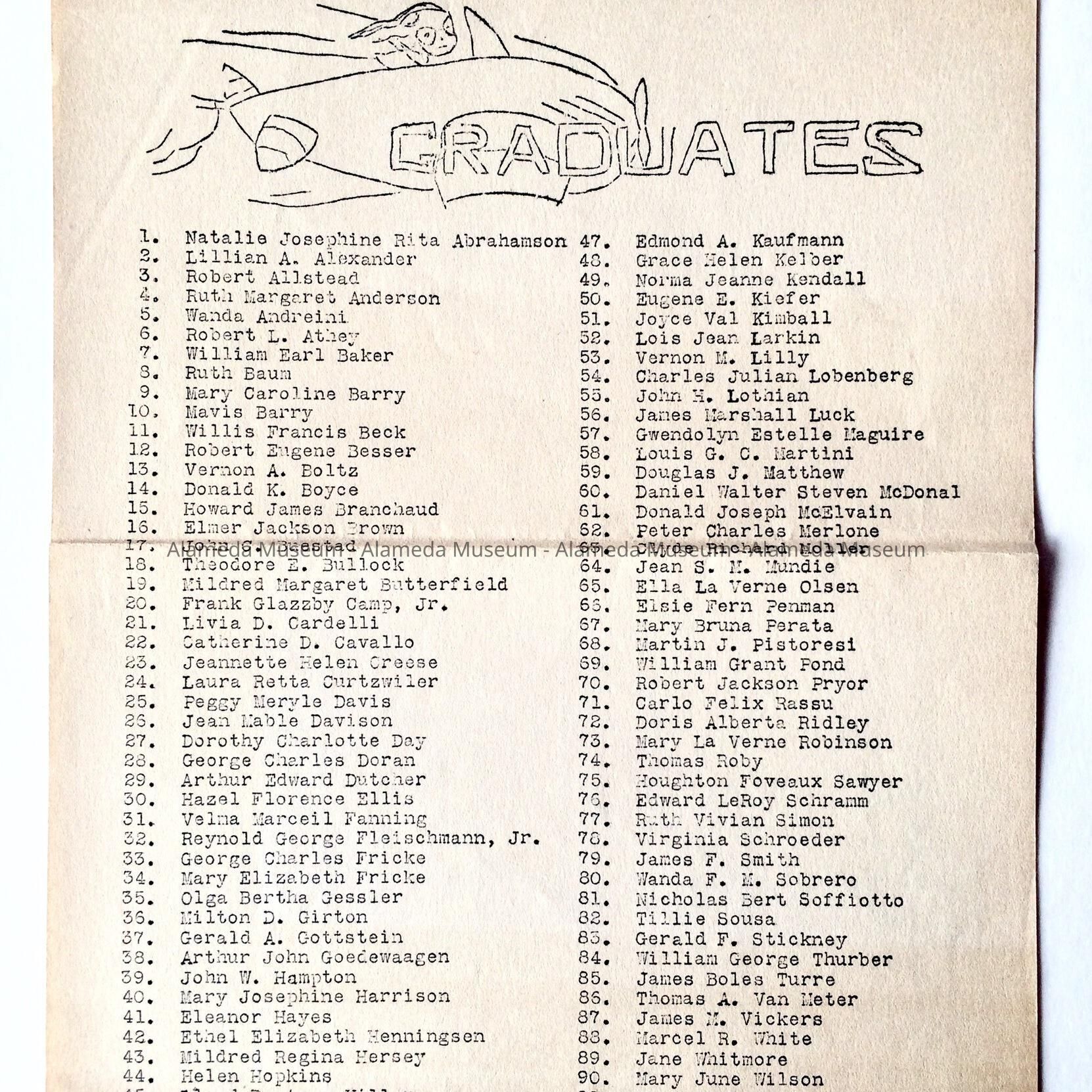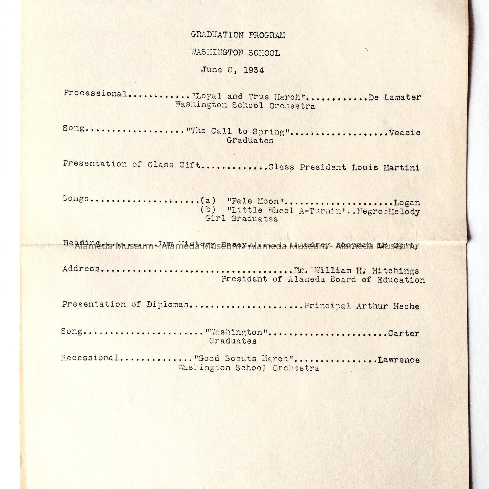 Program for the graduation ceremony for Washington School for June 8, 1934. Contents include list of graduates.