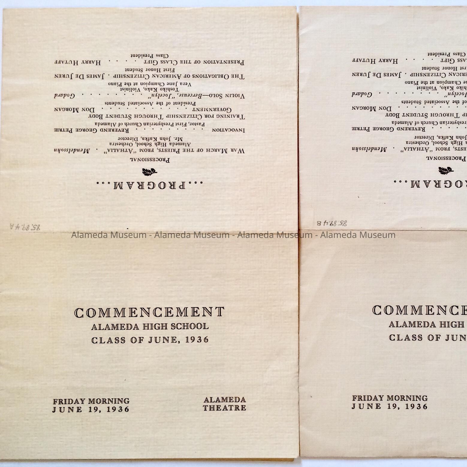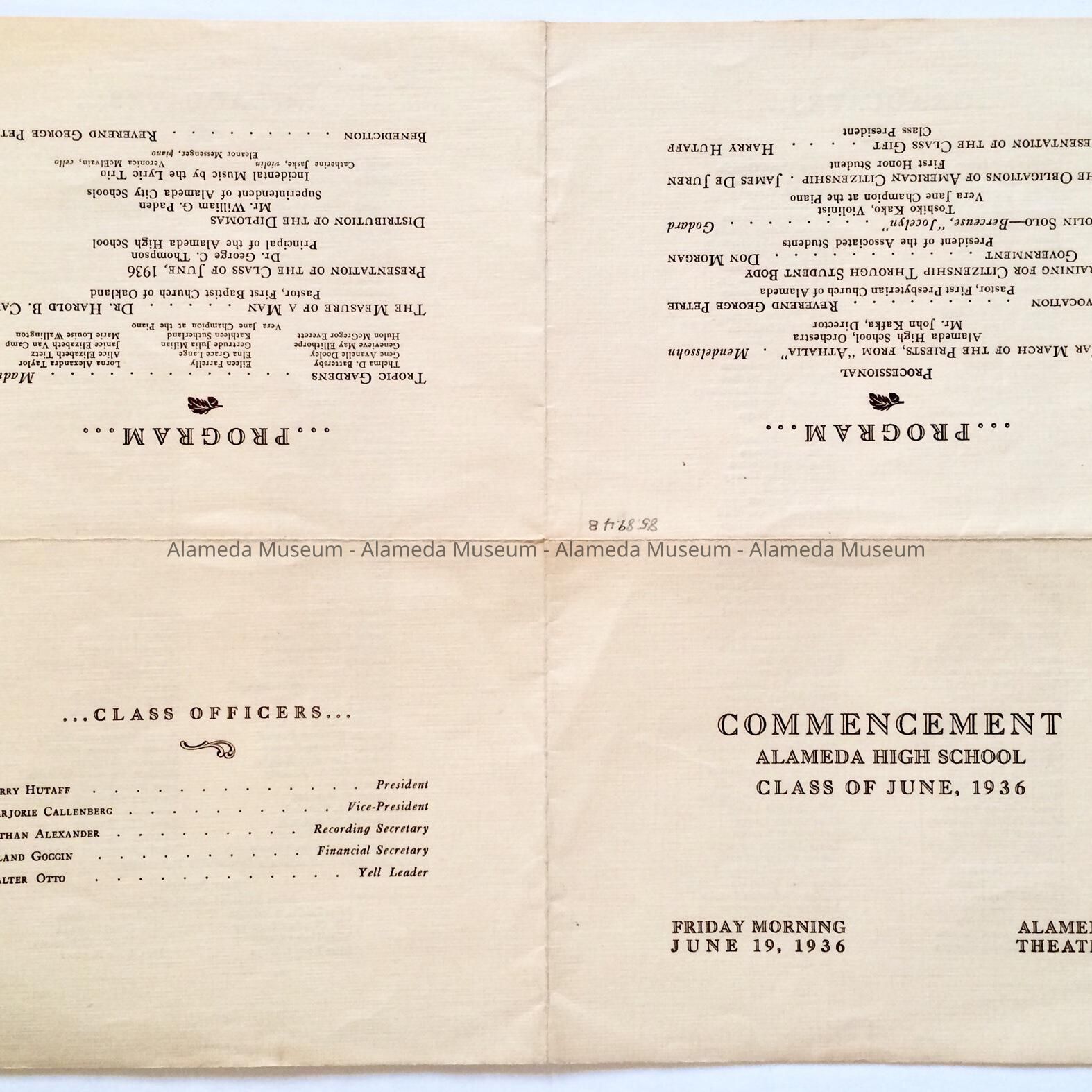 Program- Commencement, Alameda High School, Class of June, 1936. Held on Friday morning, June 19, 1936 at the Alameda Theatre.