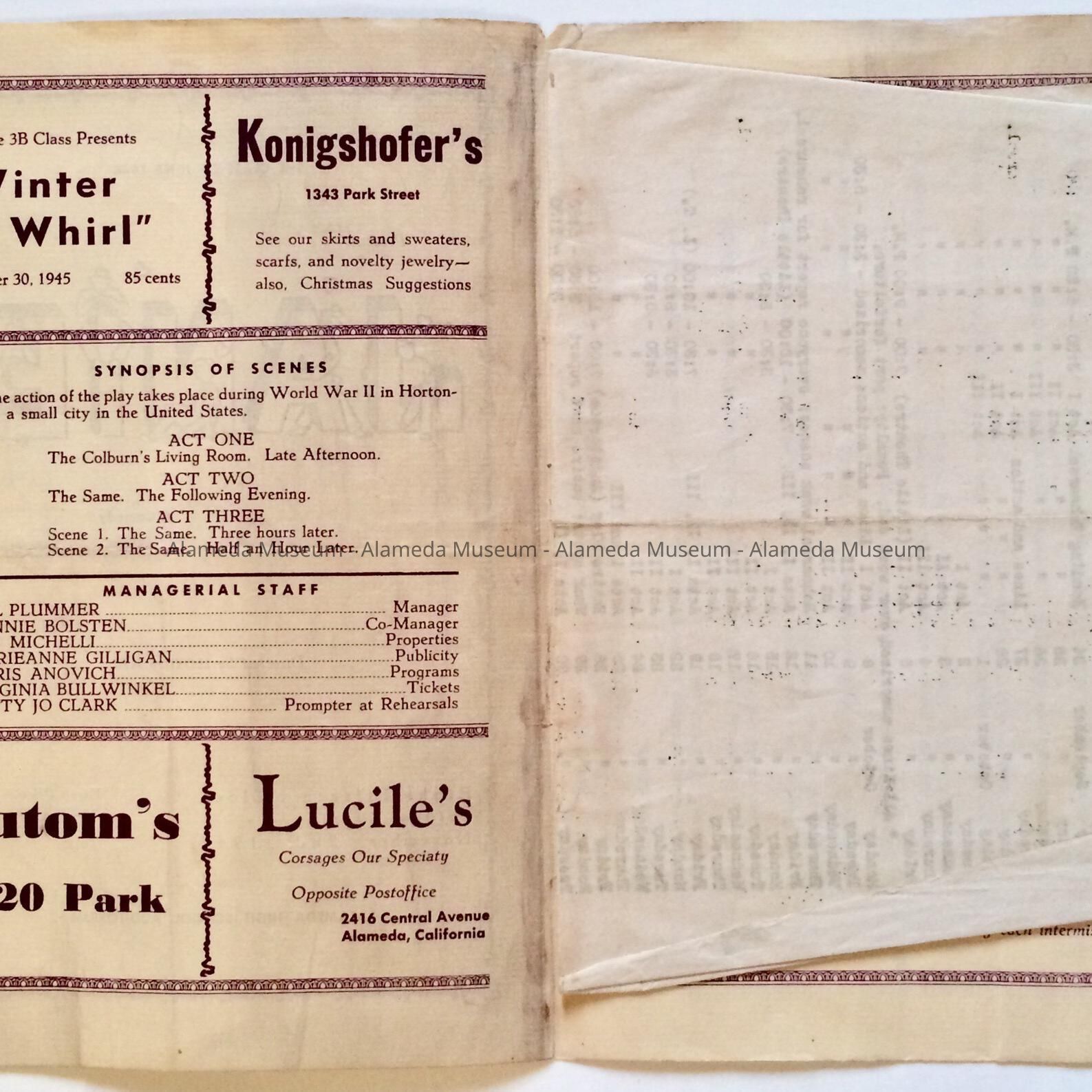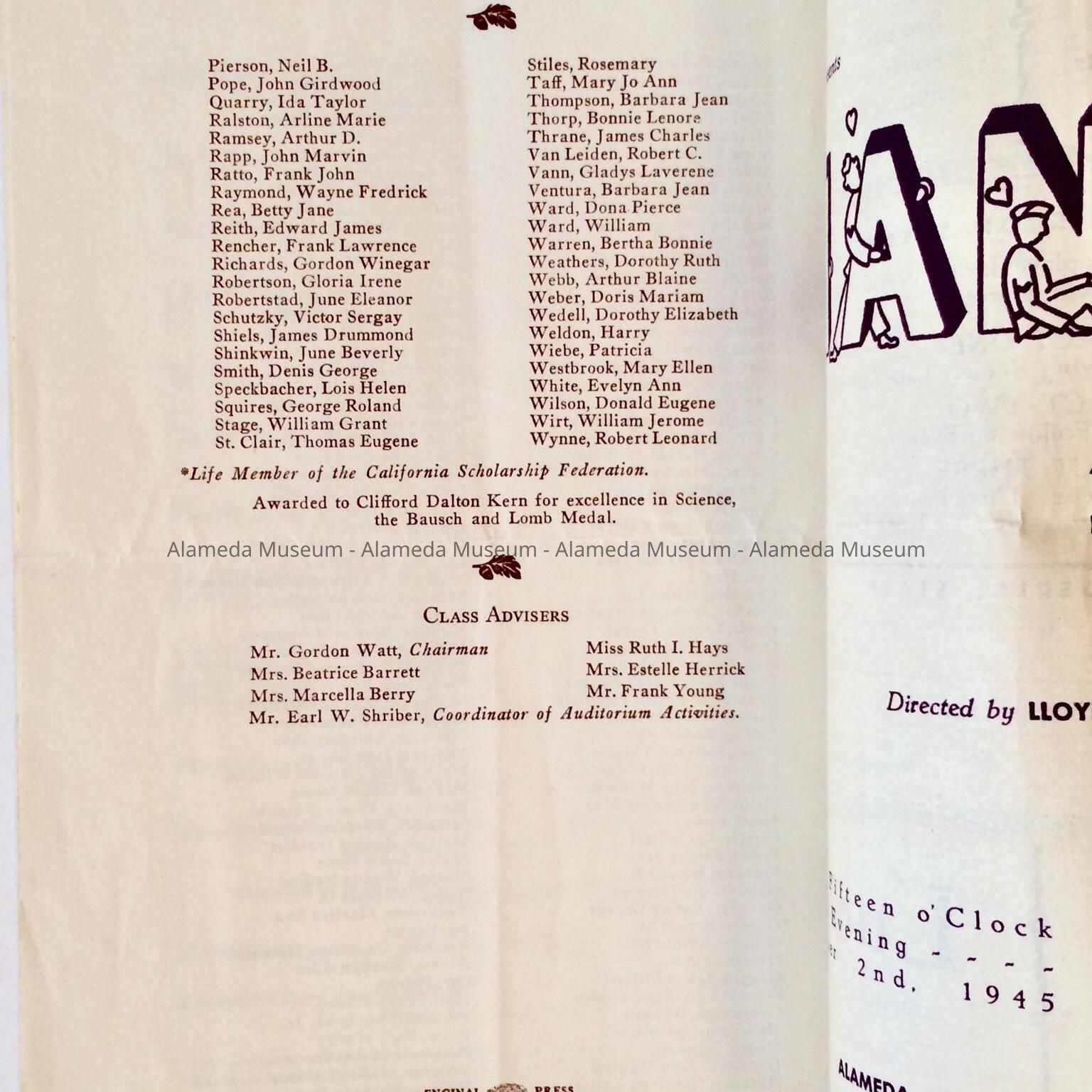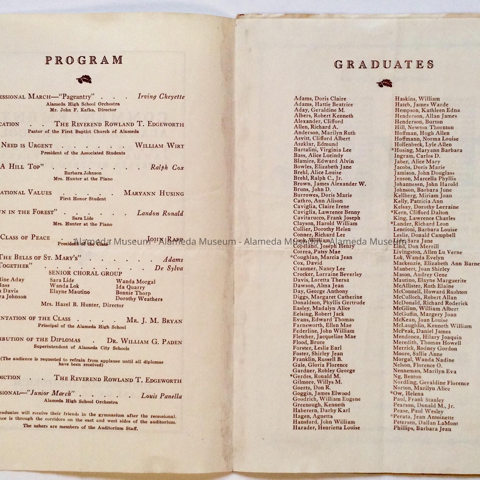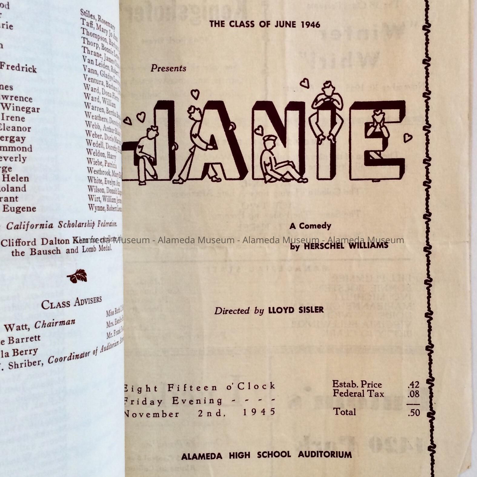 Program listing graduates for commencement exercises, Alameda High School, January 31, 1946. Also attached to the program is a program for the class of June 1946 play entitled, “Janie”.