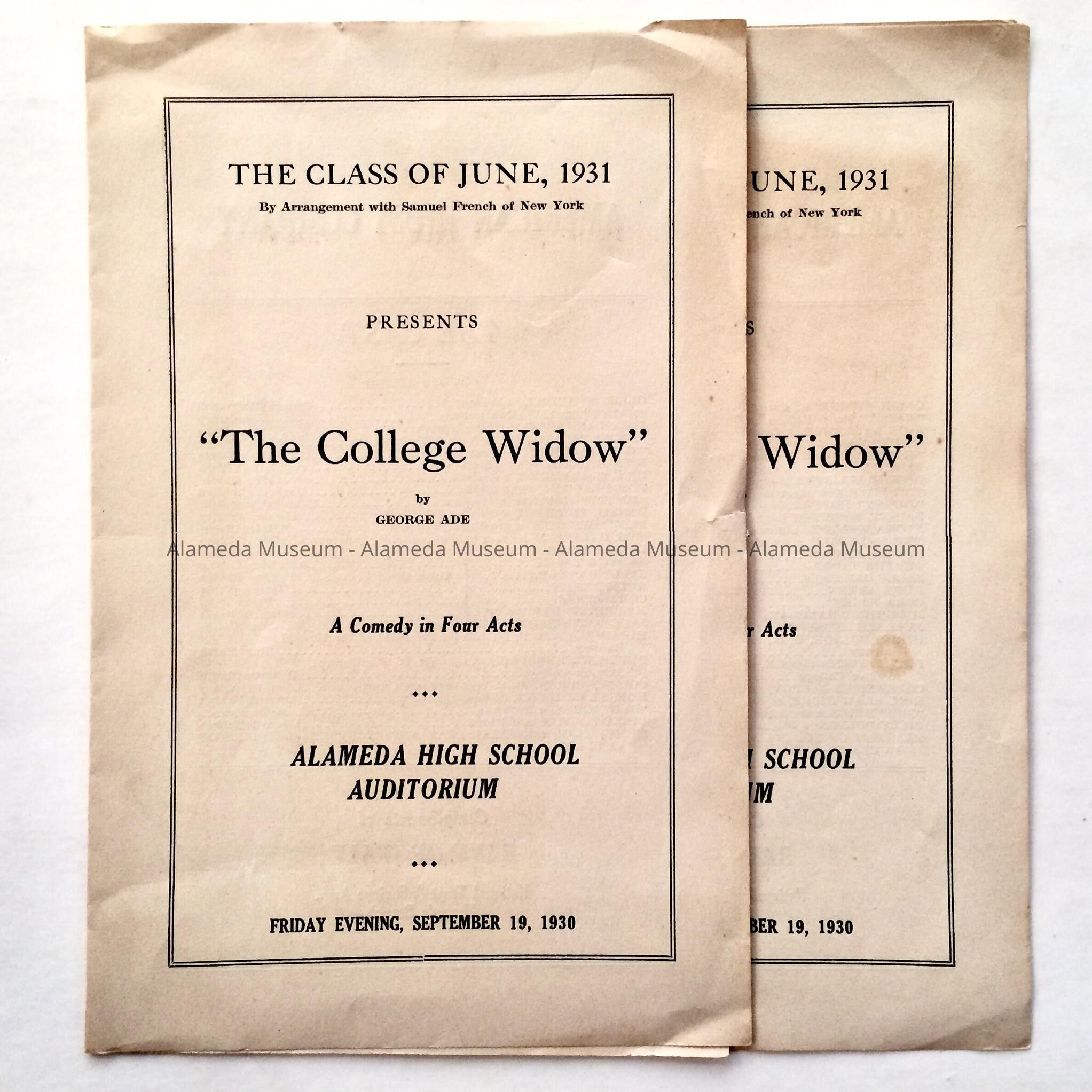 PROGRAMS FOR THE CLASS OF JUNE 1931. "THE COLLEGE WIDOW" WAS PERFORMED IN THE ALAMEDA HIGH SCHOOL AUDITORIUM ON SEPTEMBER 19, 1930.