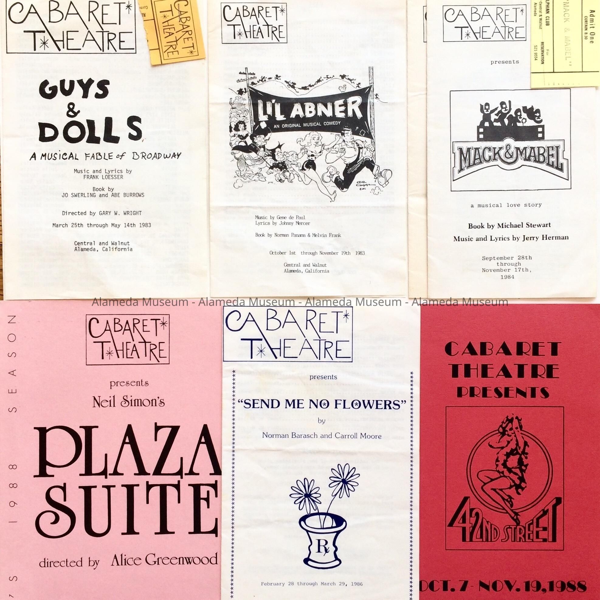 COLLECTION OF CABARET THEATRE PROGRAMS, CENTRAL AND WALNUT STREETS, ALAMEDA, CALIFORNIA. INCLUDED THE FOLLOWING PRODUCTIONS: "GUYS AND DOLLS"