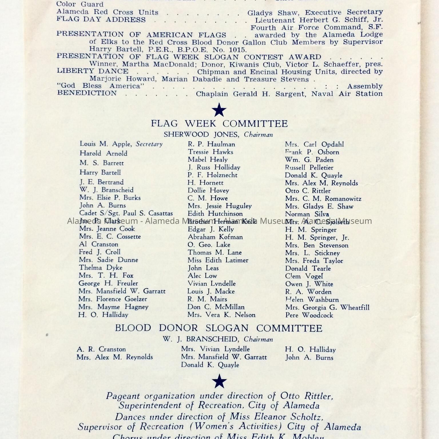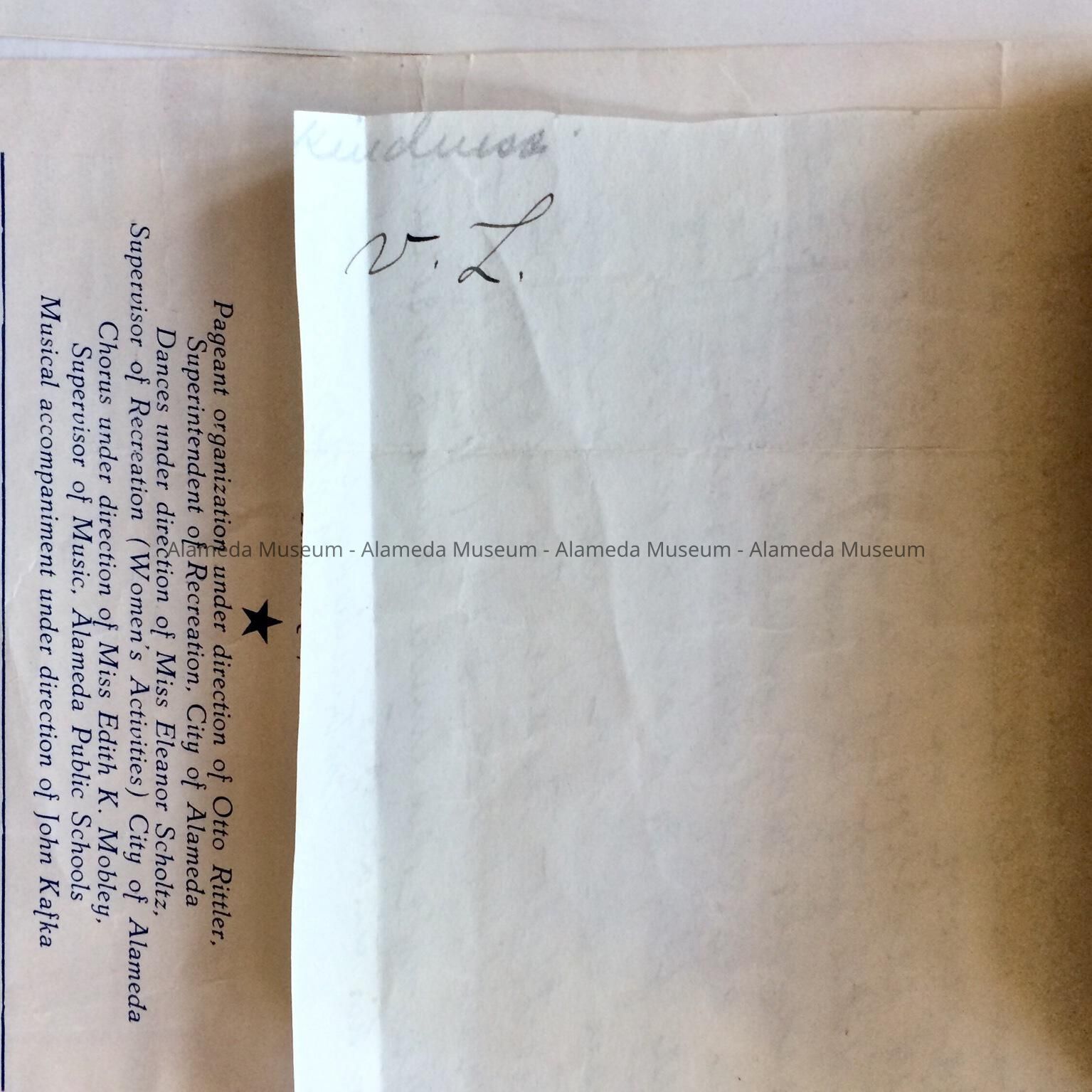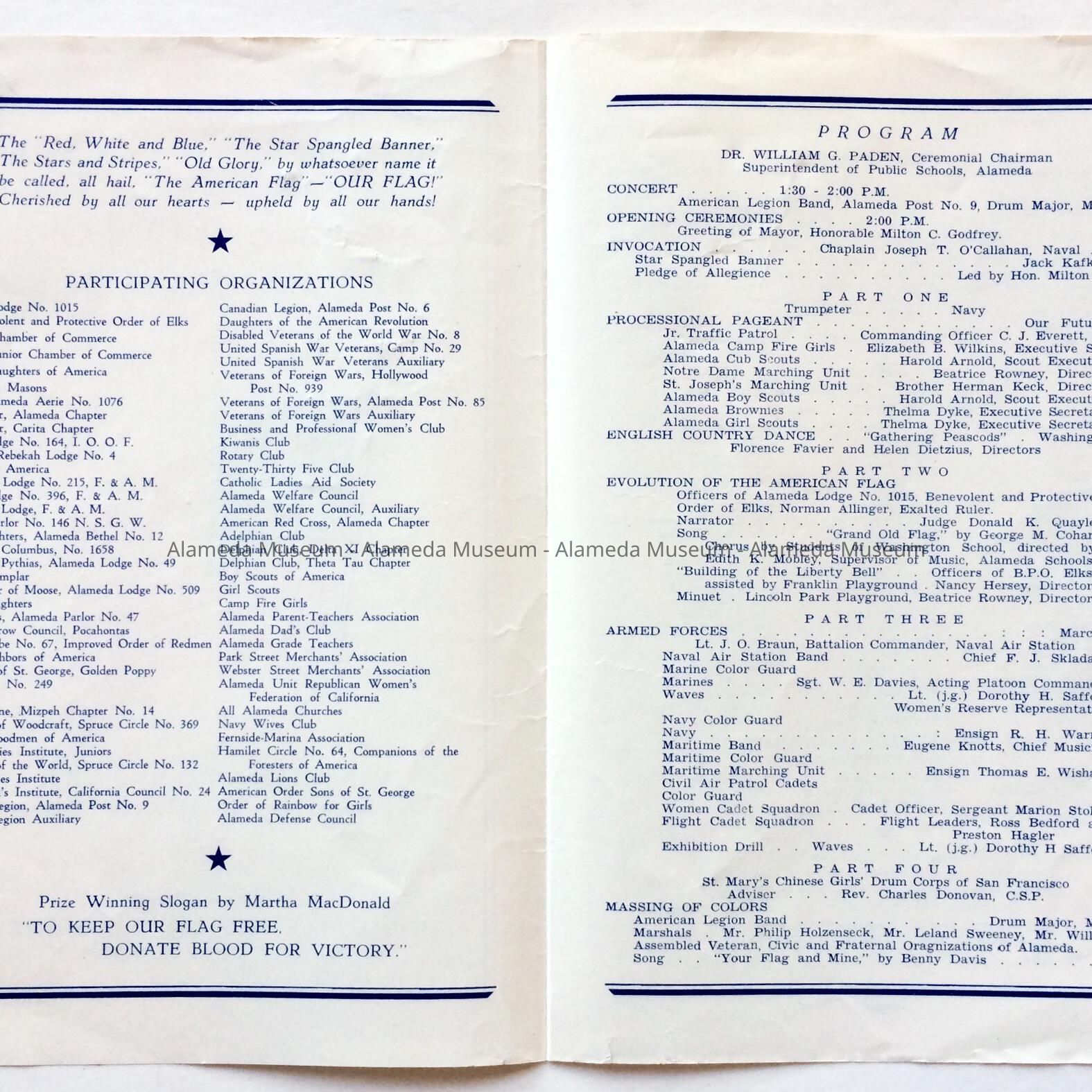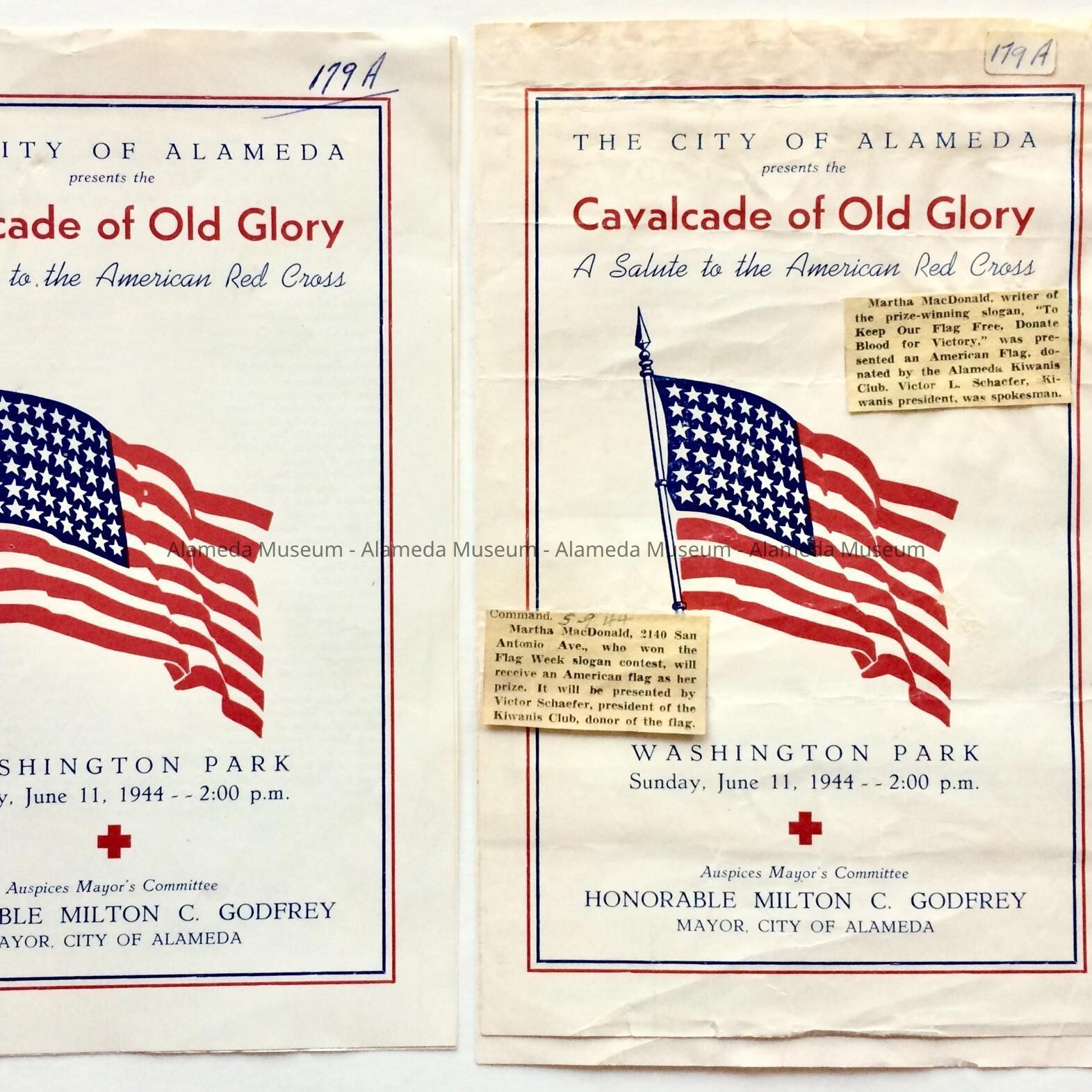 History of Object: Programs for the celebration entitled “Cavalcade of Old Colony" held in Washington Park June 11, 1944 under the auspices of the City of Alameda. Given to the Alameda Historical Society prior to 1971 and never catalogued. Item numbered 179.