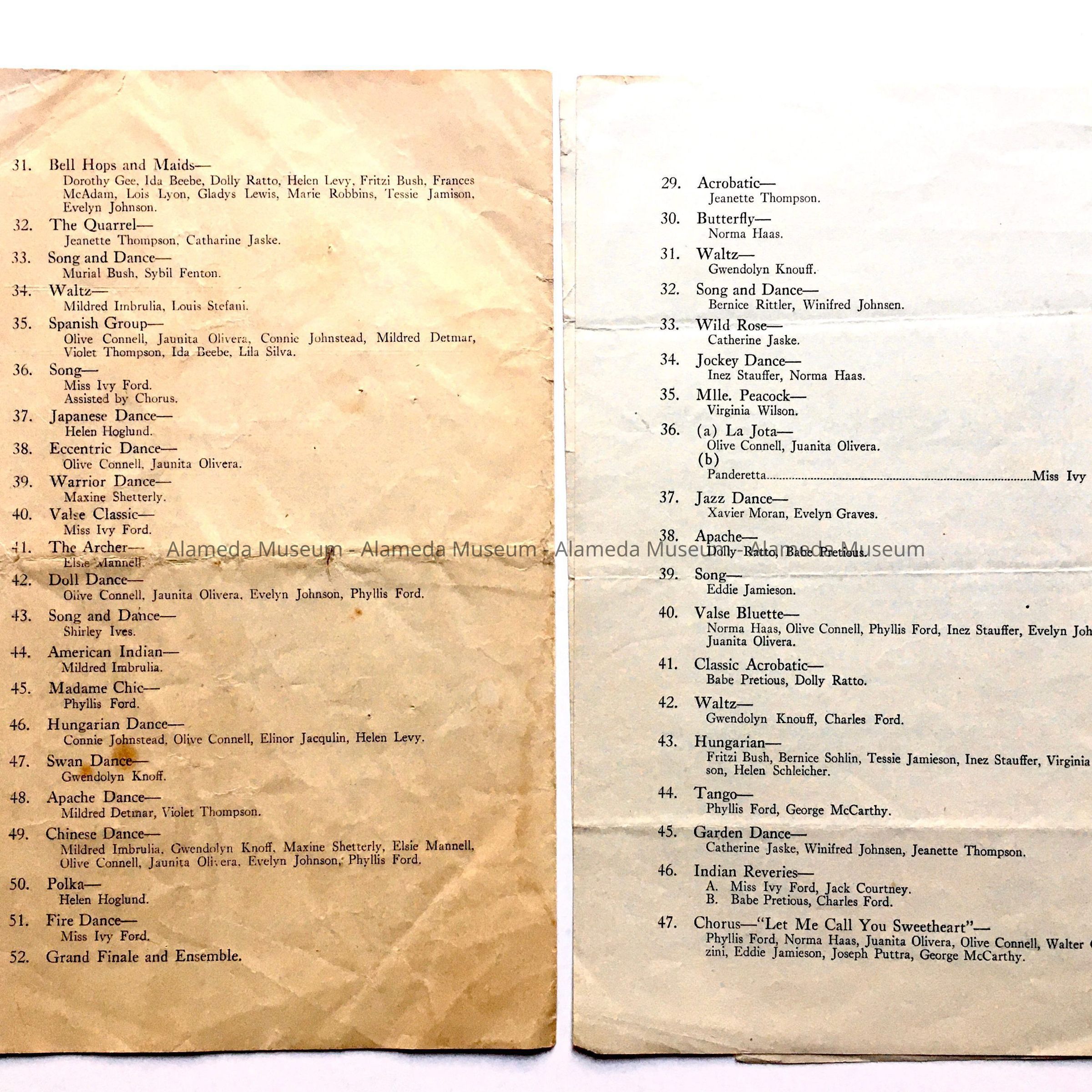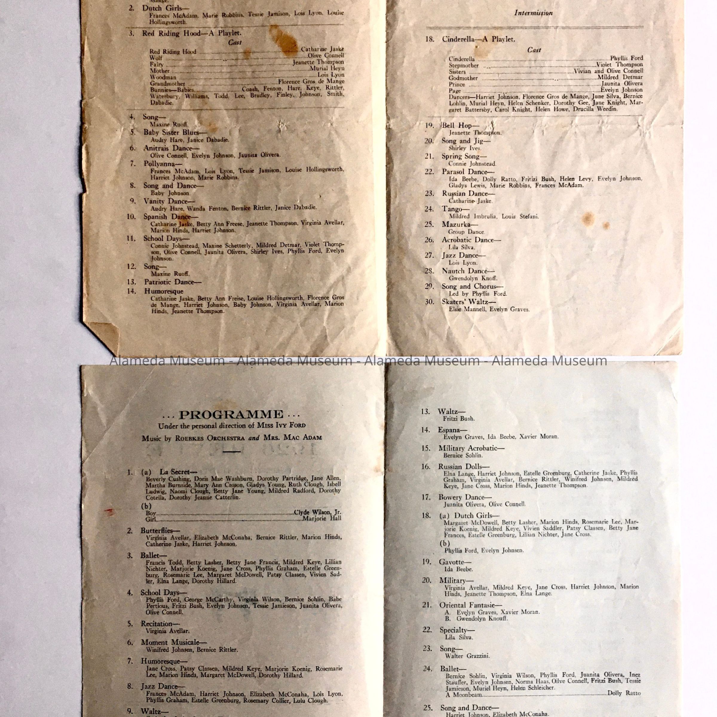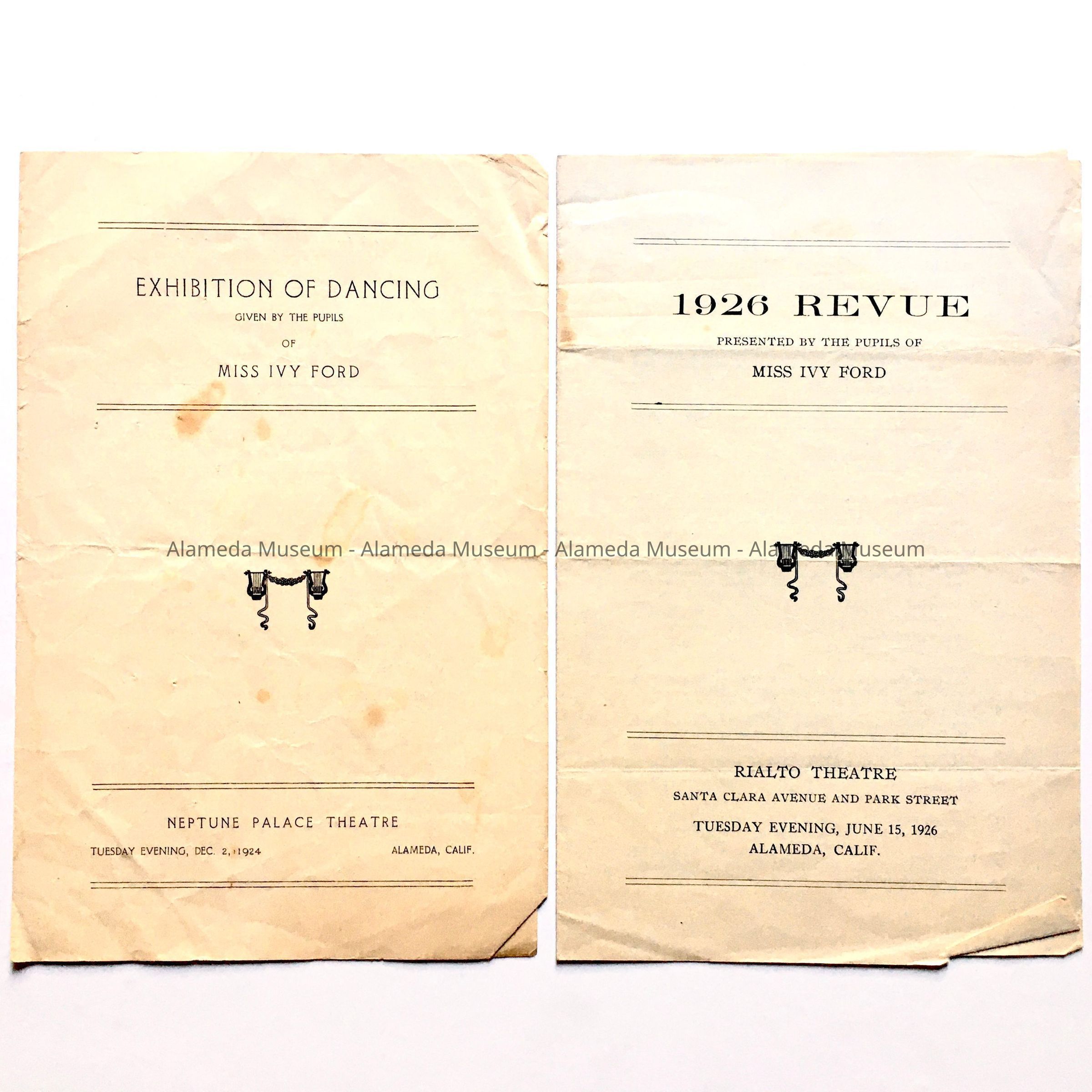 History of Object: Programs for performances by pupils of Miss Ivy Ford, Dancing Teacher. Includes names from prominent Alameda families of the time, such as Johnson, Ratto, Silva, Thompson, Haas, Rittler, Hinds and more. Miss Ford taught and lived at different addresses in Alameda between 1922-1926 before establishing her dancing school in Oakland. The Neptune Theatre was part of the Neptune Beach enterprise, 1917-1939. The Rialto Theatre opened in 1921, located on the south side of Santa Clara Avenue between Park Avenue and Park Street.
