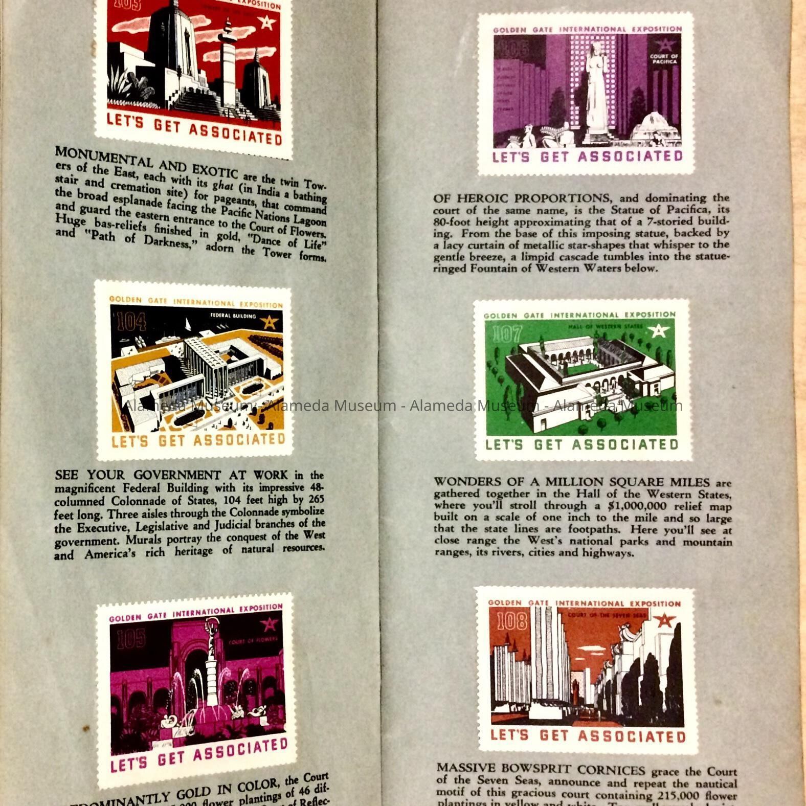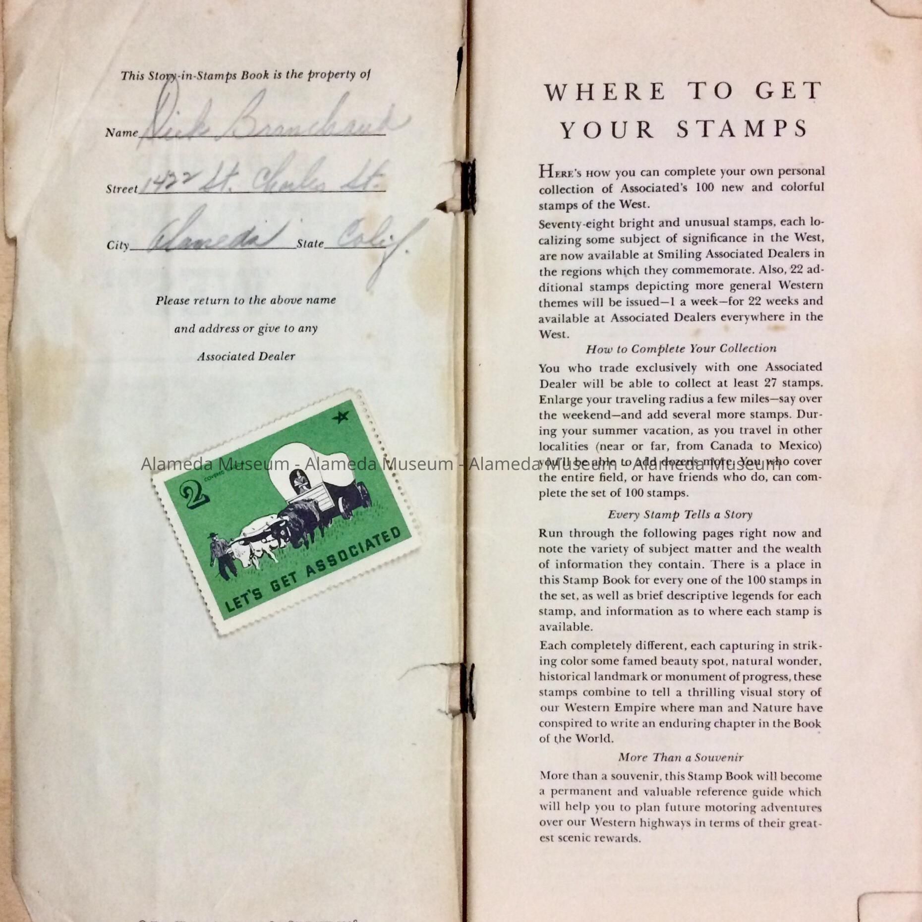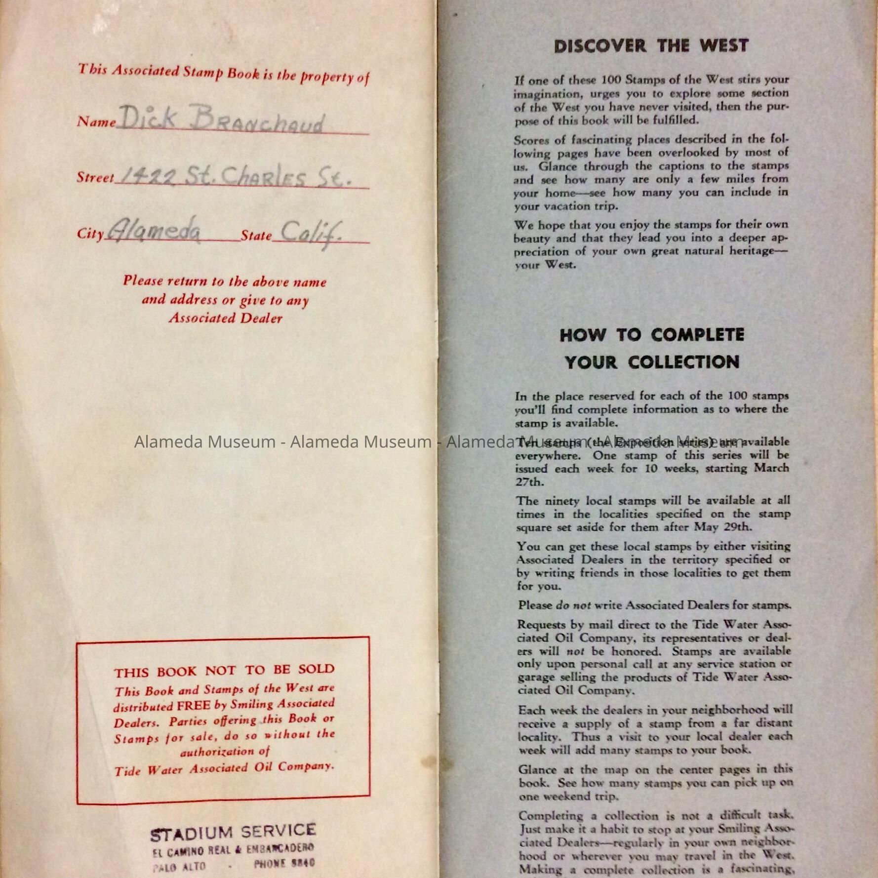History of Object: a promotional item distributed by the Tidewater-Associated Oil Company that involved scenic tourist stamps that were to be affixed to designated places in this album. There are two albums: (A) with a black cover is completed ; (B) with a red cover is incomplete. These albums belonged to Dick Branchaud of Alameda.