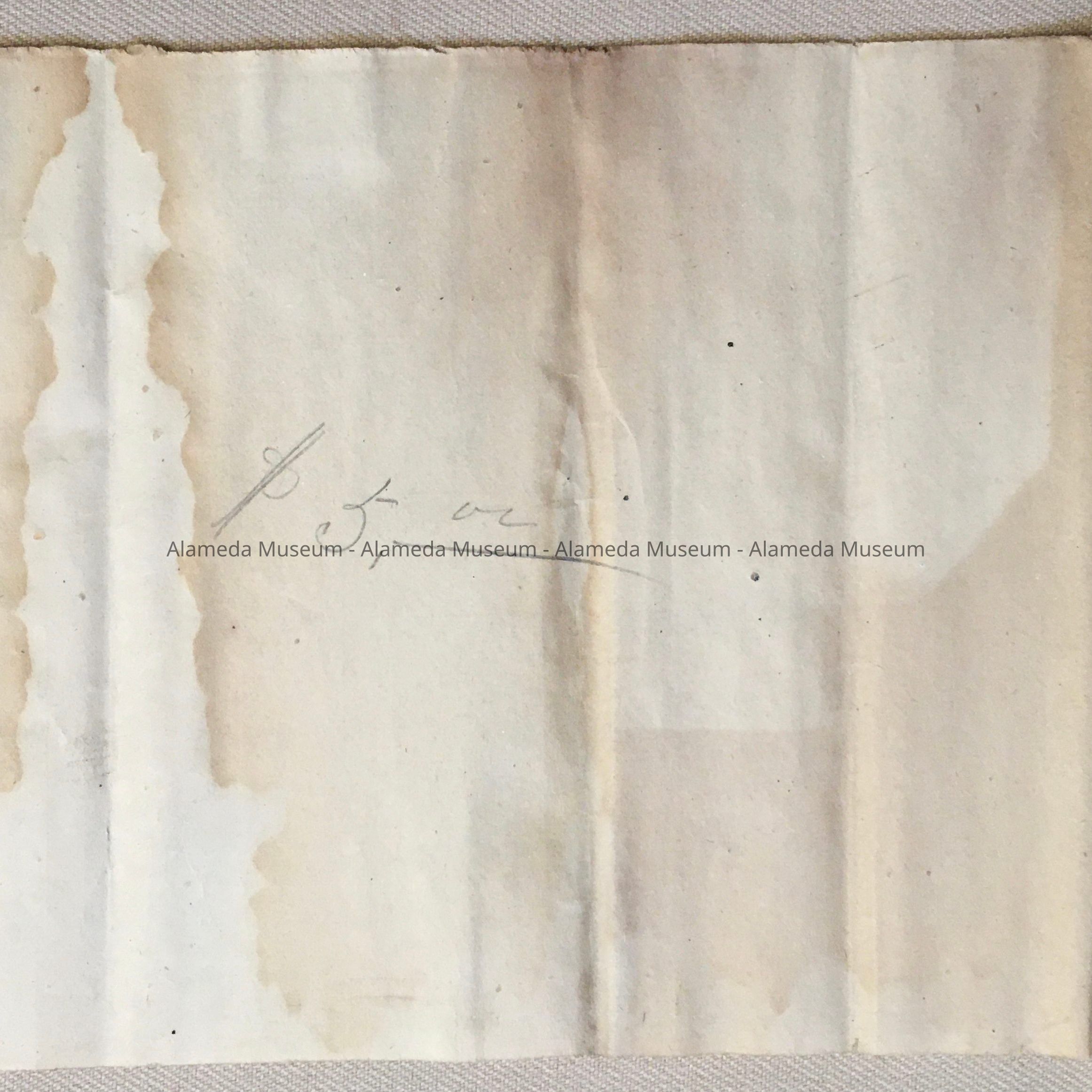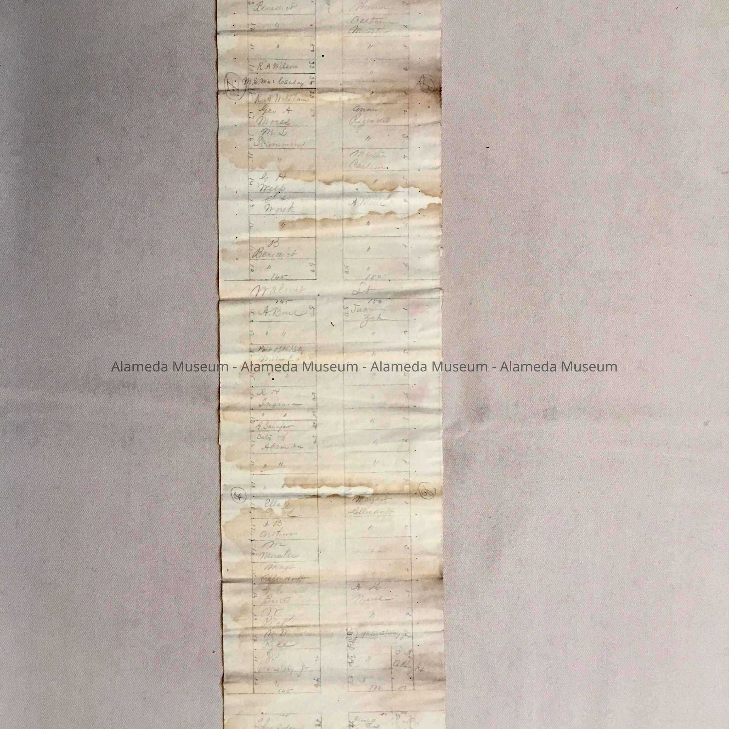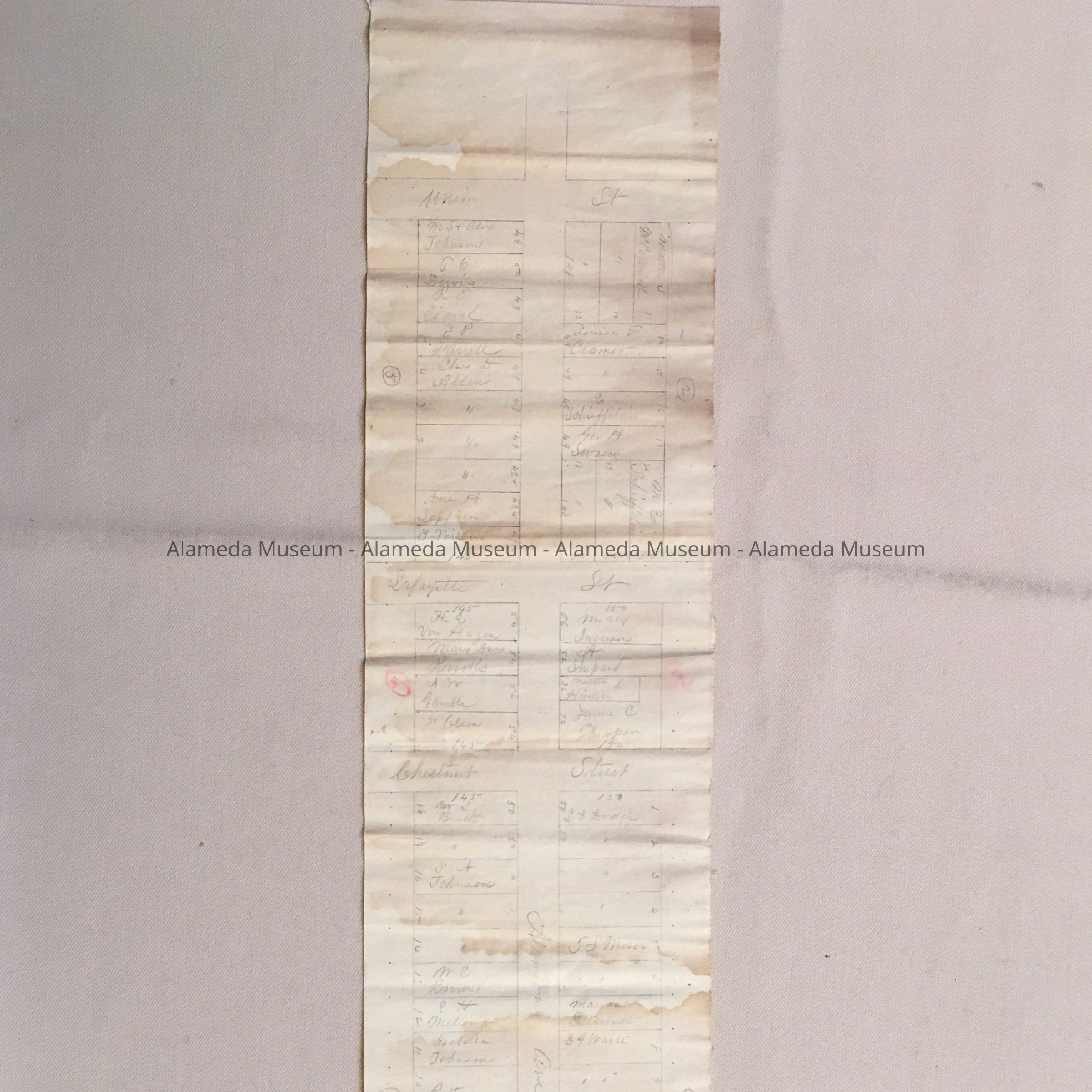 HISTORY OF OBJECT: A PROPERTY MAP OF ALAMEDA AVENUE BETWEEN UNION AND OAK STREETS THE CRUDE MAP INDICATES INDIVIDUAL LOTS AND PROPERTY OWNERS ON ALAMEDA AVENUE. THE PROPERTY MAP WAS DRAWN BEFORE 1897.