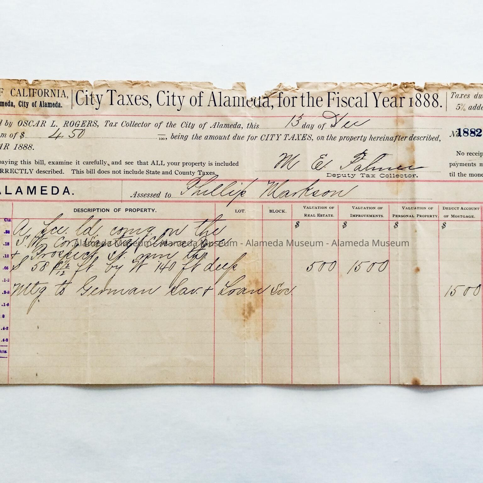 Property Tax Receipt, site West End Alameda Free Library, 1888Entry/Object ID