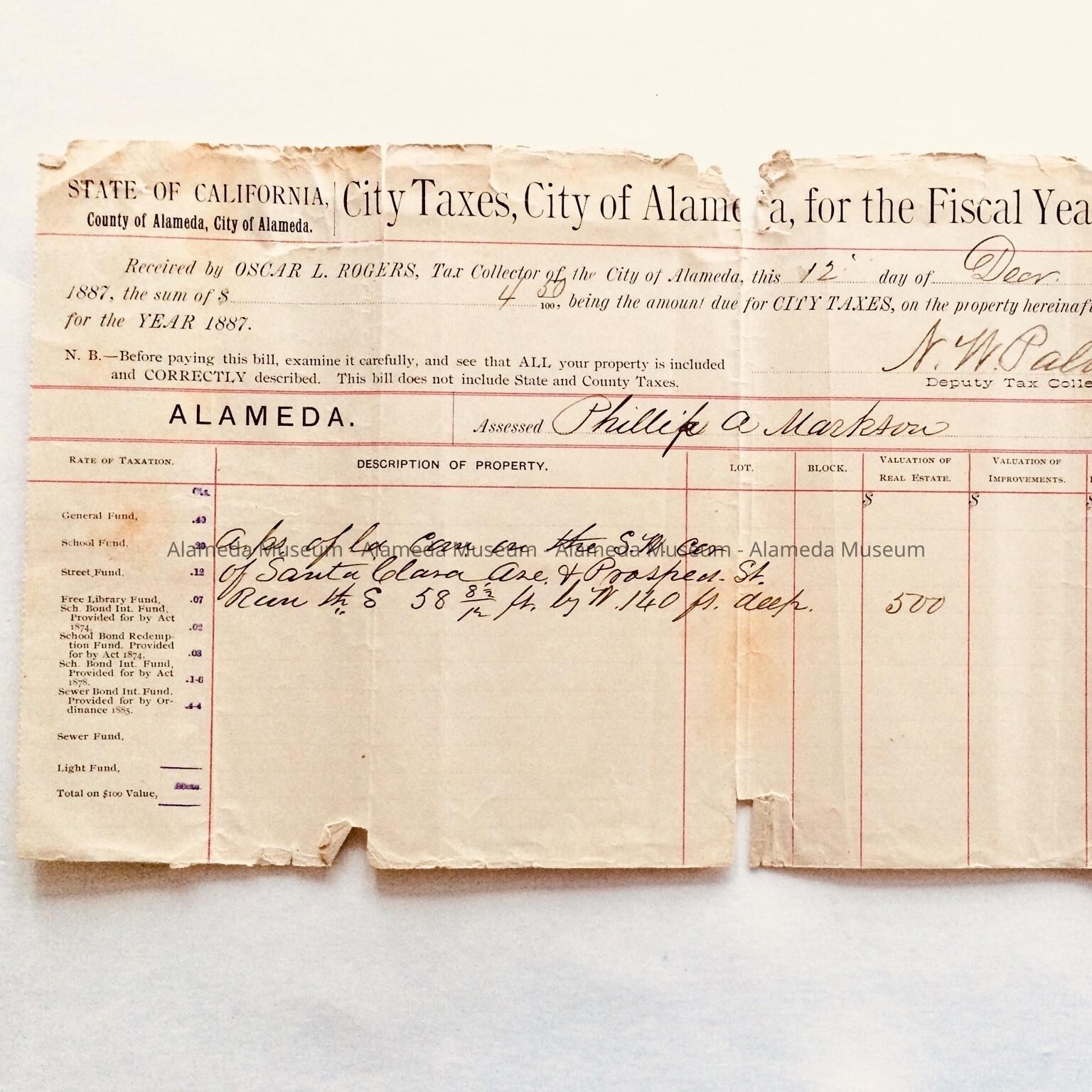 Property Tax Receipt, site West End Branch Alameda Free Library, 1887Entry/Object ID