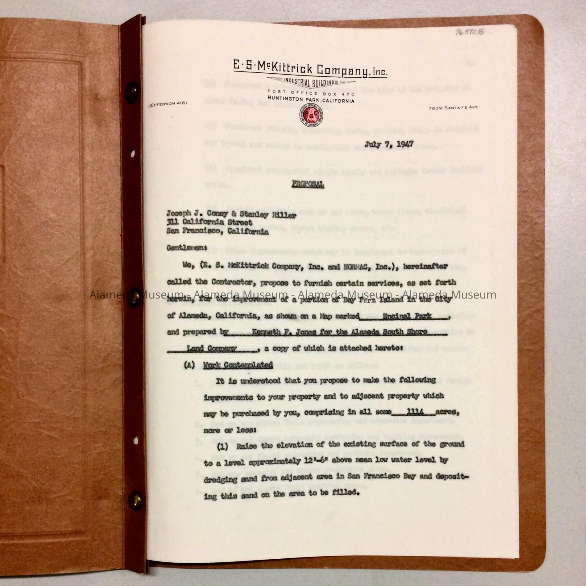 TYPEWRITTEN PROPOSAL PREPARED BY E S McKITTRICK, INC. AND THE NORMAC COMPANY, INC., DATED JULY 7, 1947, FOR SERVICES TO BE RENDERED ON A PROPOSED HOUSING SUBDIVISION ON BAY FARM ISLAND.