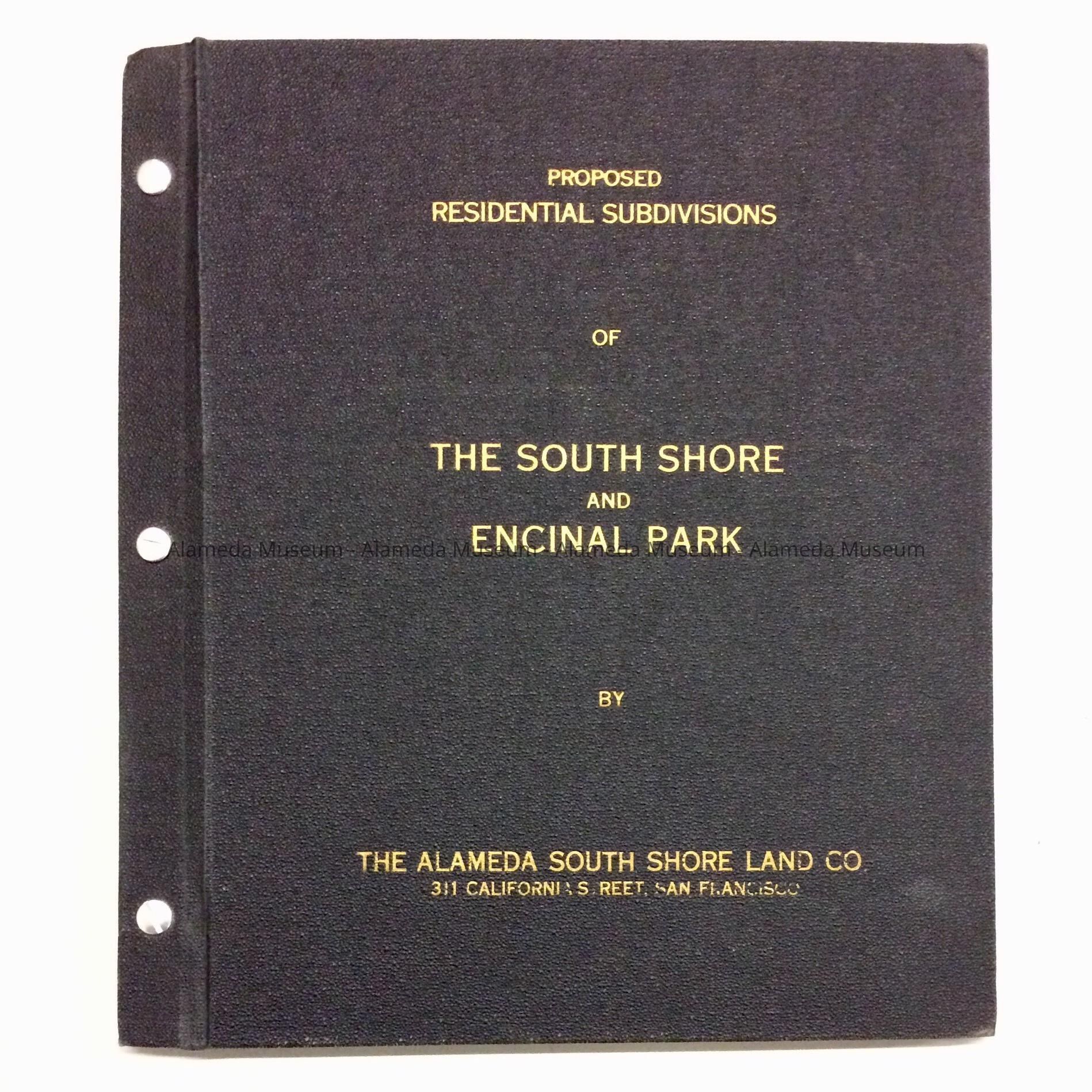 ILLUSTRATED (PHOTOGRAPHS) TYPEWRITTEN REPORT, WITH SUBDIVISION MAPS CONTAINED IN BLACK-COLORED HARD-BOUND COVER LOOSE-LEAF BOOKLET. COVER HAS EMBOSSED CAPTION IN BOLD CAPITAL LETTERS, "SOUTH SHORE AND ENCINAL PARK."
