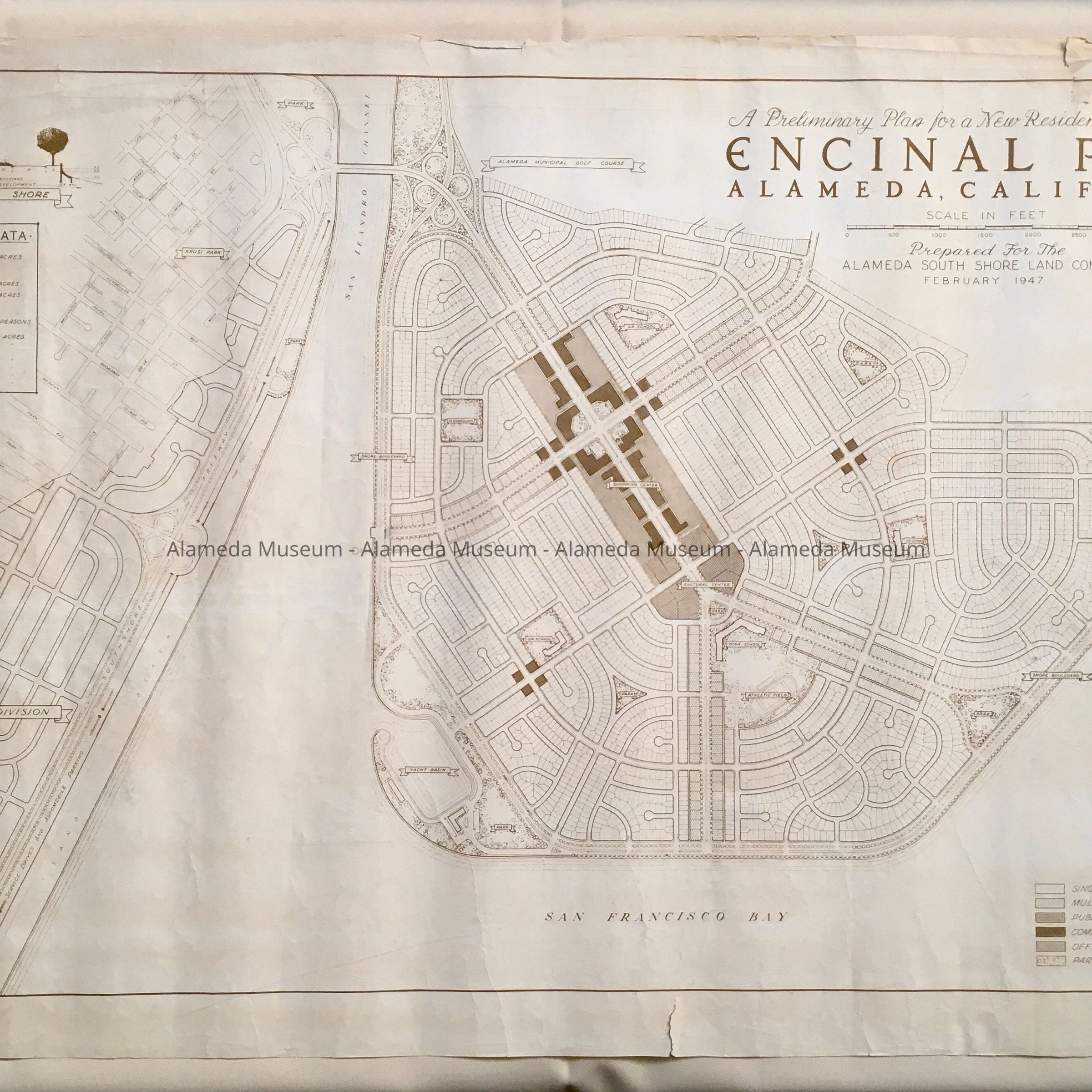HISTORY OF OBJECT: A PROPOSED DEVELOPMENT FOR A NEW RESIDENTIAL COMMUNITY TITLED, "ENCINAL PARK," PREPARED FOR THE ALAMEDA SOUTHSHORE LAND COMPANY, FEBRUARY 1947. THE SITE WOULD HAVE BEEN ON BAY FARM ISLAND ADJOINING THE ALAMEDA MUNICIPAL GOLF COURSE AND SAN LEANDRO CHANNEL. THE PROJECT WAS NEVER BUILT.