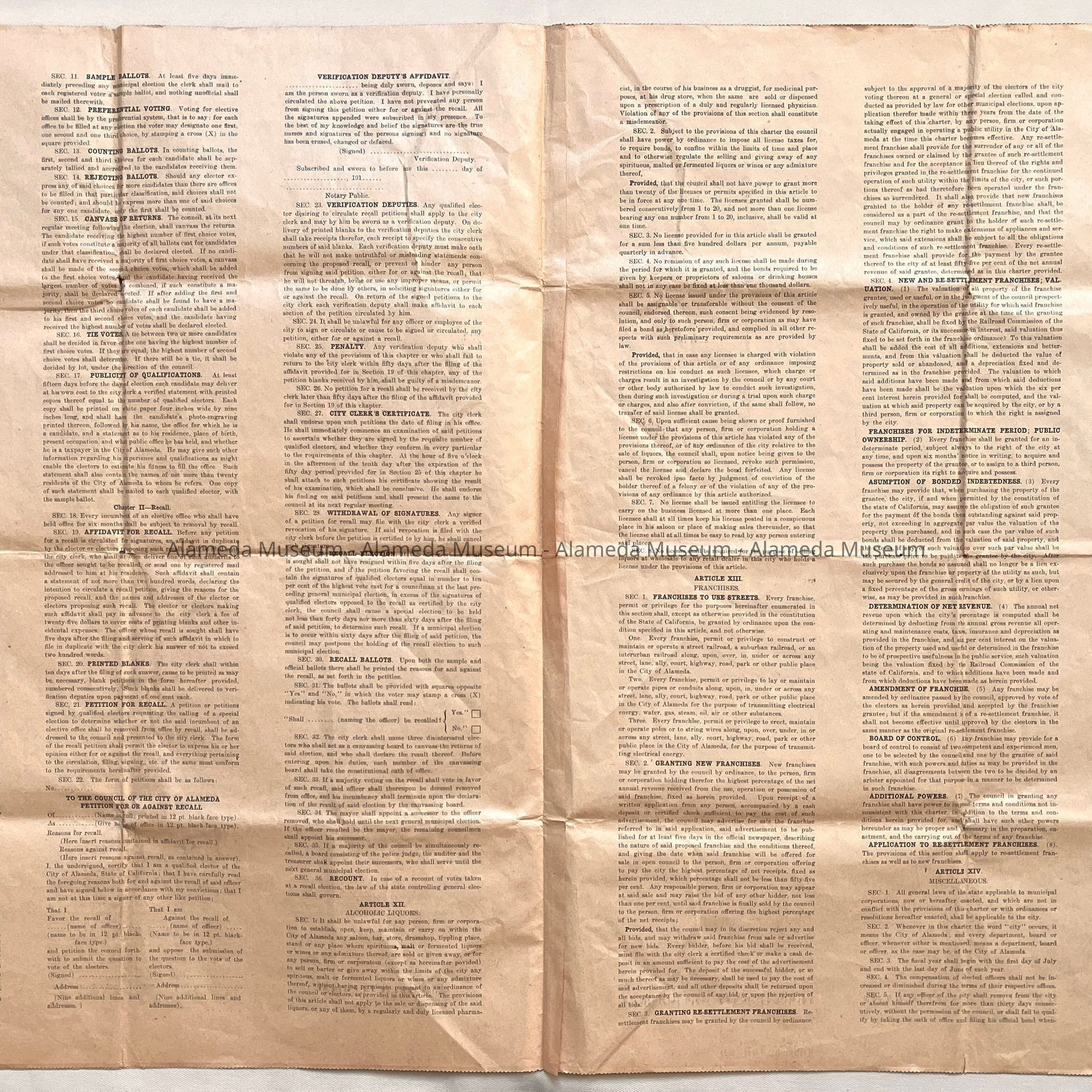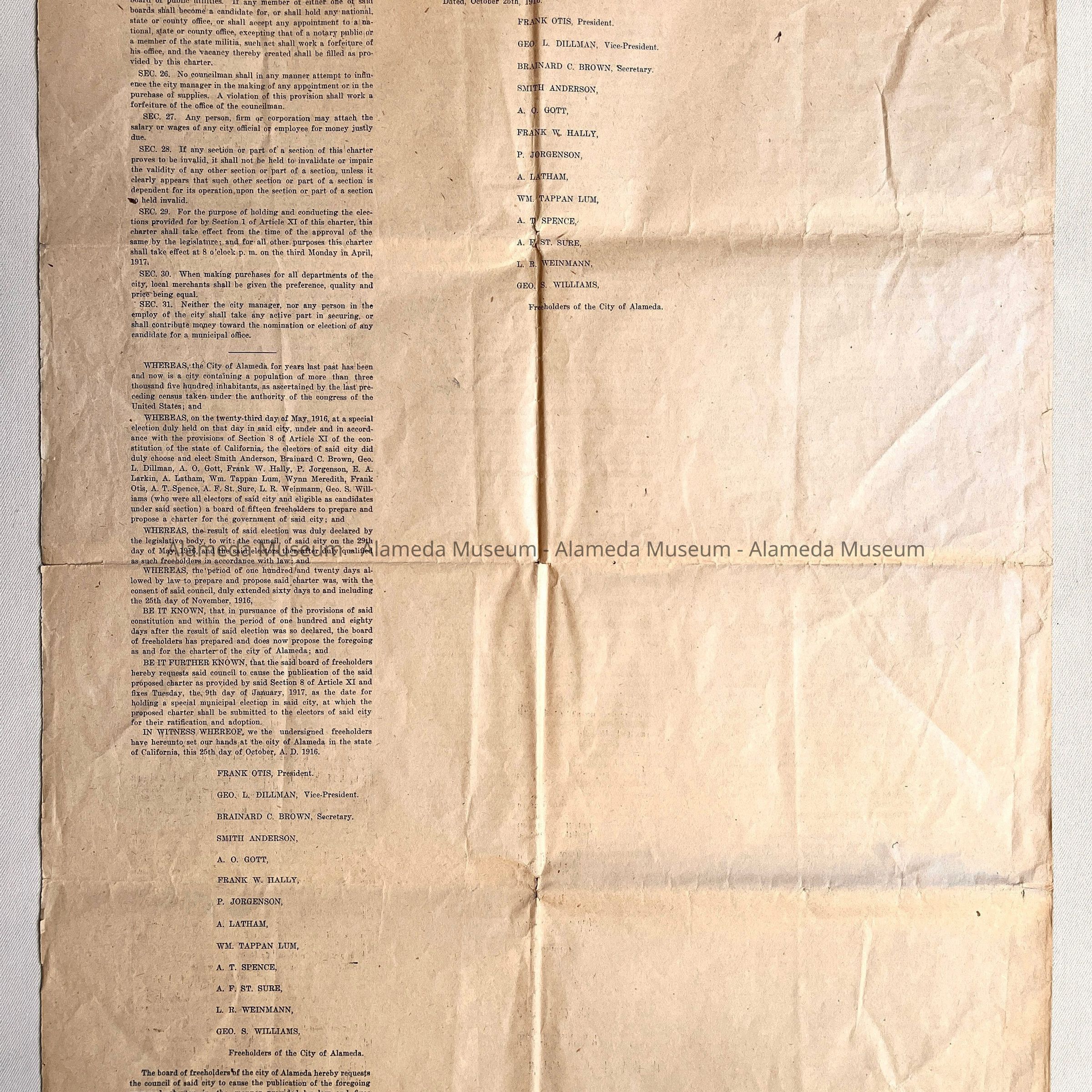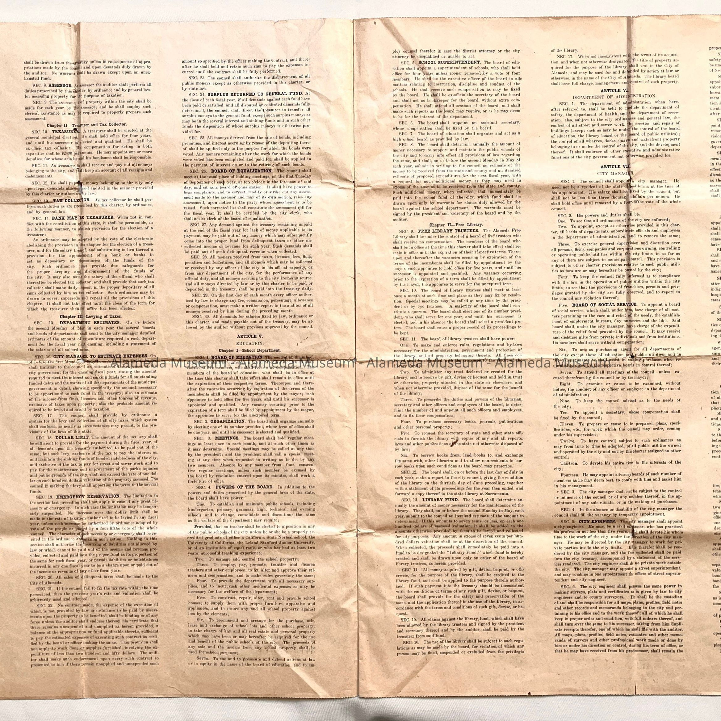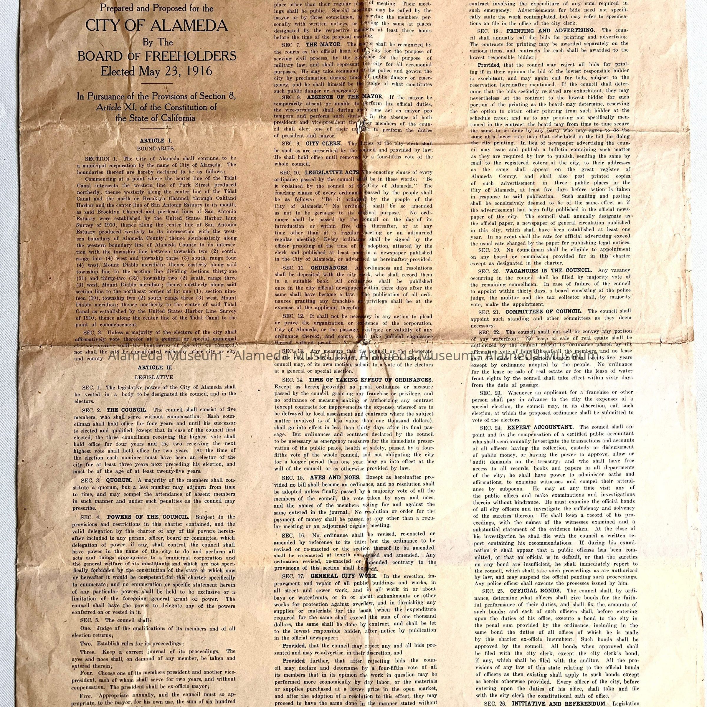 Description: Charter printed on newsprint paper, 3 pages, with bold heading "Charter, prepared and proposed for the City of Alameda, by the Board of Freeholders, elected May 23, 1916".
