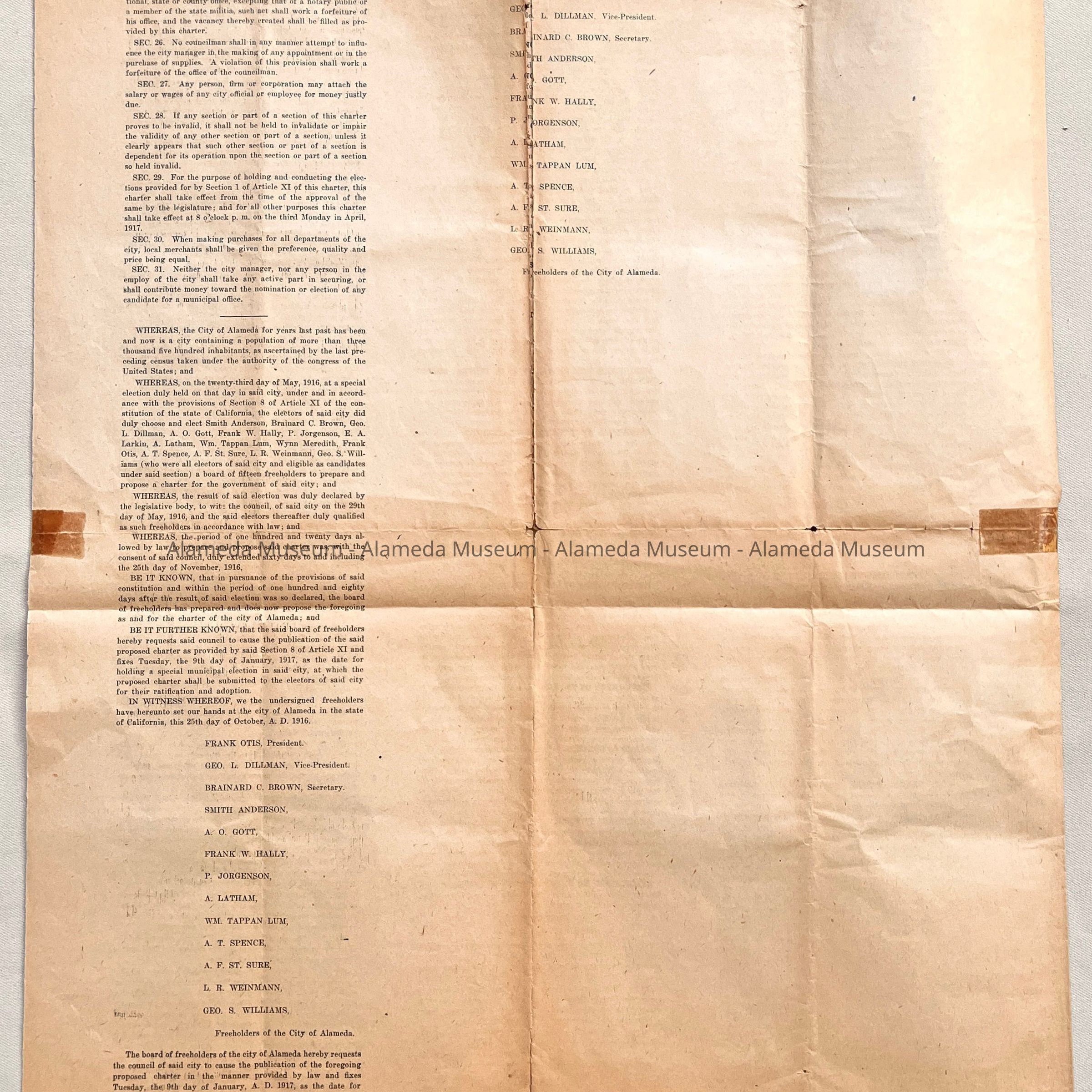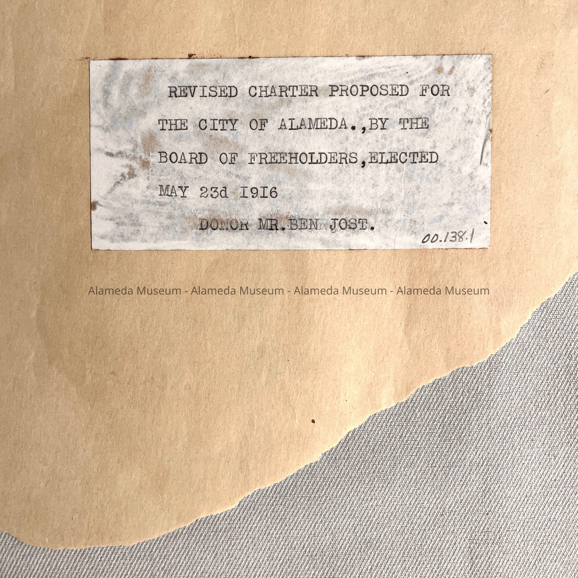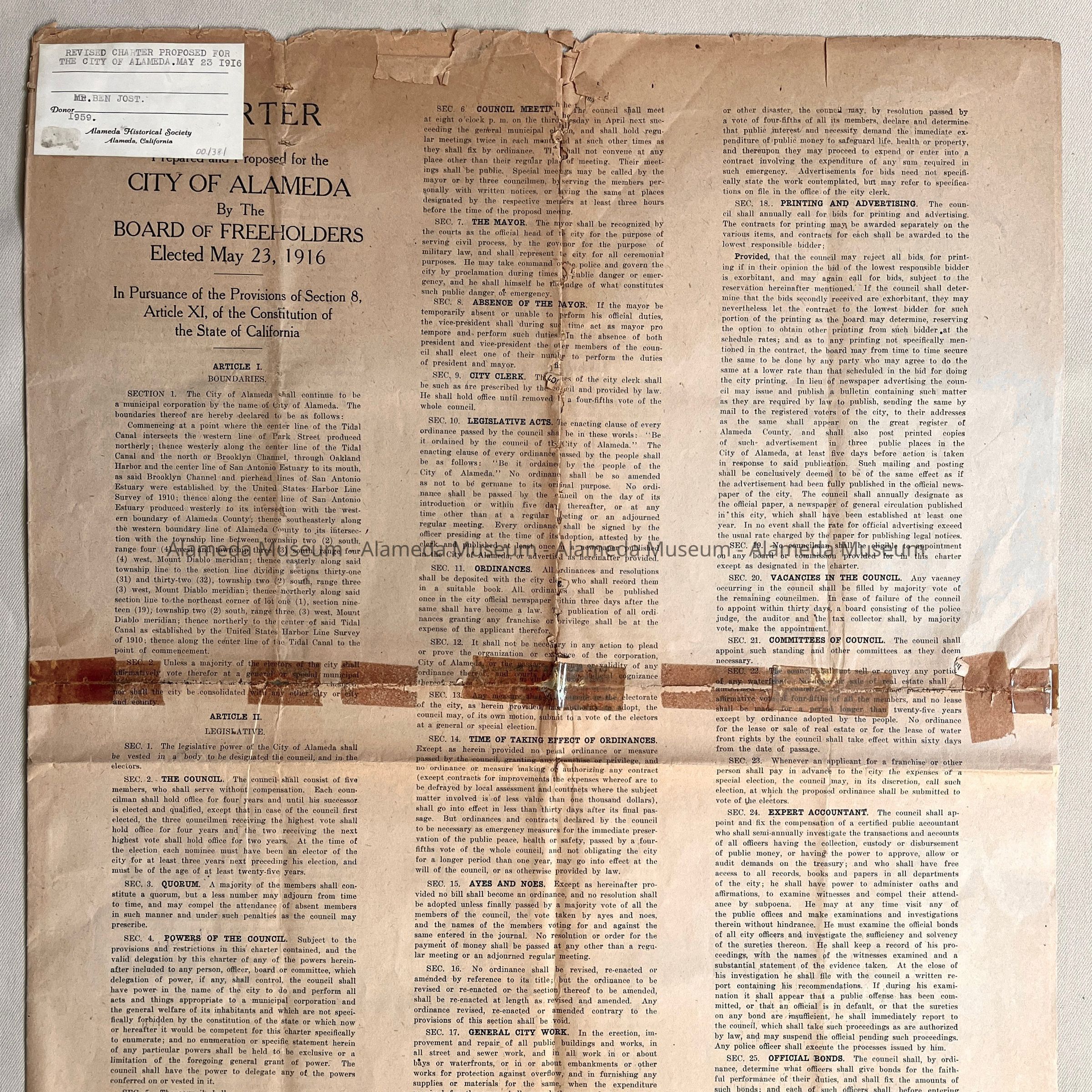 History: Revised Charter Proposal for the City of Alameda by the Board of Freeholders elected May 23, 1916. Given to the Alameda Historical Society in 1959 #15 and never catalogued.