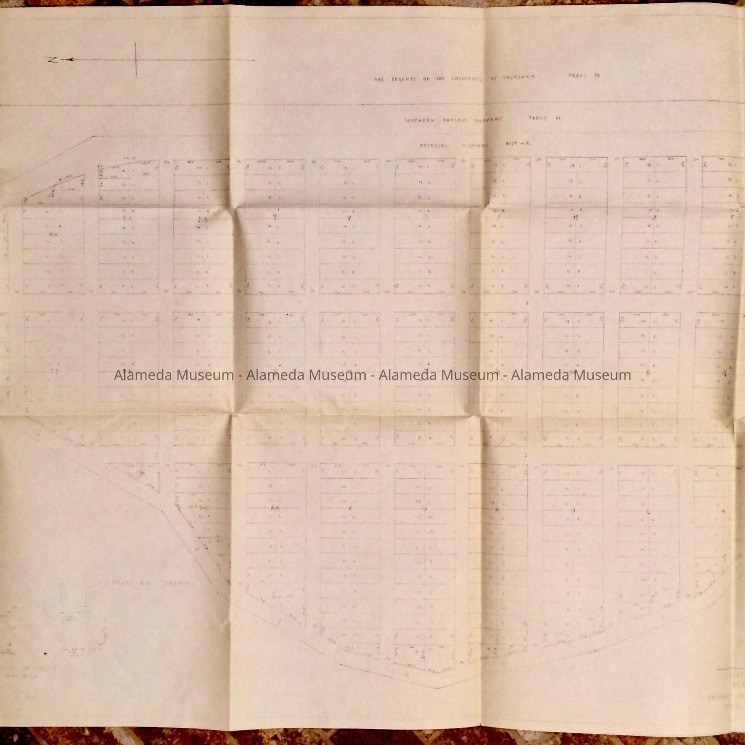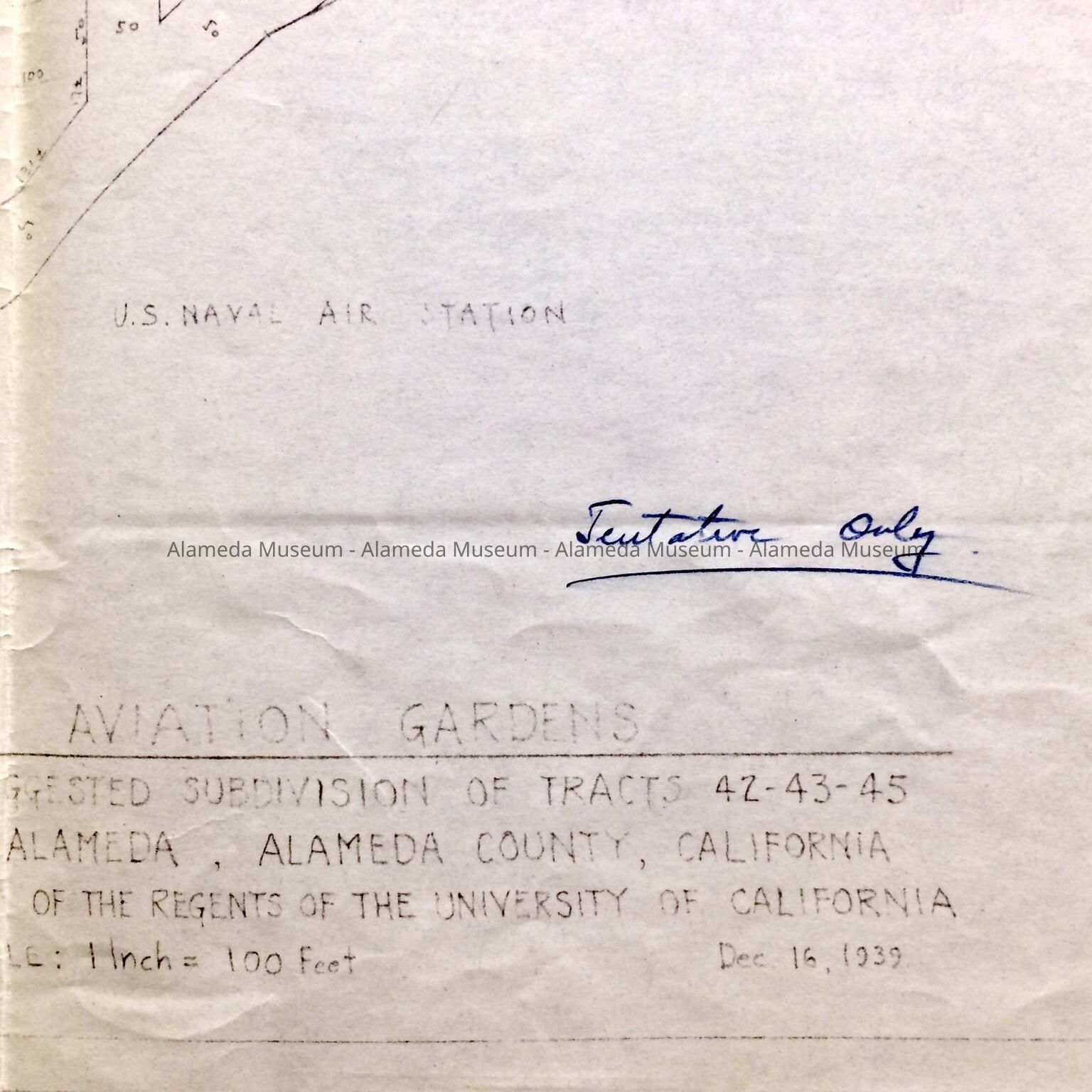 HISTORY OF OBJECT: A PROPOSED SUBDIVISION TRACT MAP, PROPERTY OF THE REGENTS OF THE UNIVERSITY OF CALIFORNIA, TITLED, "AVIATION GARDENS." MAP IS DATED DECEMBER 16, 1939; PROPERTY BELONGING TO THE U.S. NAVAL AIR STATION, WEST OF BRUSH STREET, ALAMEDA.