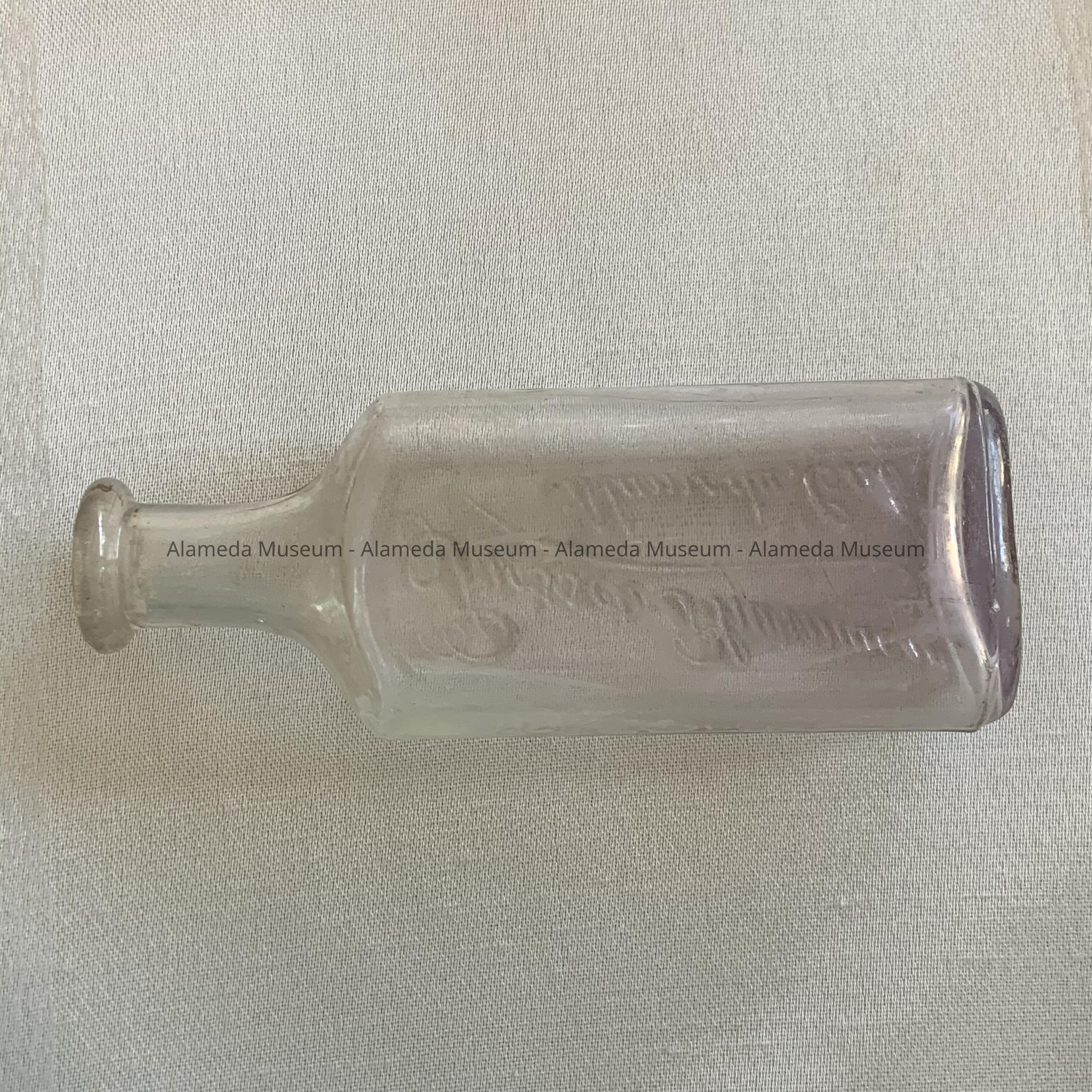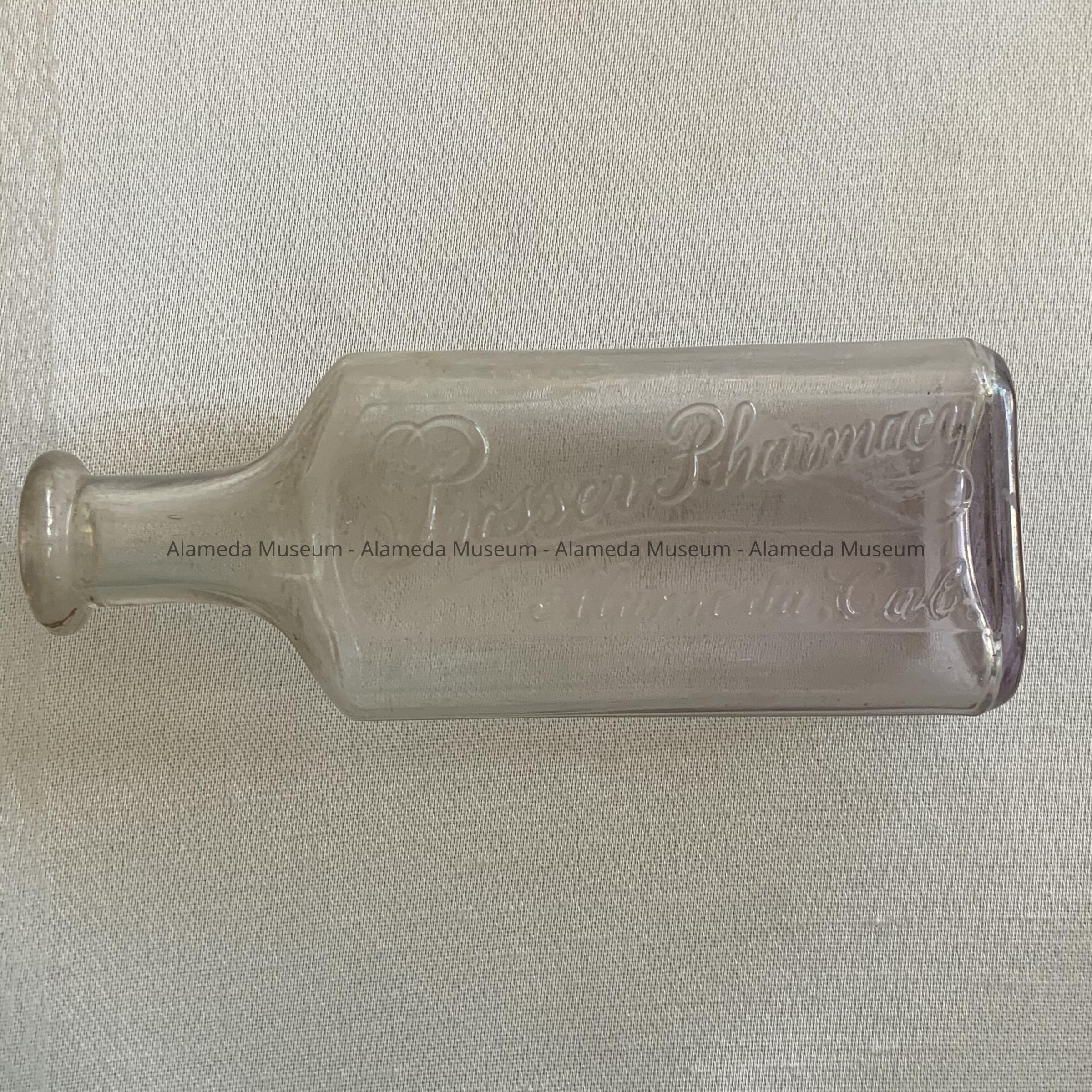 Description: Clear glass bottle which is turning slightly lavender. Double seamed, flat sided, spout with protruding lip, for cork receptacle. Raised letters "Prosser Pharmacy Alameda, Cal."