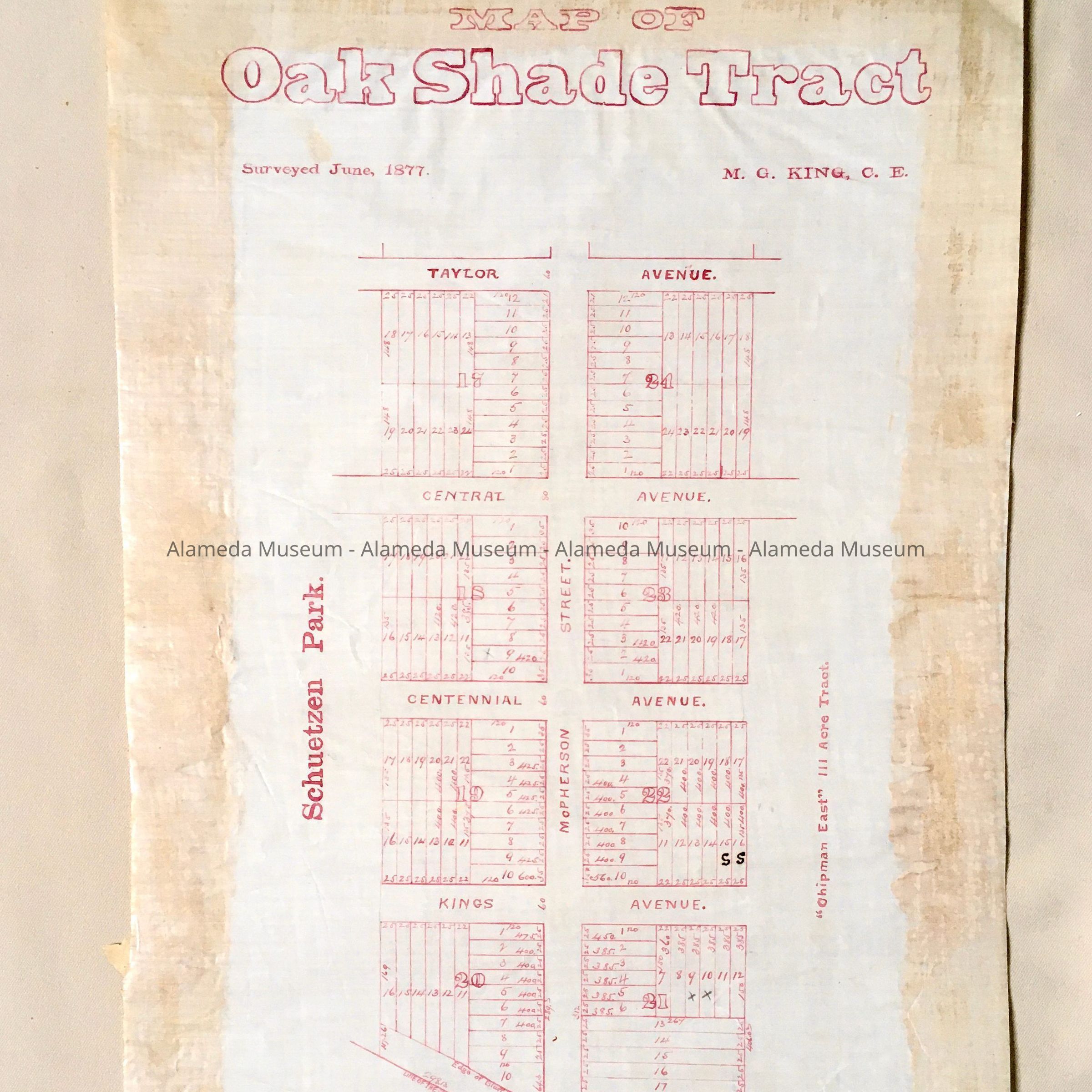 Hand-drawn map in red-colored ink on off-white colored polished linen paper with bold printed caption, “Map of Oak Shade Tract”.