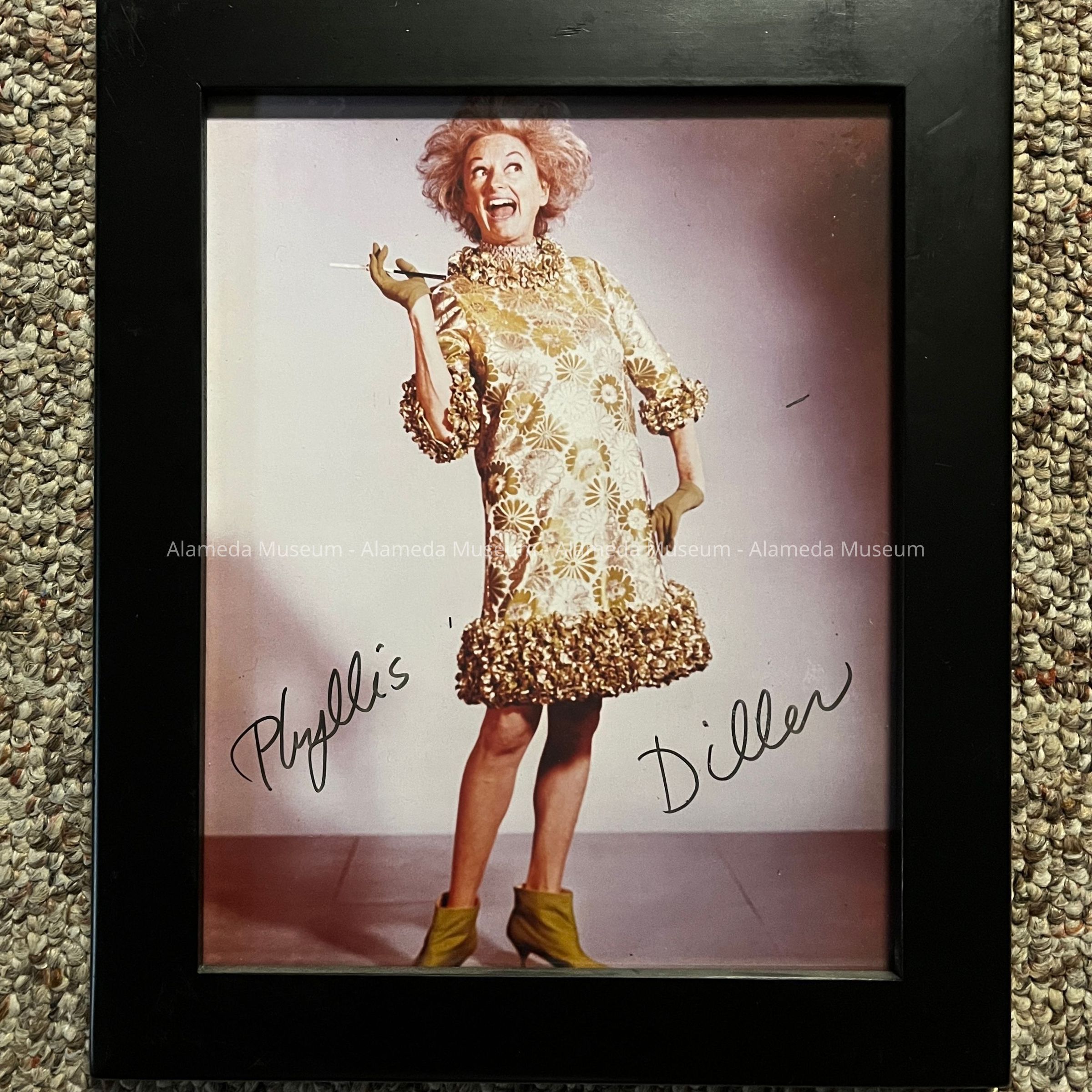 History of Object: Publicity photo of Phyllis Diller, of a performance at the Smithsonian in 1966. Signed in black, donated for the exhibit at the Alameda Museum.