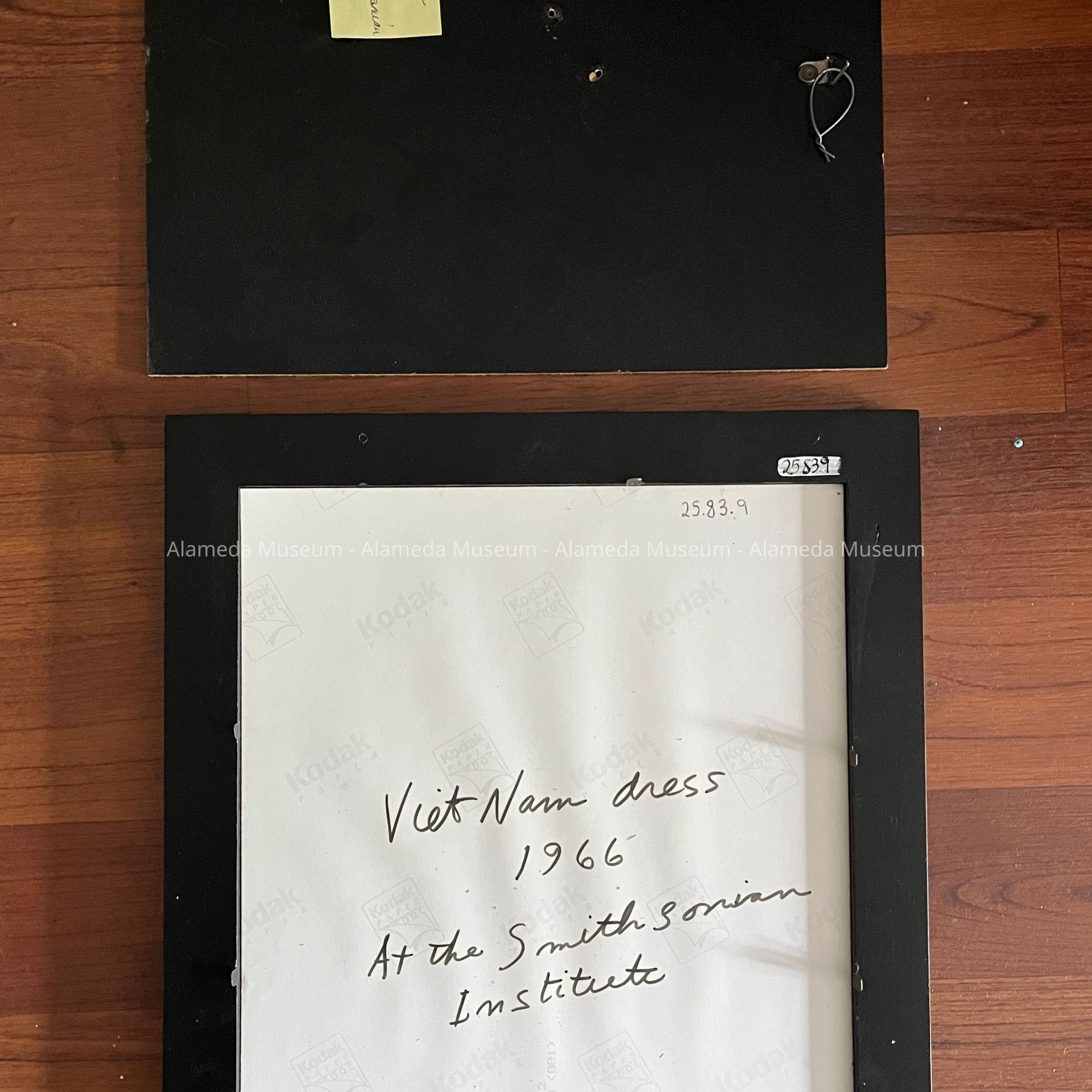 Description: Full color photo in modern wood frame painted black, showing full-figure image of a woman wearing gold-colored dress. On verso handwritten in black marker: 'VietNam dress / 1966 / At the Smithsonian Institute'.