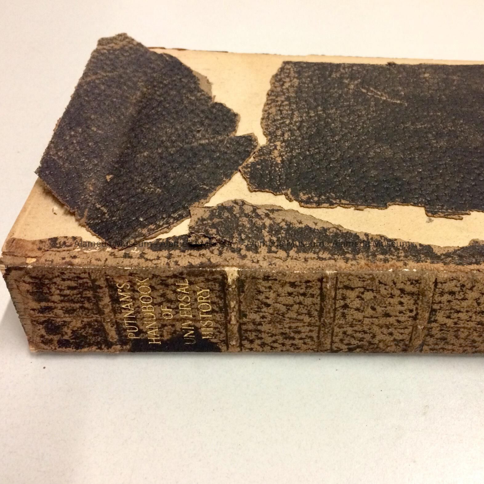 Description: Hand bound book with a deteriorated black colored leather cover. Spine of the book has an incised title in gold, "Putnam's HandBook of Universal History". It was published by G. P. Putnam's sons.