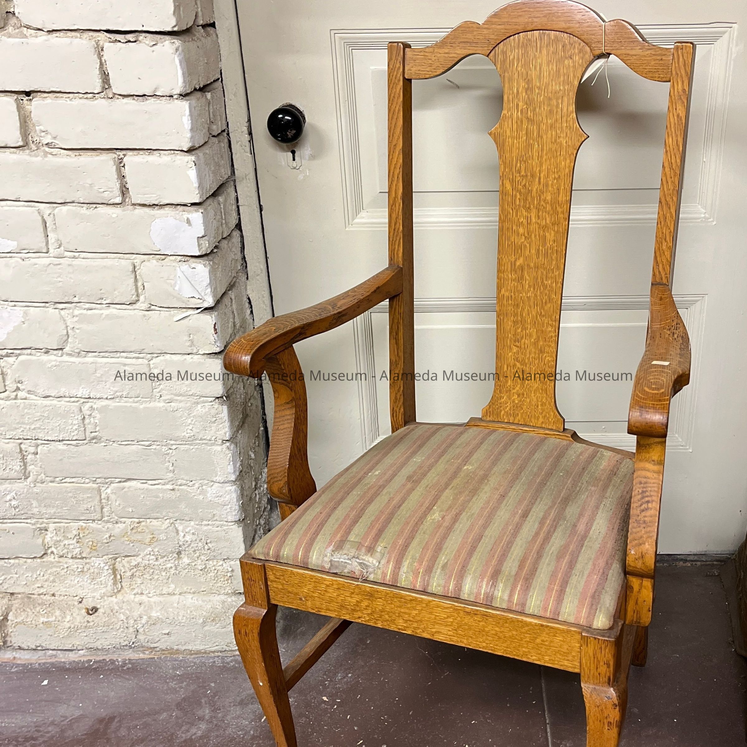 Description: A quarter-sawed oak chair of American make, in the Queen Anne-style with a scroll sawed splat attached to a serpentine crest rail. The chair has arms which are attached to side rails. The removable plank seat is covered in identical fabric to the chair described in Acc. No. 14.2.3.