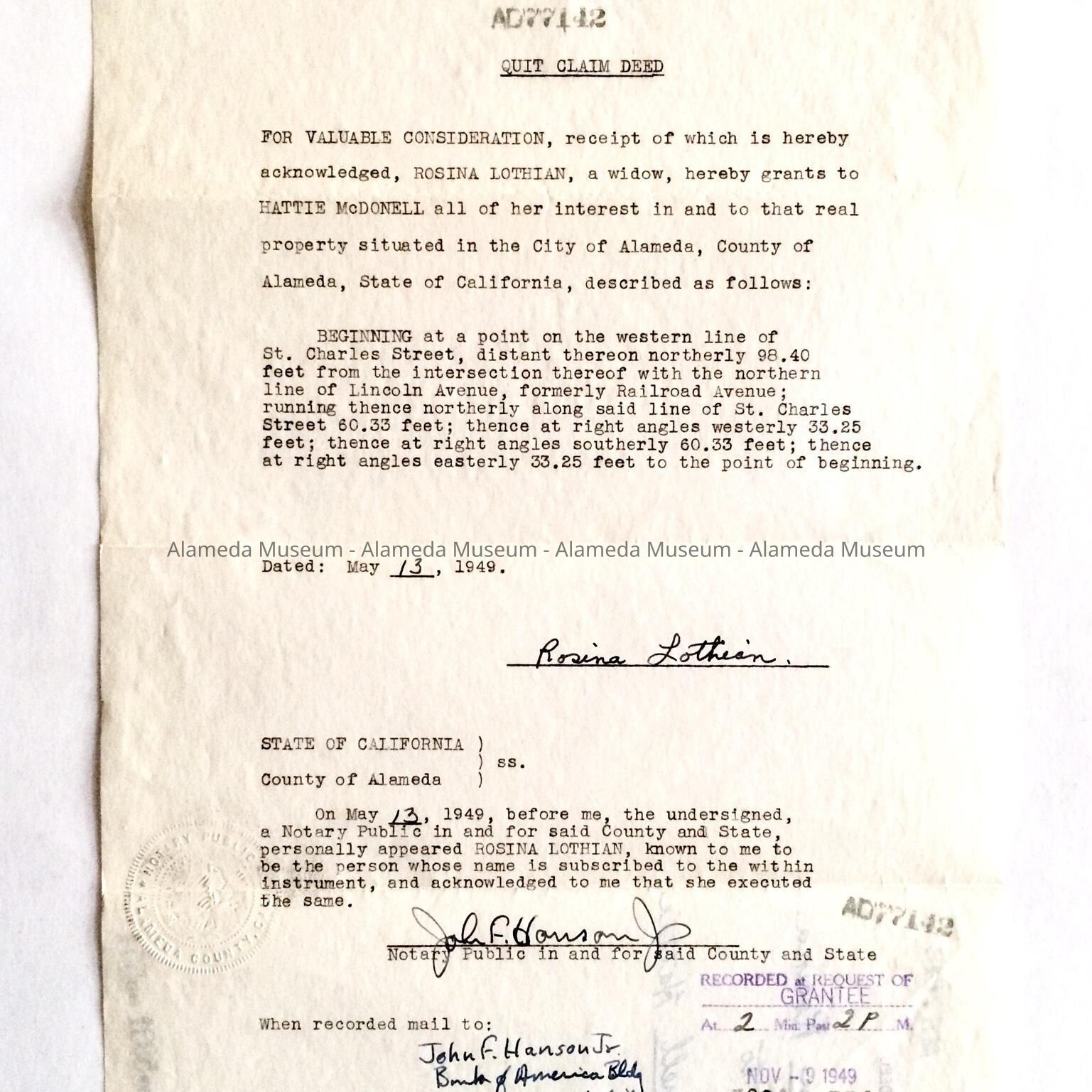 Quit claim deed for property on St Charles Street, 1949Entry/Object ID