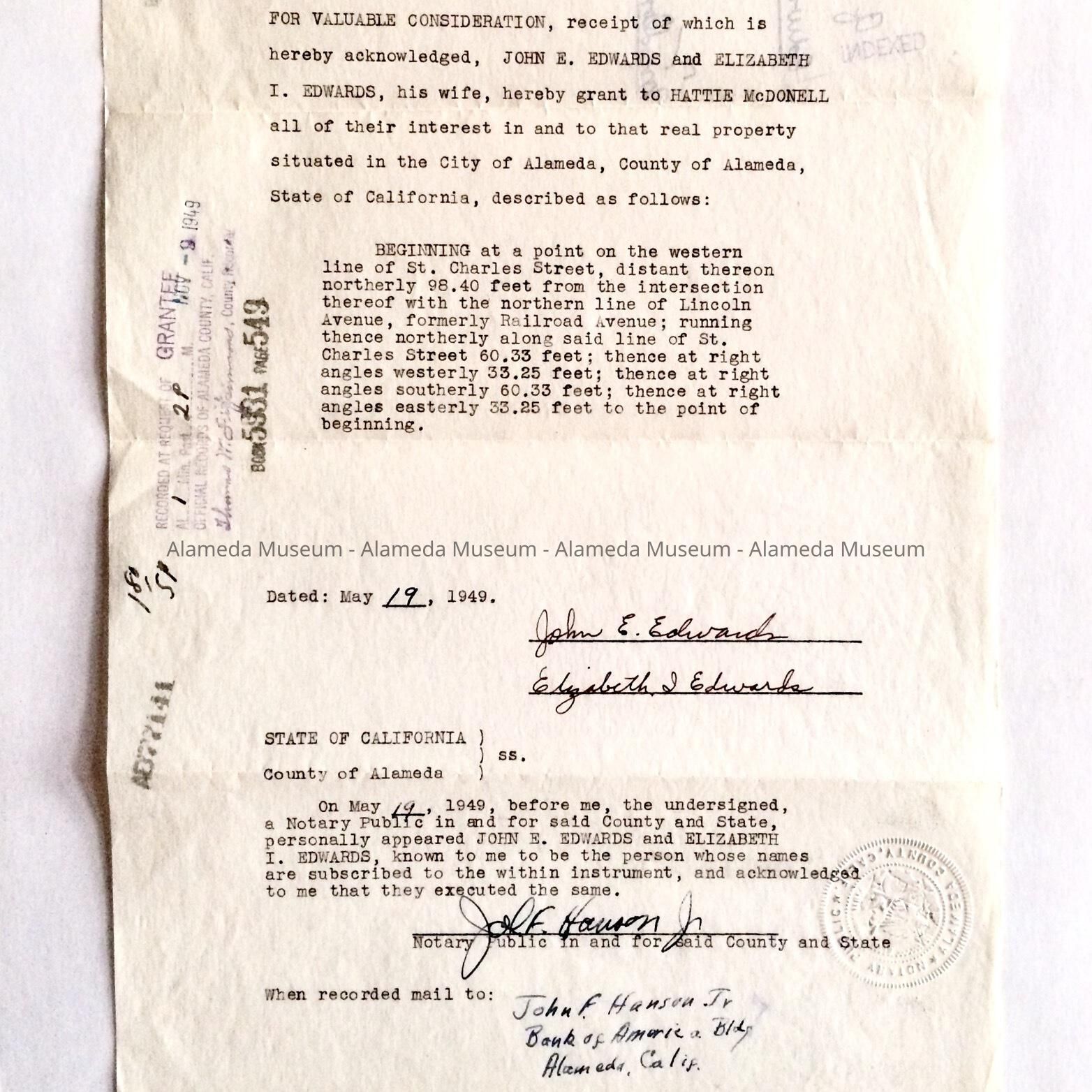 Quit claim deed from John E. and Elizabeth I. Edwards to Hattie McDonell for property on St Charles Street, near Lincoln Avenue. Dated May 19, 1949.