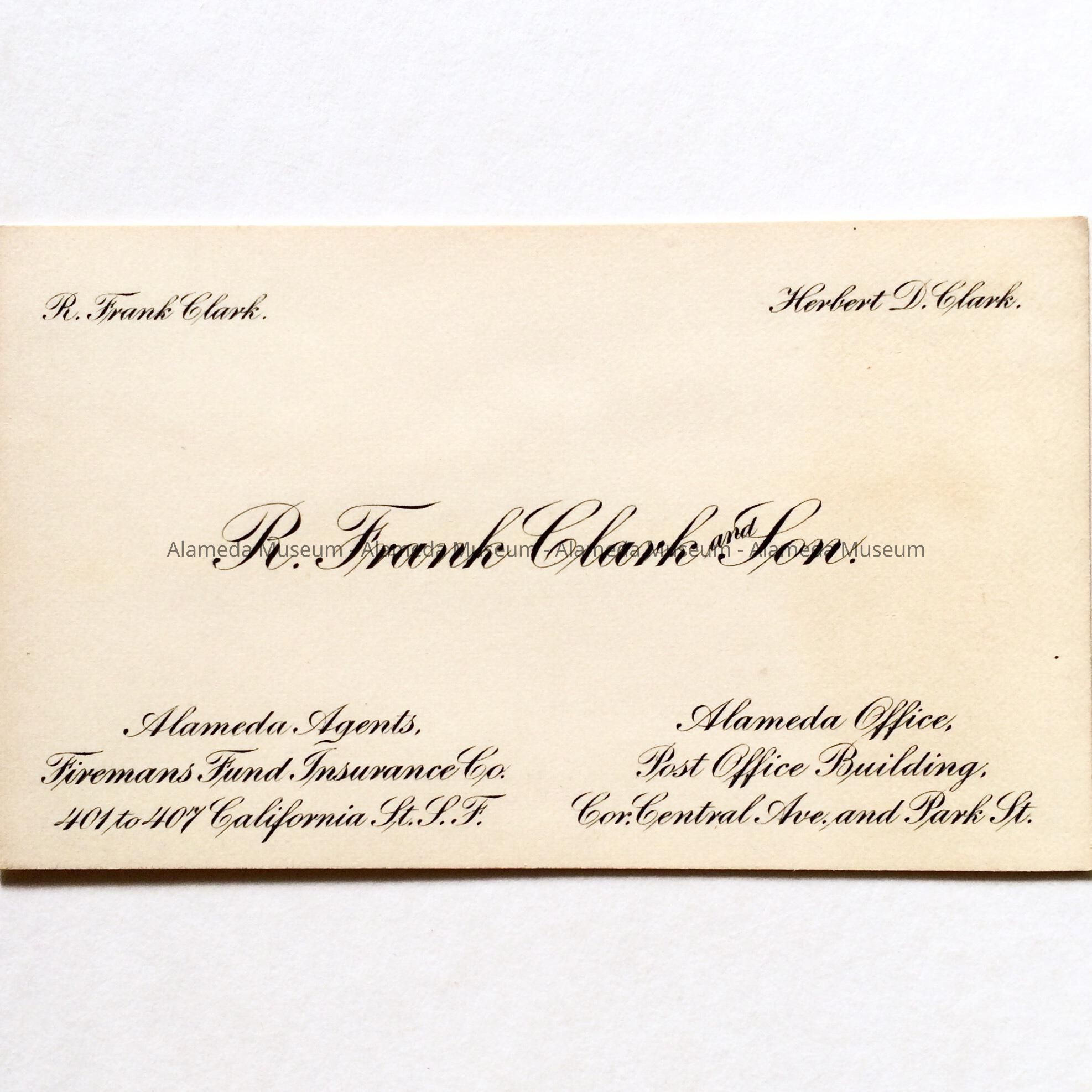 History of Object: Calling card of the Alameda Agents of the Fireman's Fund Insurance Co., 401 to 407 California St. San Francisco. The Alameda Office was in the Post Office Building, Cor. Central Ave., and Park Street.