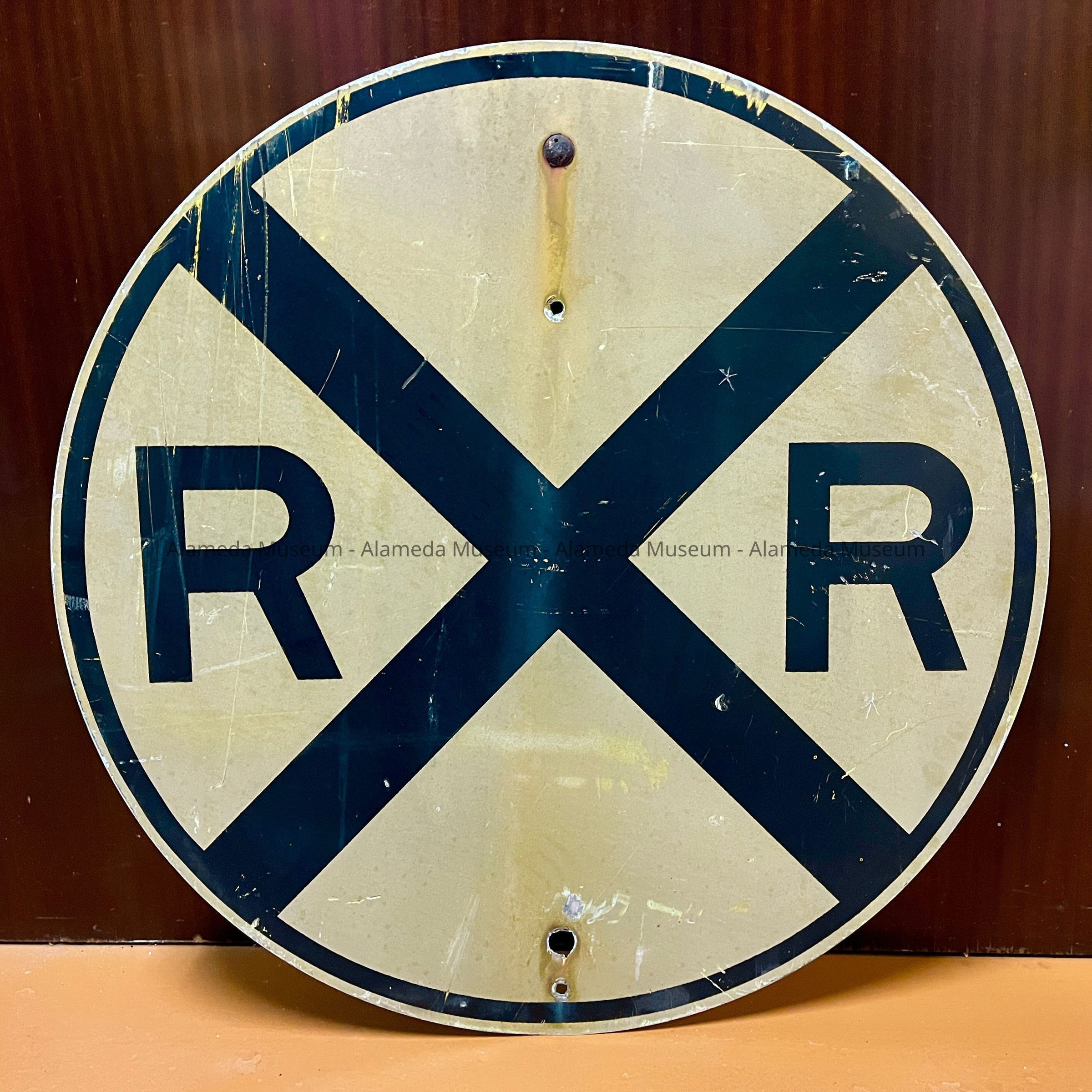 History of Object: Railroad Crossing warning sign that served to warn traffic of the railroad tracks of the Alameda Belt Line. Exact location where this sign was posted is not known, but it is thought to have come from the recent works done to remove the old rails from Blanding Ave. - possibly from Broadway.