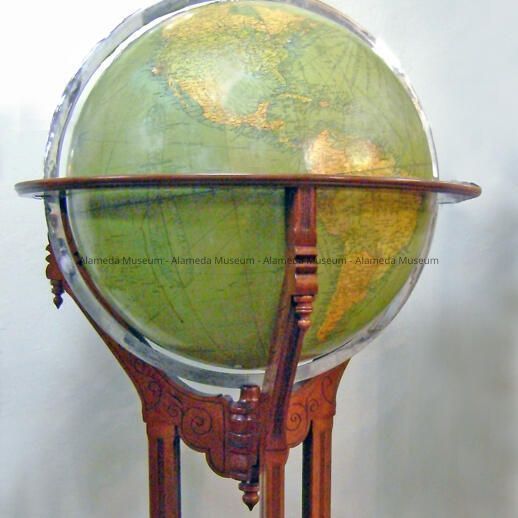 History of Object: This world globe was used in the west wing of City Hall from 1897-1903, when the Alameda Free Library occupied the site. It is also known to appear in the architect's rendering of Alameda Free Library at its present site at Santa Clara and Oak.