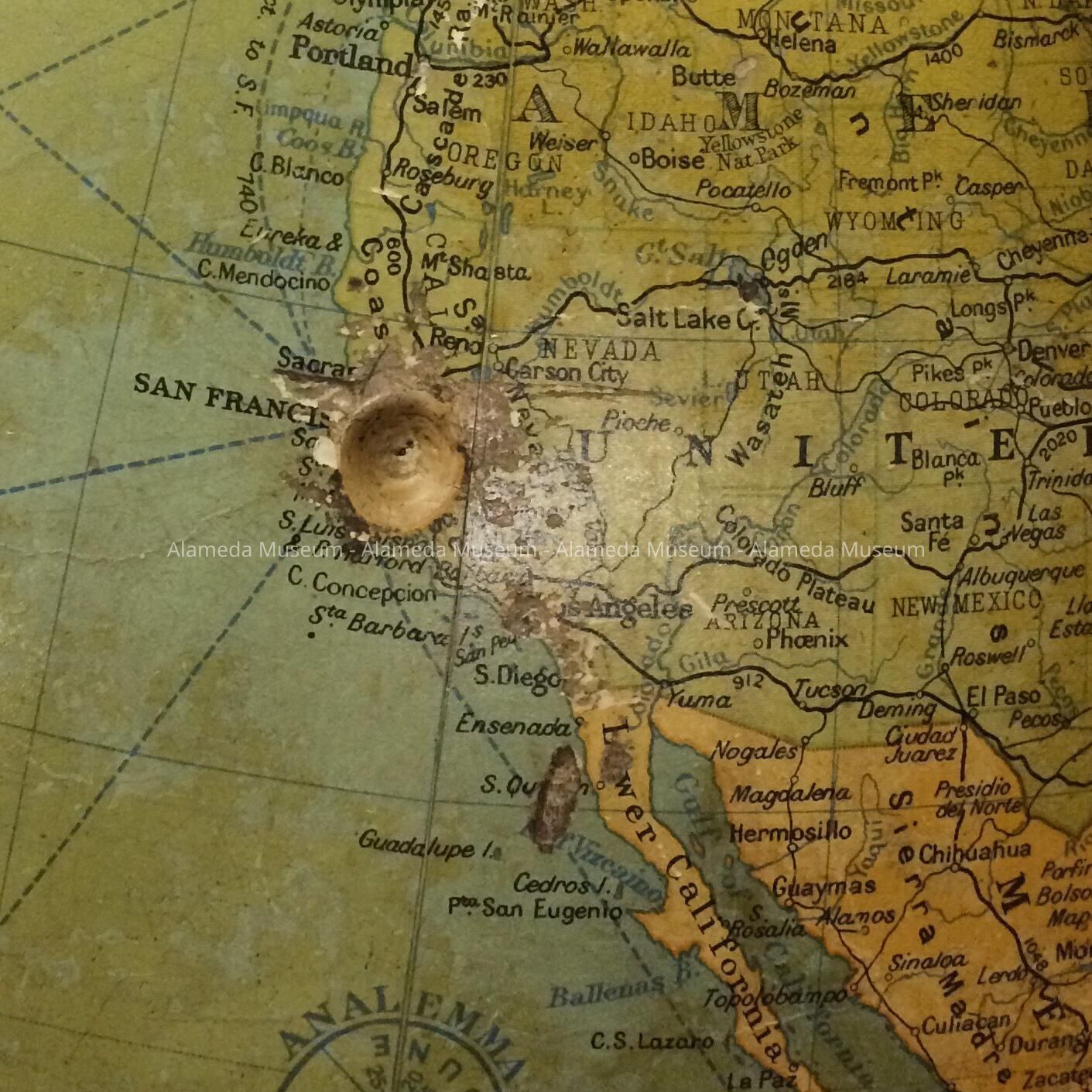 This globe has been recovered and the maps updated at least once, most recently some time between the two World Wars. It was displayed in the library until it was deemed obsolete and given to this museum. At the time, the Alameda Museum was located in the basement of the library. The Carnegie was our home from 1951 until 1981.