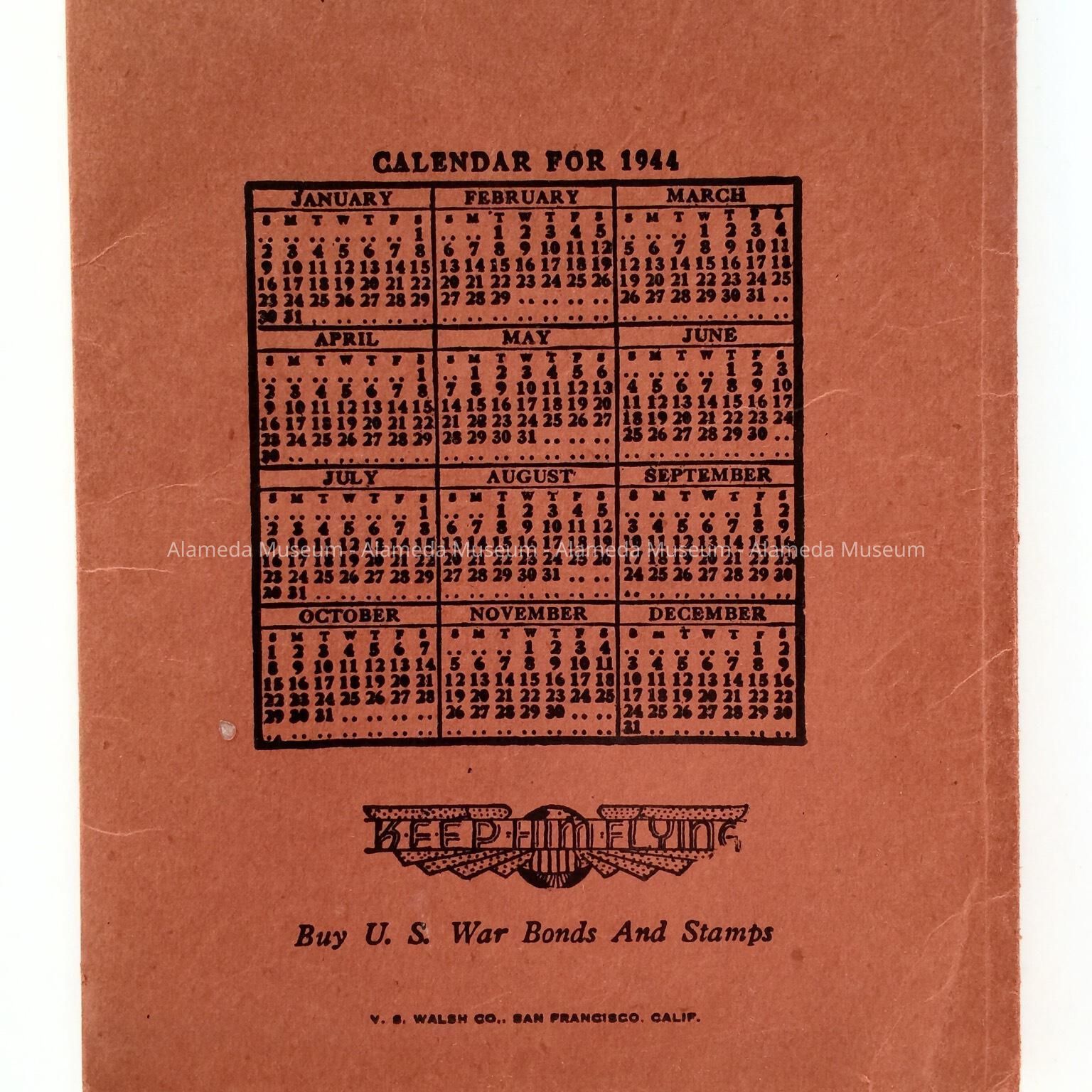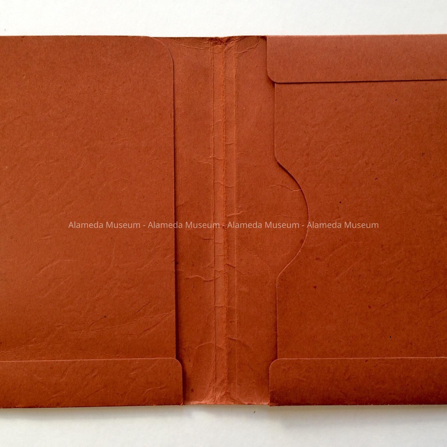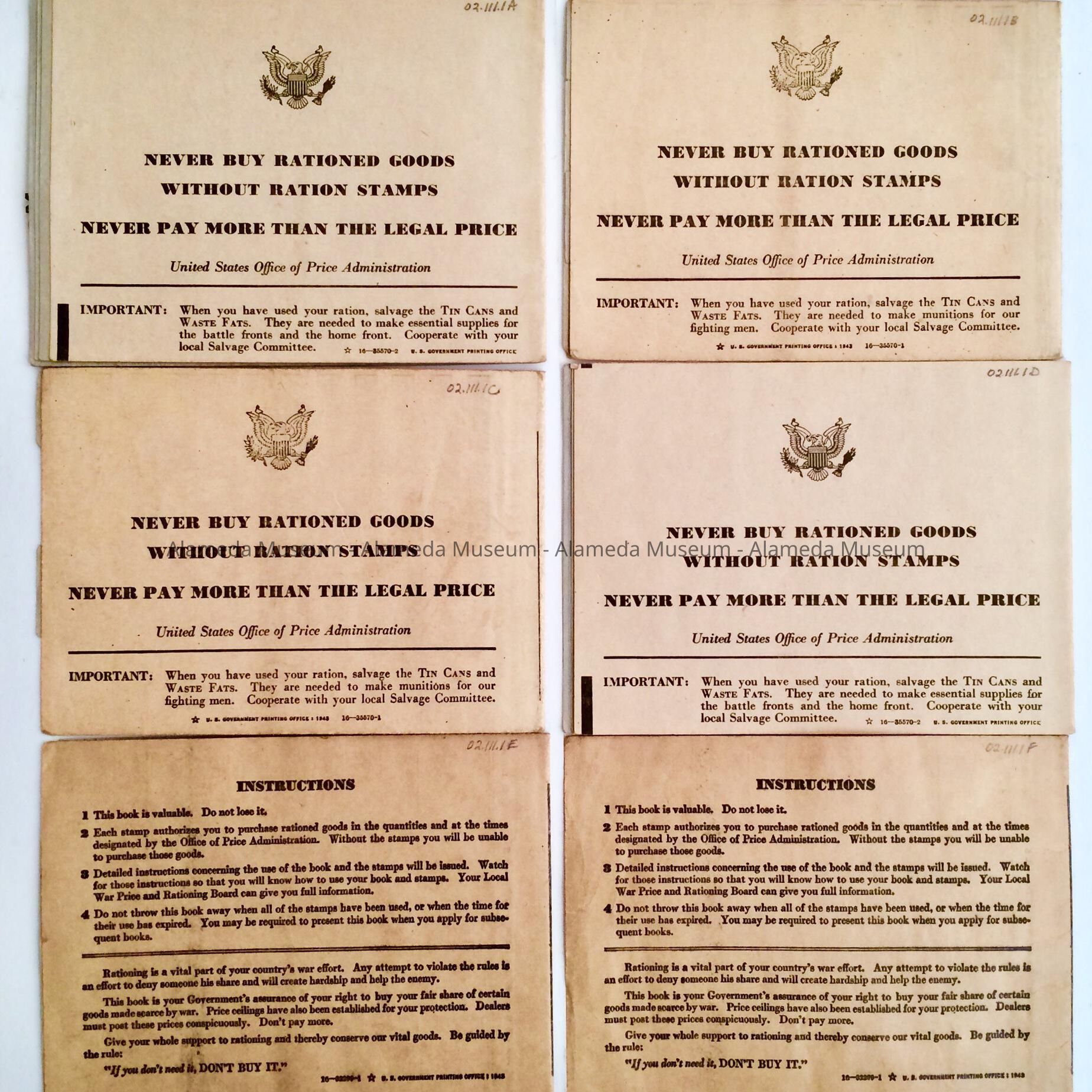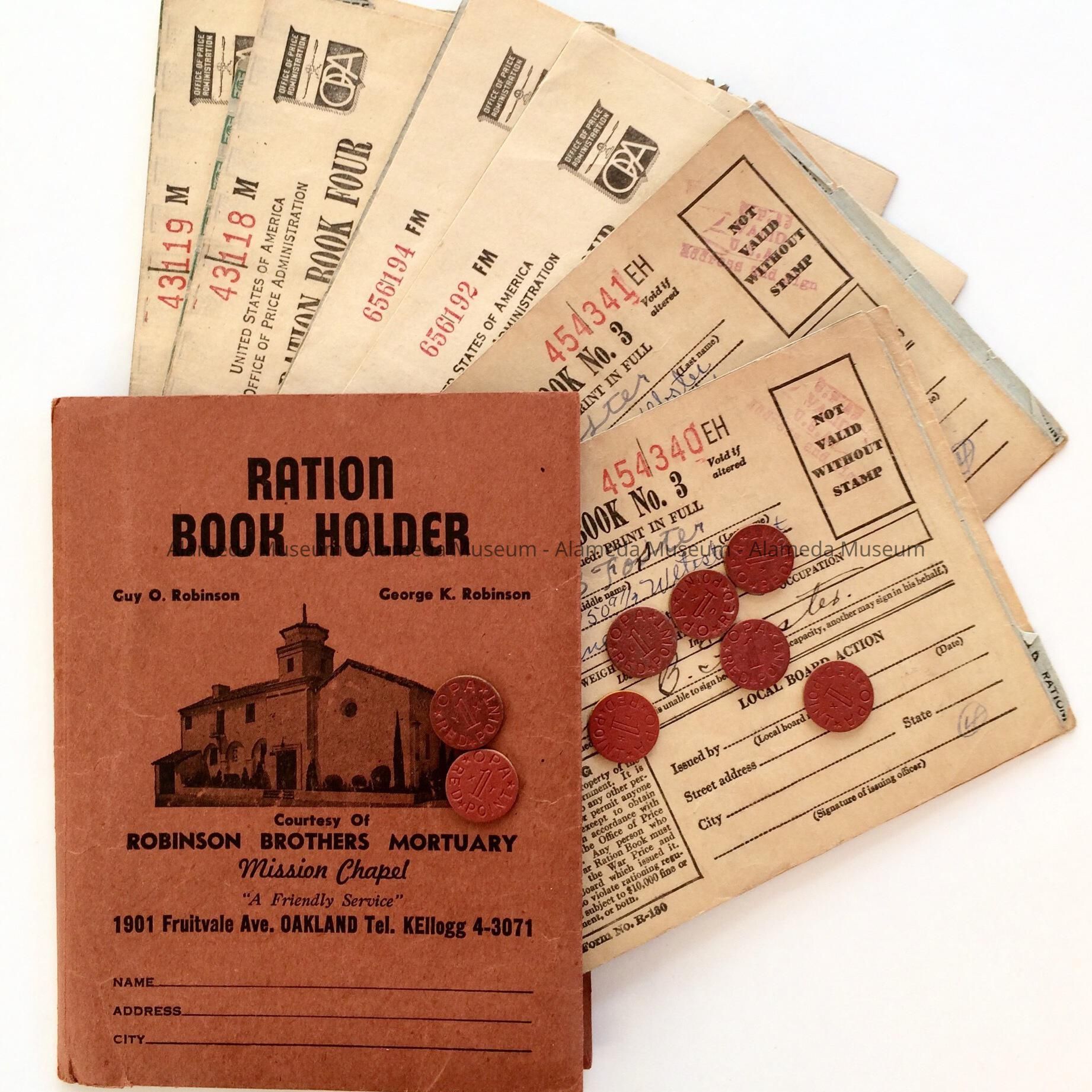 COVERLET, WITH CAPTION, "RATION BOOK HOLDER," AND ILLUSTRATED WITH A PHOTOLITHOGRAPHIC VIEW OF THE ROBINSON BROS. MORTUARY, OAK LAND, ON A BROWN-COLORED BACKGROUND. INTERIOR HAS POCKETS CONTAINING SIX RATION BOOKS. RATION BOOK COVERS HAVE INFORMATION BLANKS THAT HAVE BEEN FILLED OUT BY HAND IN BLUE-COLORED INK.