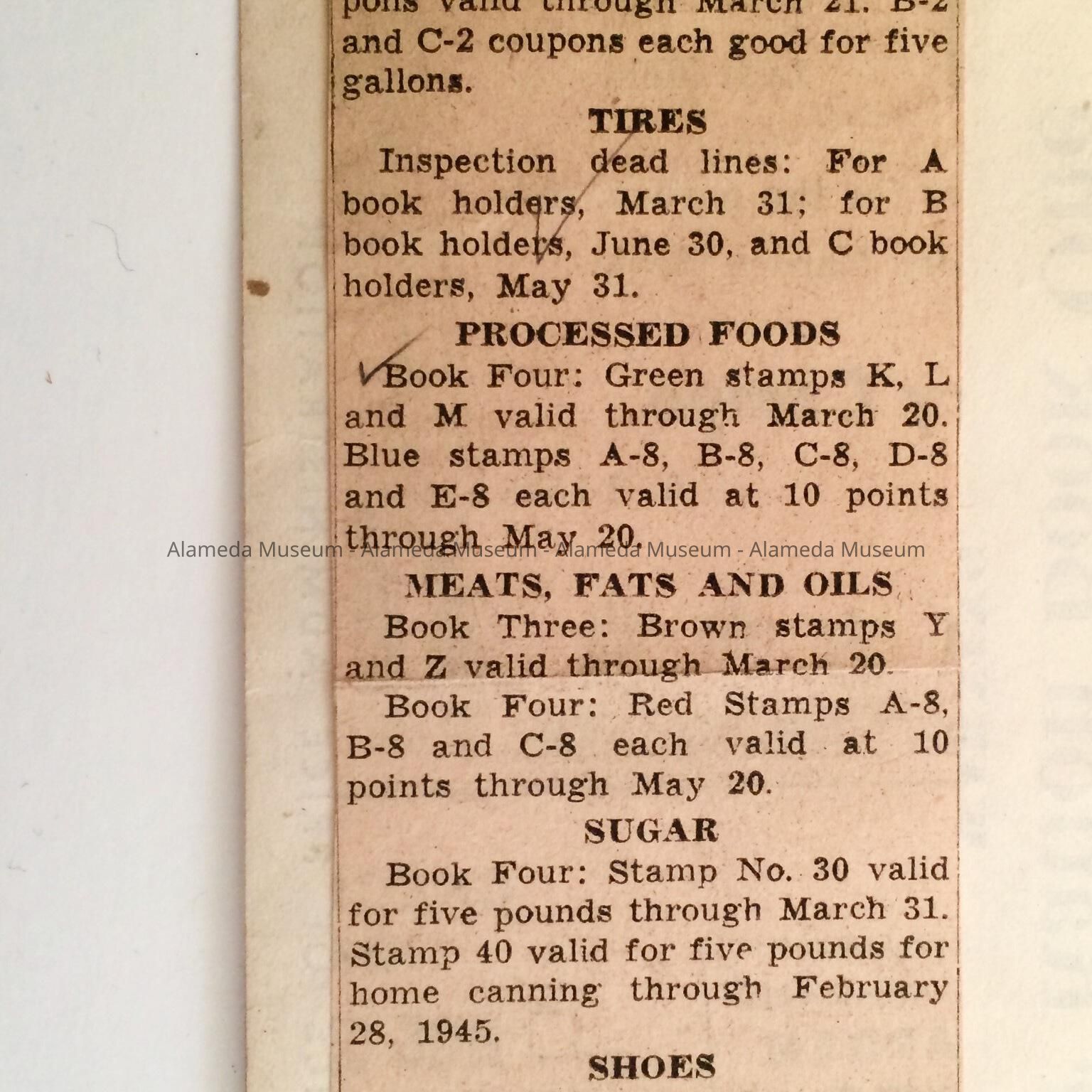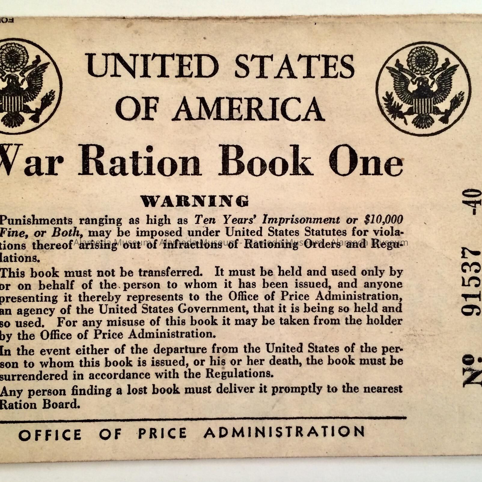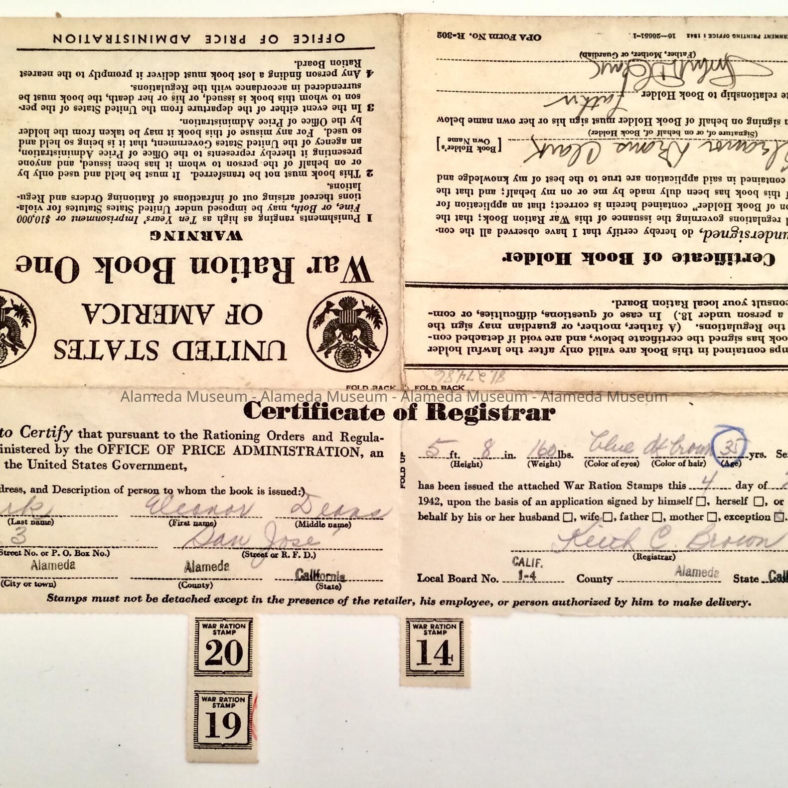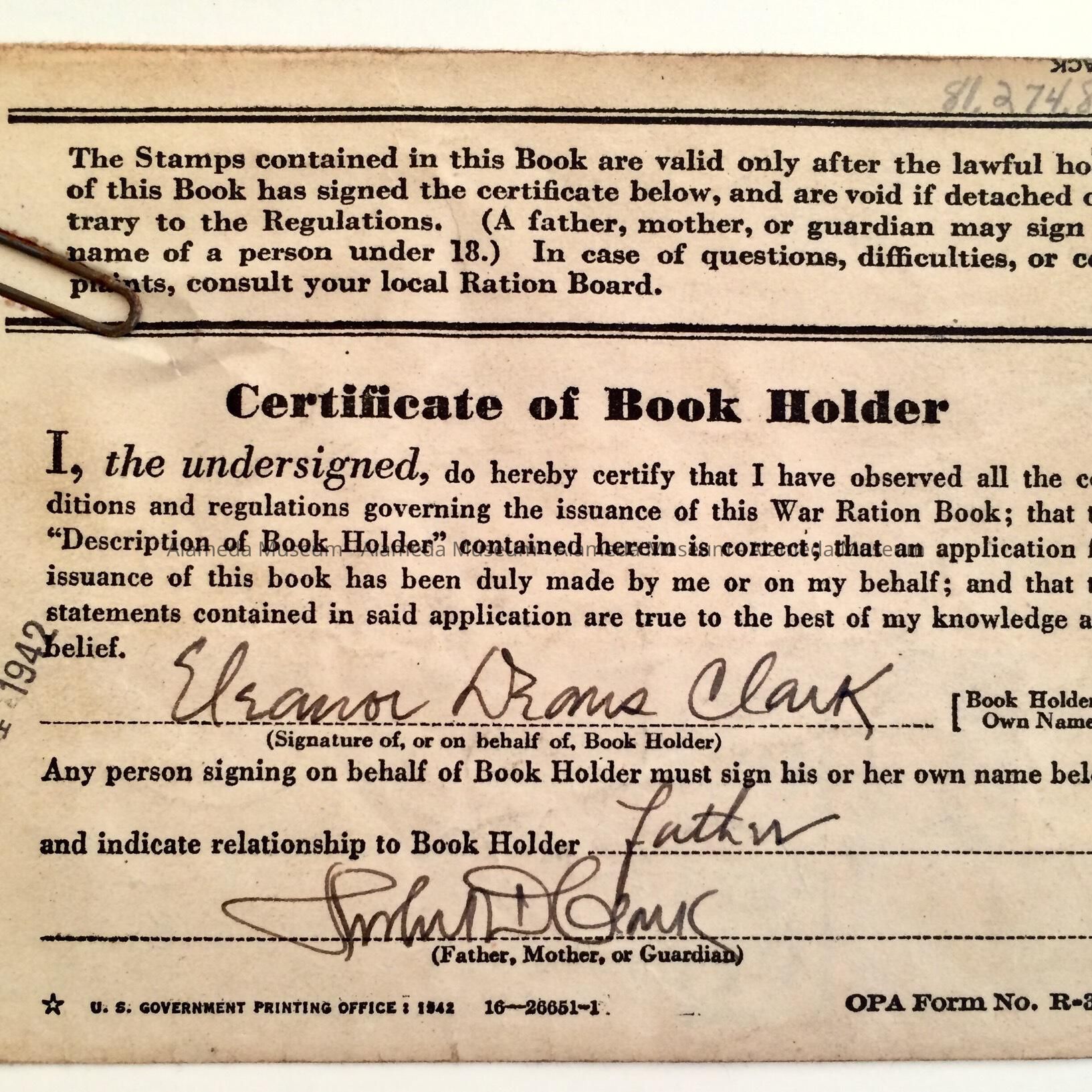 History of Object: Ration book issued in Alameda to Eleanor D. Clark in May, 1942.
