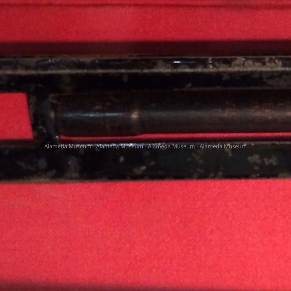 DESCRIPTION: A HORIZONTAL METAL PART OF UNKNOWN USE. THE CENTRAL SECTION INCLUDES A REVOLVING SLIDE. THE METAL PARTS HAVE JAPANNED FINISHES.