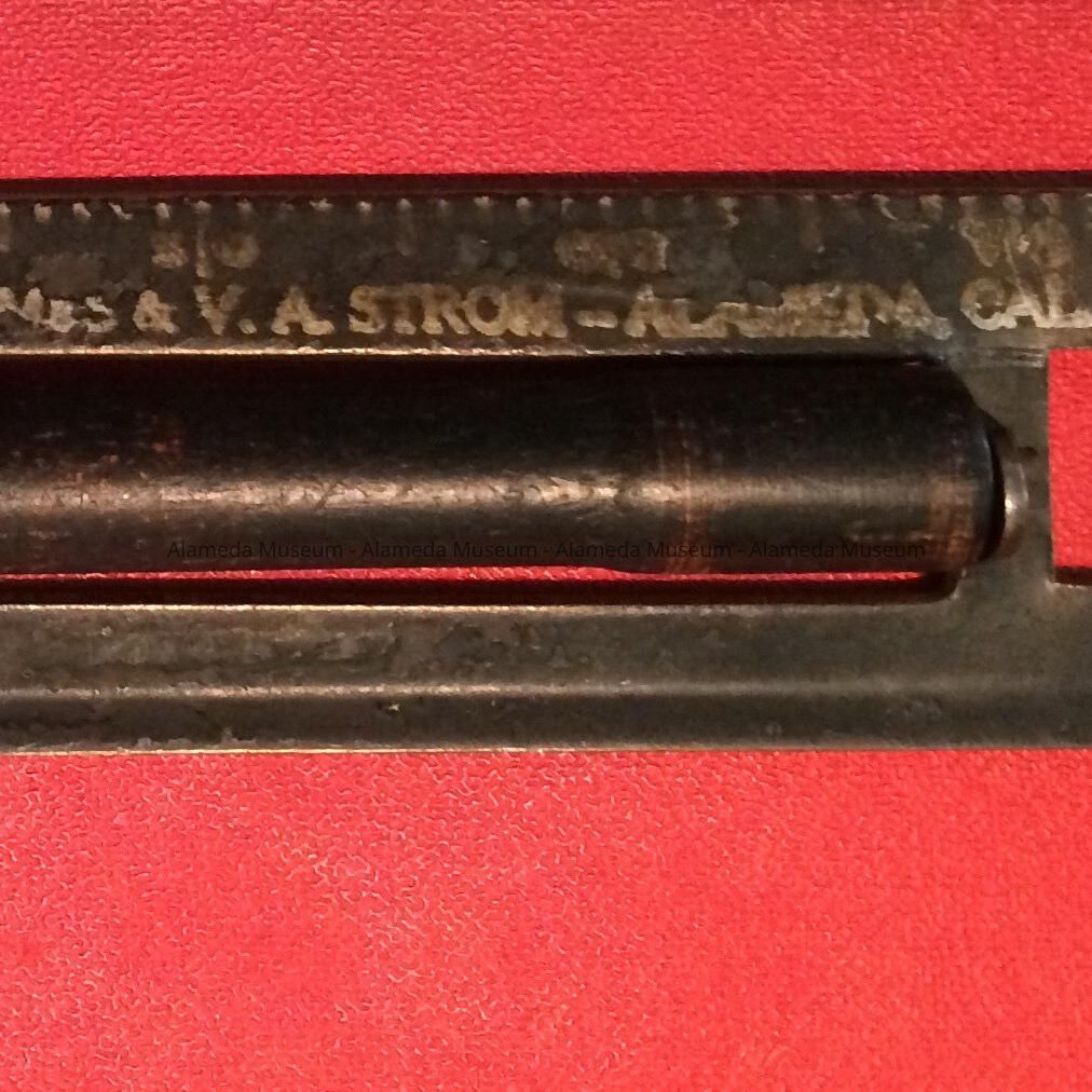 HISTORY OF OBJECT: A METAL PART FROM AN UNKNOWN MACHINE, ETC., WITH A CAPTION APPLIED TO THE METAL STATING, "PAT. APPLIED FOR AND S. GROOTING GUILD, V. A. STROM, ALAMEDA, CALIFORNIA." IT IS PRESUMED THAT THE OBJECT WAS MANUFACTURED BY STROM WHOM IS LISTED IN THE 1912 CITY DIRECTORY AS VICTOR A. STROM, PRESIDENT, GLOBE DREDGING CO., RESIDENT OF 866 WALNUT STREET, ALAMEDA.