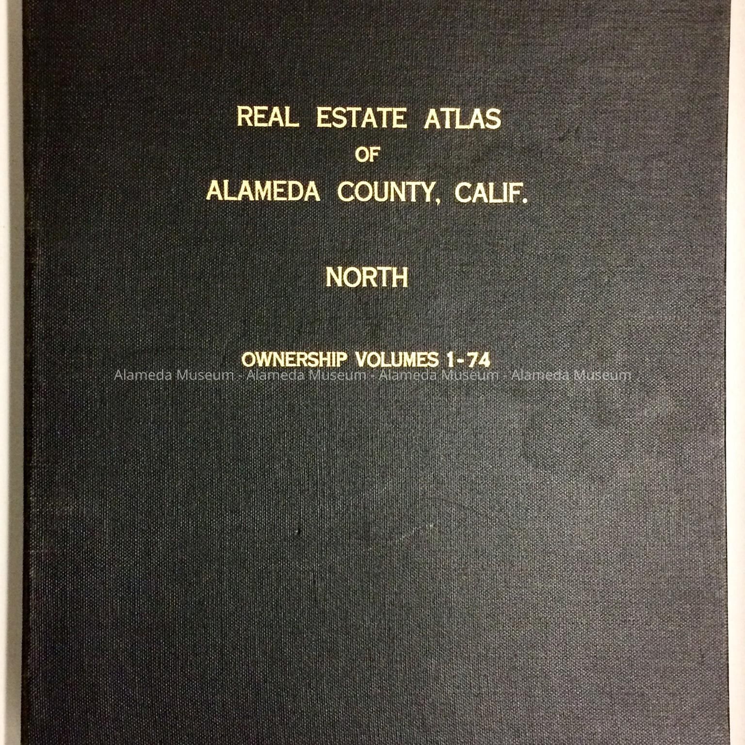 A LOOSE-LEAF BINDER, WITH COVER OF BLACK-COLORED BUCKRAM. COVER HAS AN INCISED CAPTION, "REAL ESTATE ATLAS OF ALAMEDA COUNTY, CALIF., NORTH OWNERSHIP VOLUME 1-74."