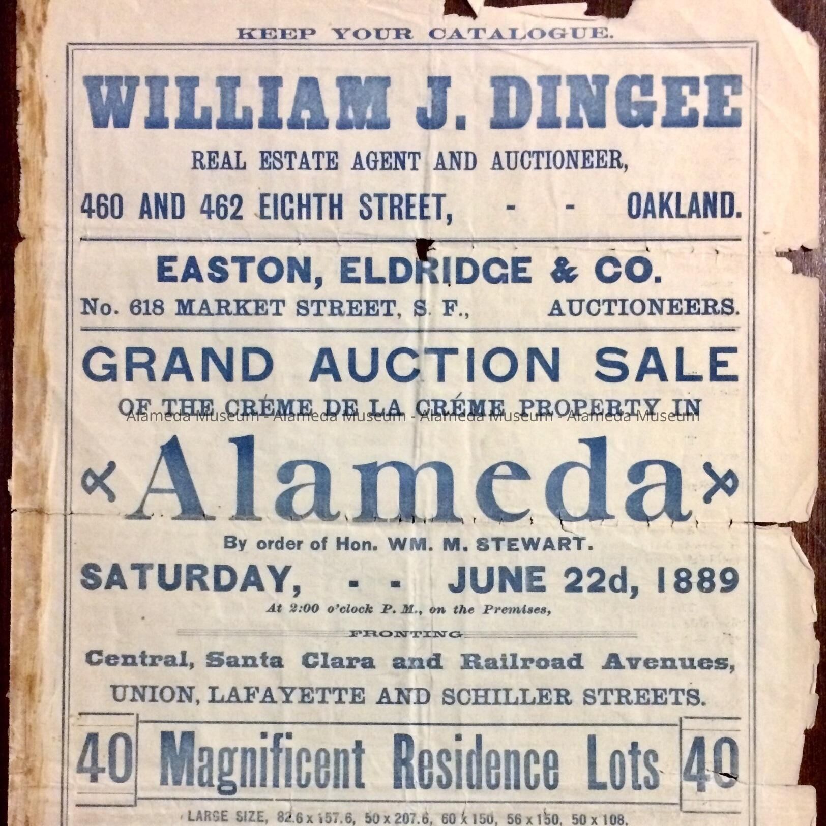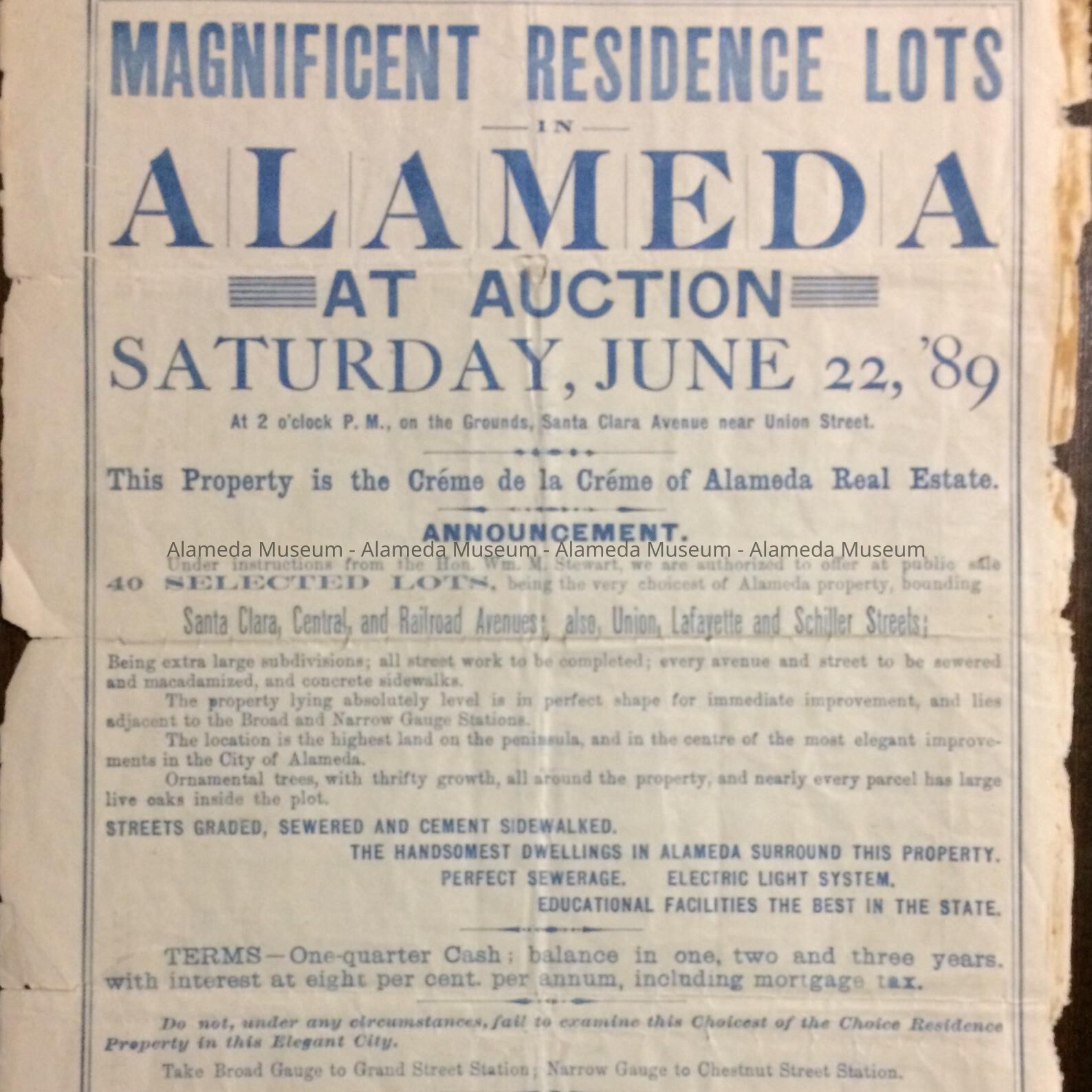 Two copies of a two-page real estate flyer with bold-printed caption, "Grand Auction Sale, Alameda" in blue-colored type on an off white-colored background.