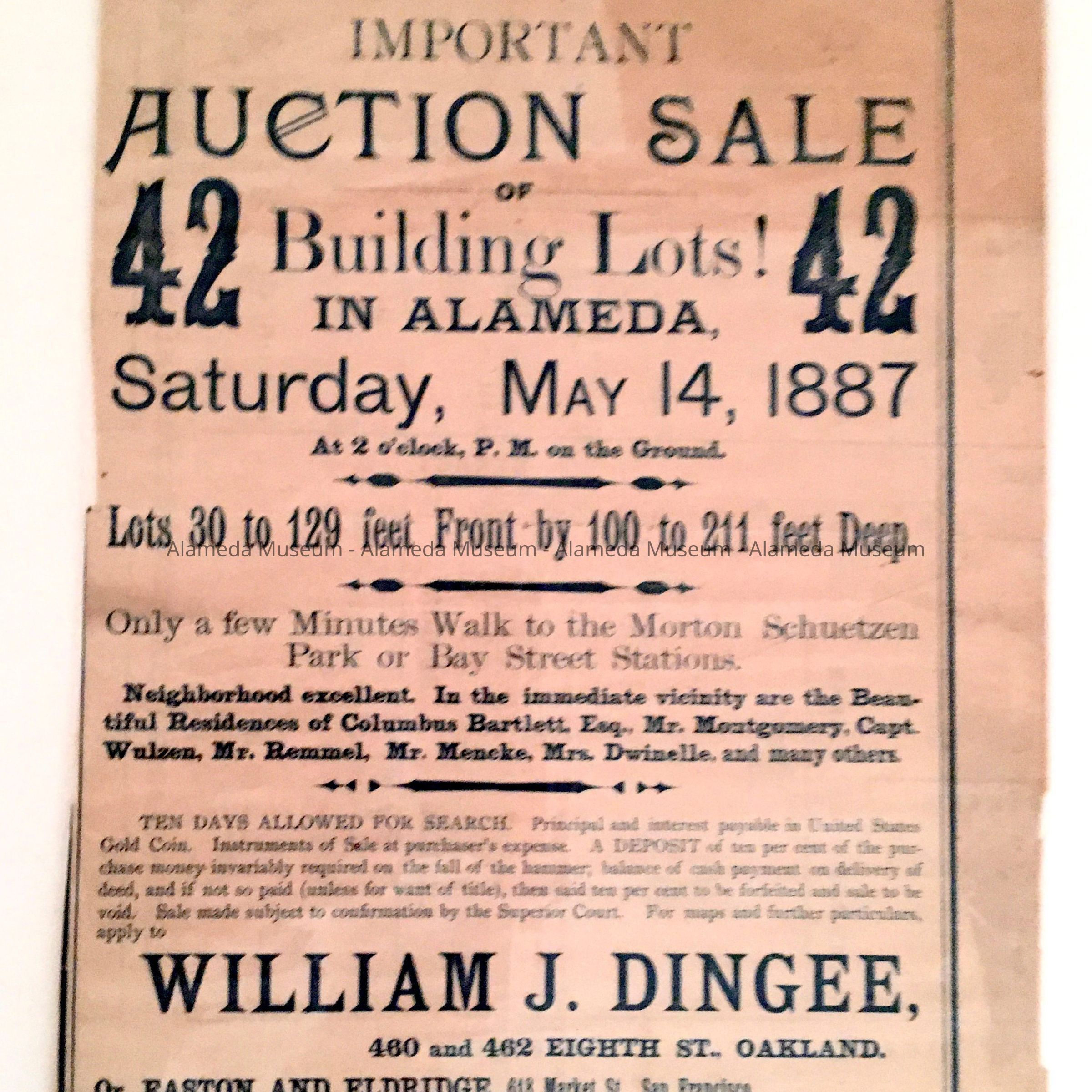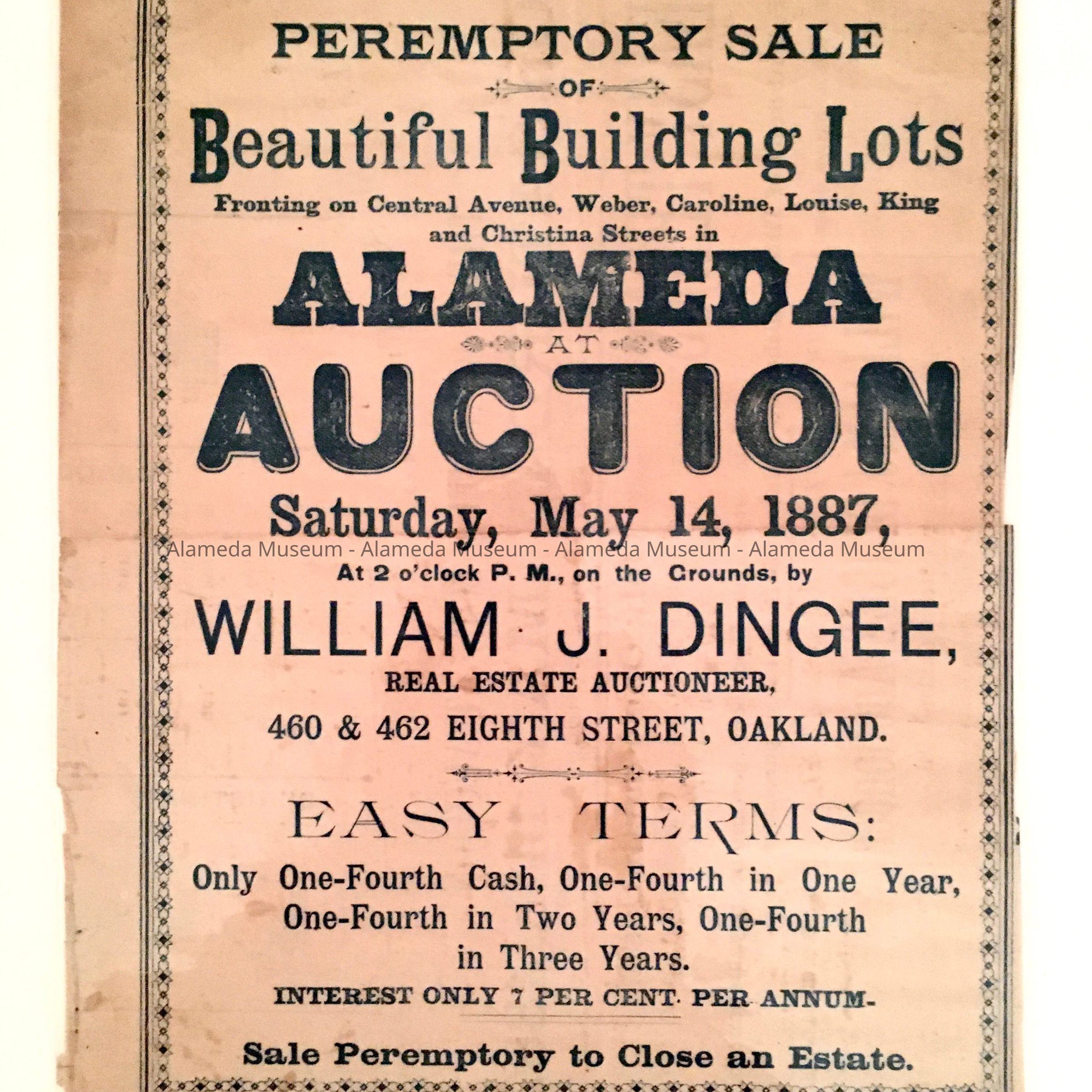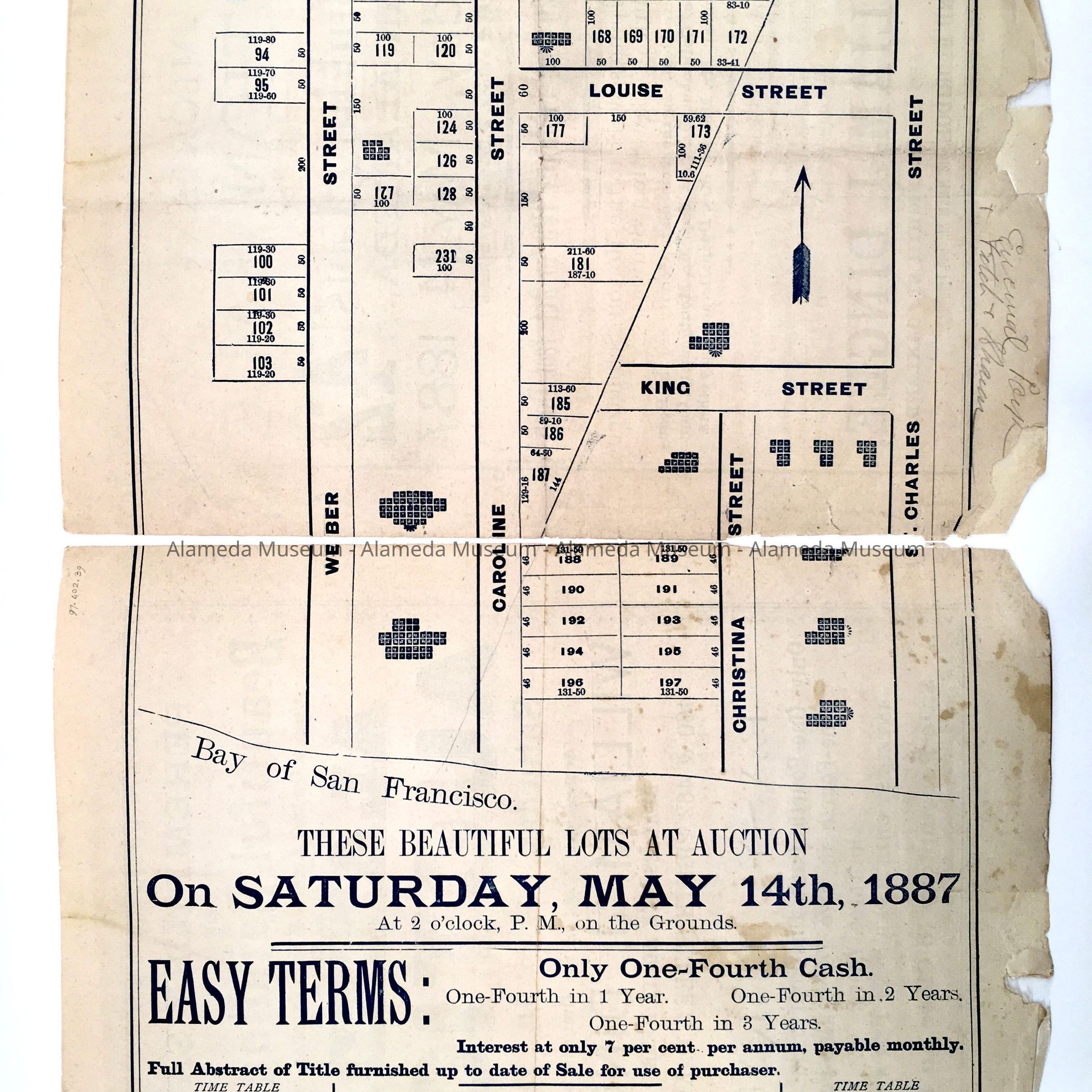 Two-page, four-sided flyer with bold-printed caption, “Peremptory Sale of Beautiful Building Lots Fronting on Central Avenue, Weber, Caroline, Louise, King and Christina Streets in Alameda at Auction” in blue-colored type on an off-white colored background. On reverse, 'Auction Sale of 42 Building Lots'. Flyer in poor condition and plasticized on outside, now in 2 sections.
