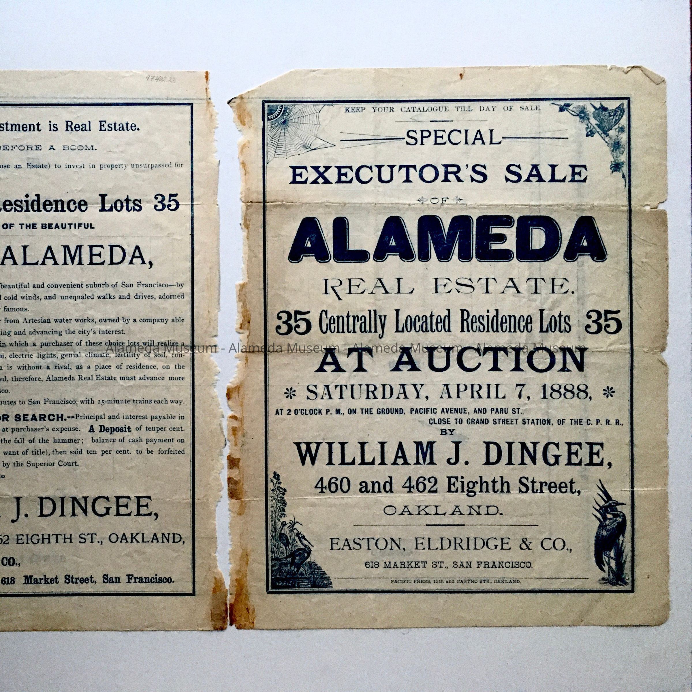 Two-page flyer. Cover has bold-printed caption, "Special Executor's Sale of Alameda Real Estate" in blue-colored type on an off white-colored background. Interior contains map.